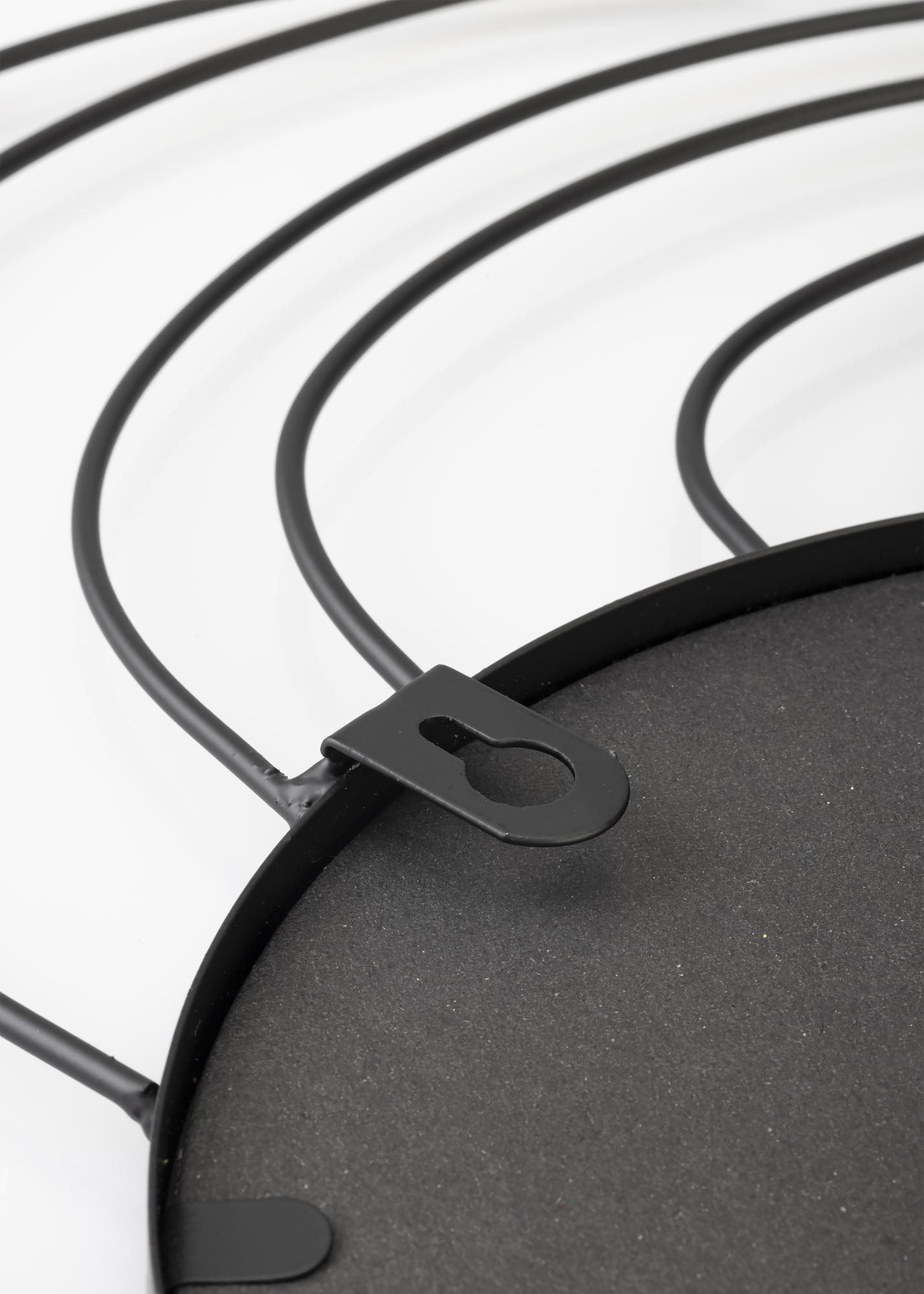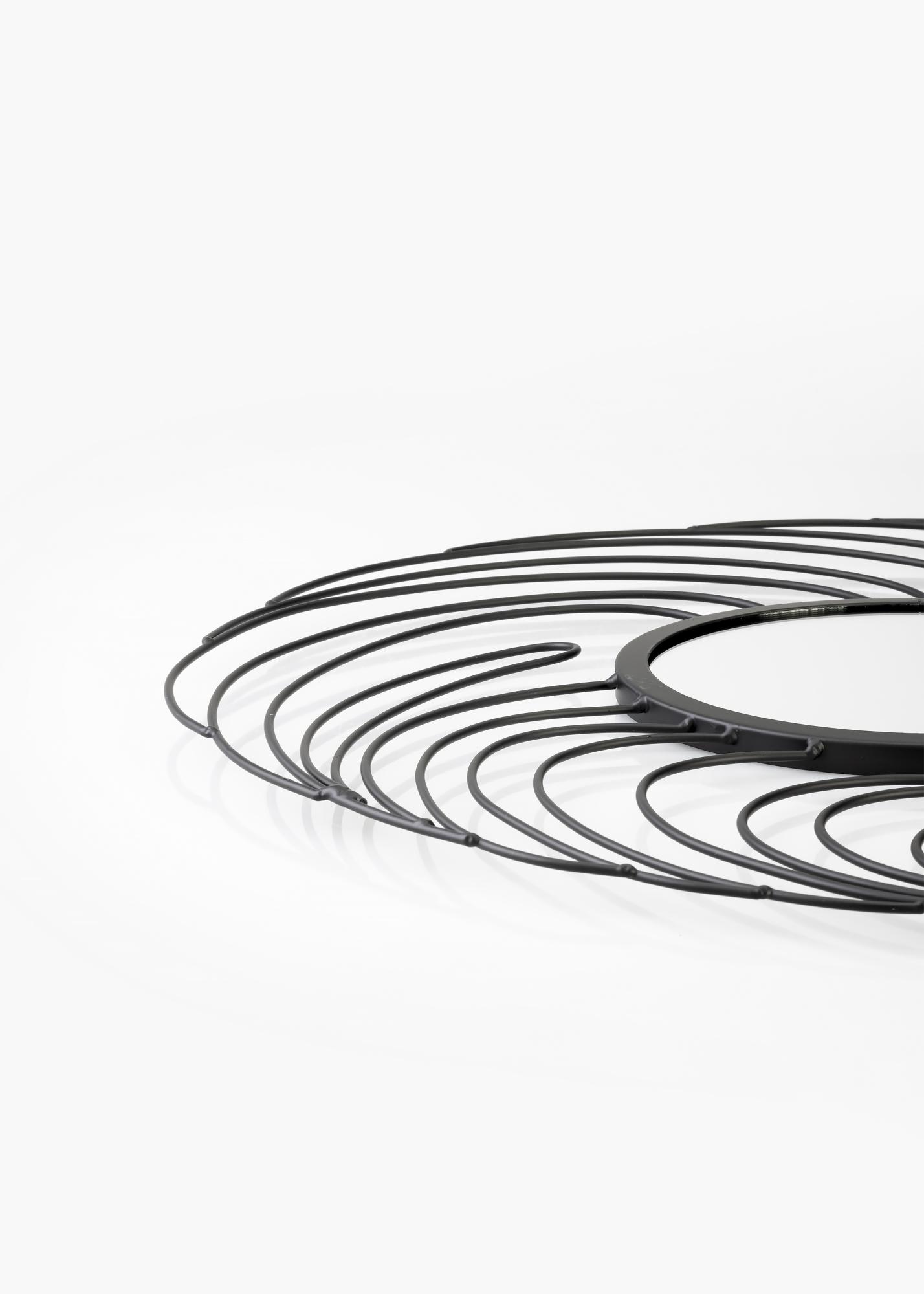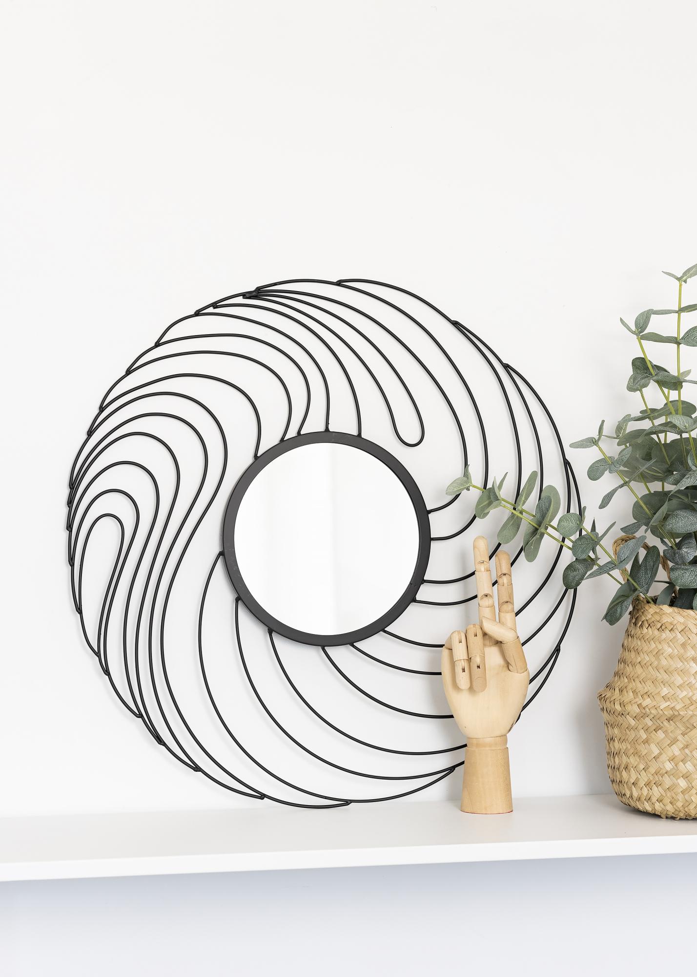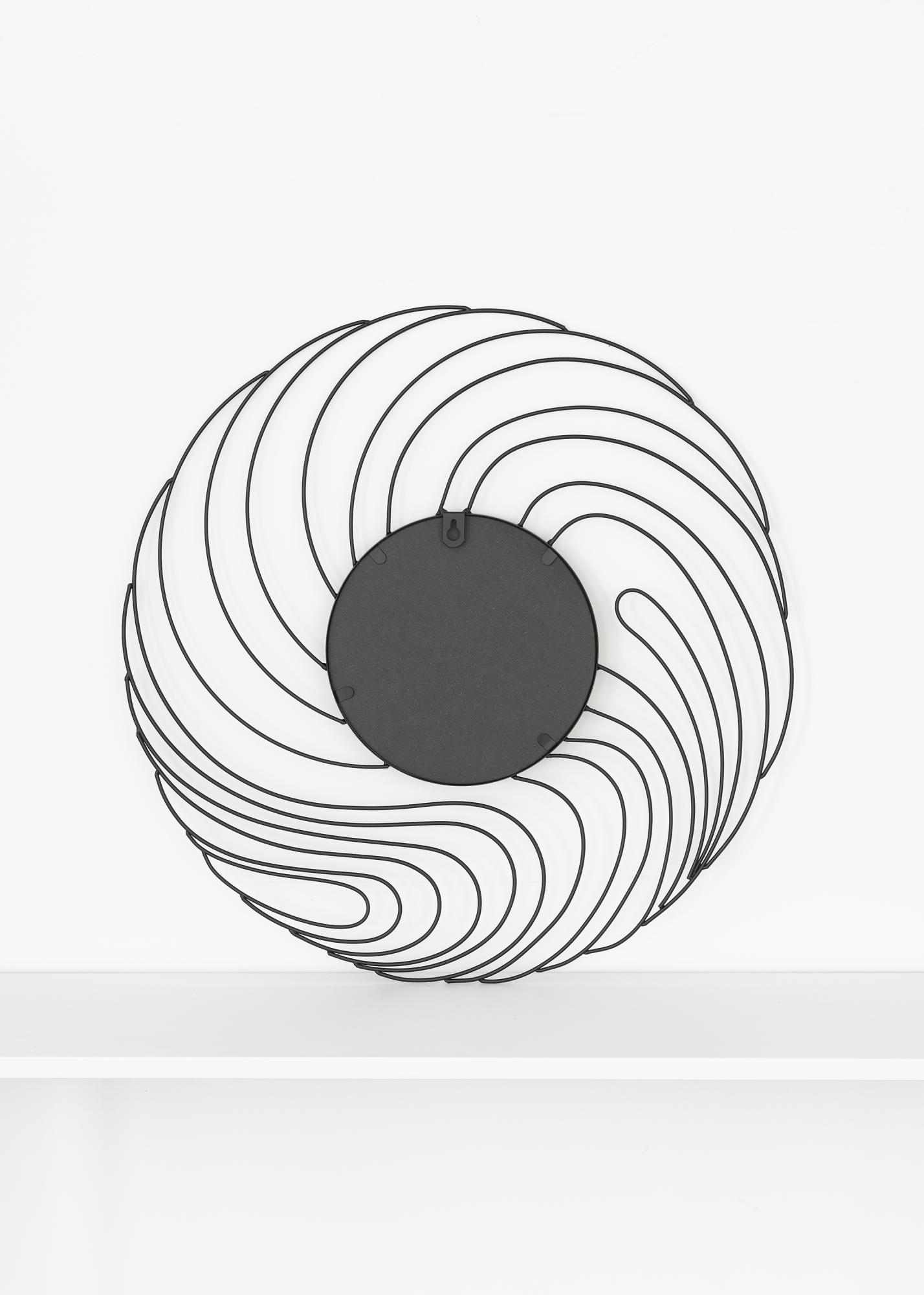 Storm es un espejo de pared con un diseño único y genial. Este espejo está hecho de metal y tiene un diámetro de 50 cm. Su pequeña superficie está rodeada por un llamativo patrón negro giratorio. Este espejo tiene vidrio espejo incoloro y viene con fijaciones de pared.