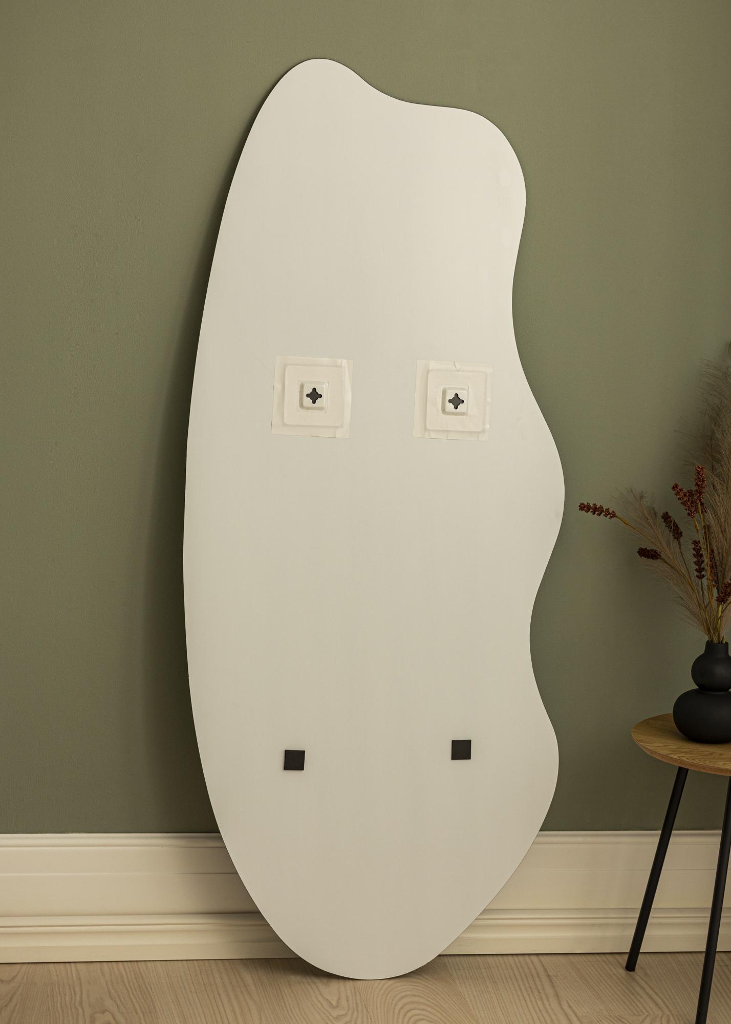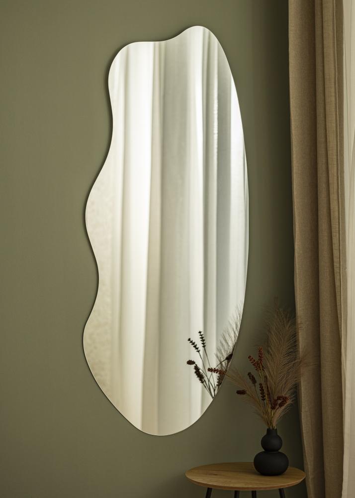 Un espejo de pared asimétrico se convierte en un llamativo detalle decorativo en cualquier hogar. Este espejo tiene una forma única, donde un lado largo es redondeado y el otro tiene una forma ondulada. Juntos forman una totalidad emocionante y elegante. El espejo es adecuado tanto para el recibidor como para la sala de estar, y funciona como un espejo de baño moderno.