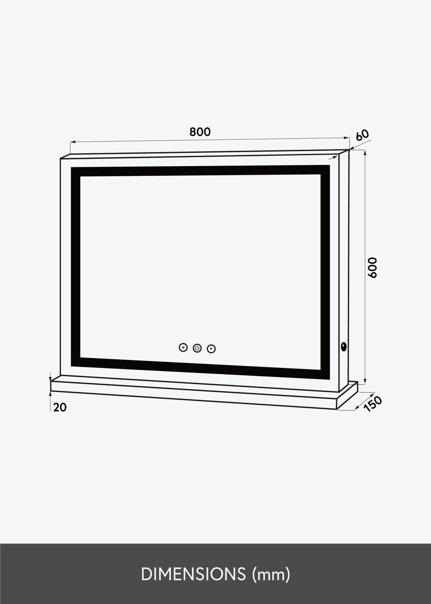 El espejo tiene una agradable luz en 3000K-6000K, y puedes encender fácilmente la iluminación con el botón táctil integrado en el frente del espejo. También hay botones táctiles para ajustar el brillo y la temperatura de color, donde el botón "P" cambia el brillo y el botón "M" ajusta la temperatura de color. La conexión eléctrica se realiza mediante un enchufe.