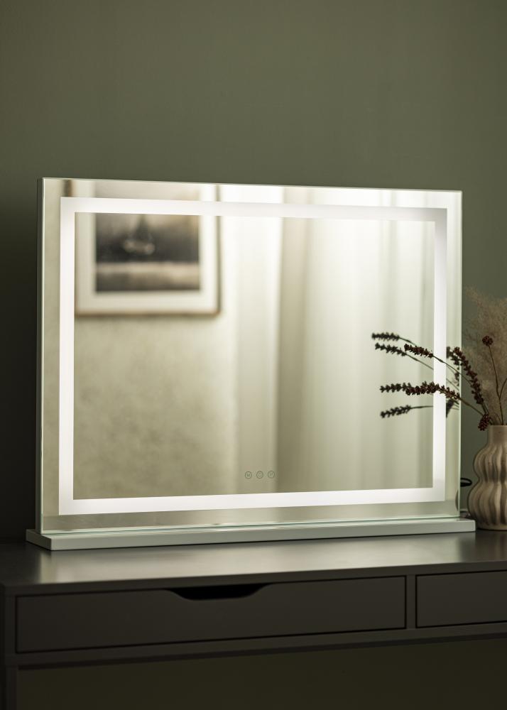 ¡Con este espejo para tocador, tu rincón para tocador puede volverse más lujoso en un instante! El diseño elegante, con una forma rectangular con iluminación LED que enmarca la superficie del espejo de 80x60 cm, hace que este espejo se adapte bien a cualquier habitación. El espejo se puede montar en la pared o colocar en posición horizontal sobre una mesa. Esto hace que este espejo sea perfecto para aquellos que no deseasn perforar agujeros en la pared.