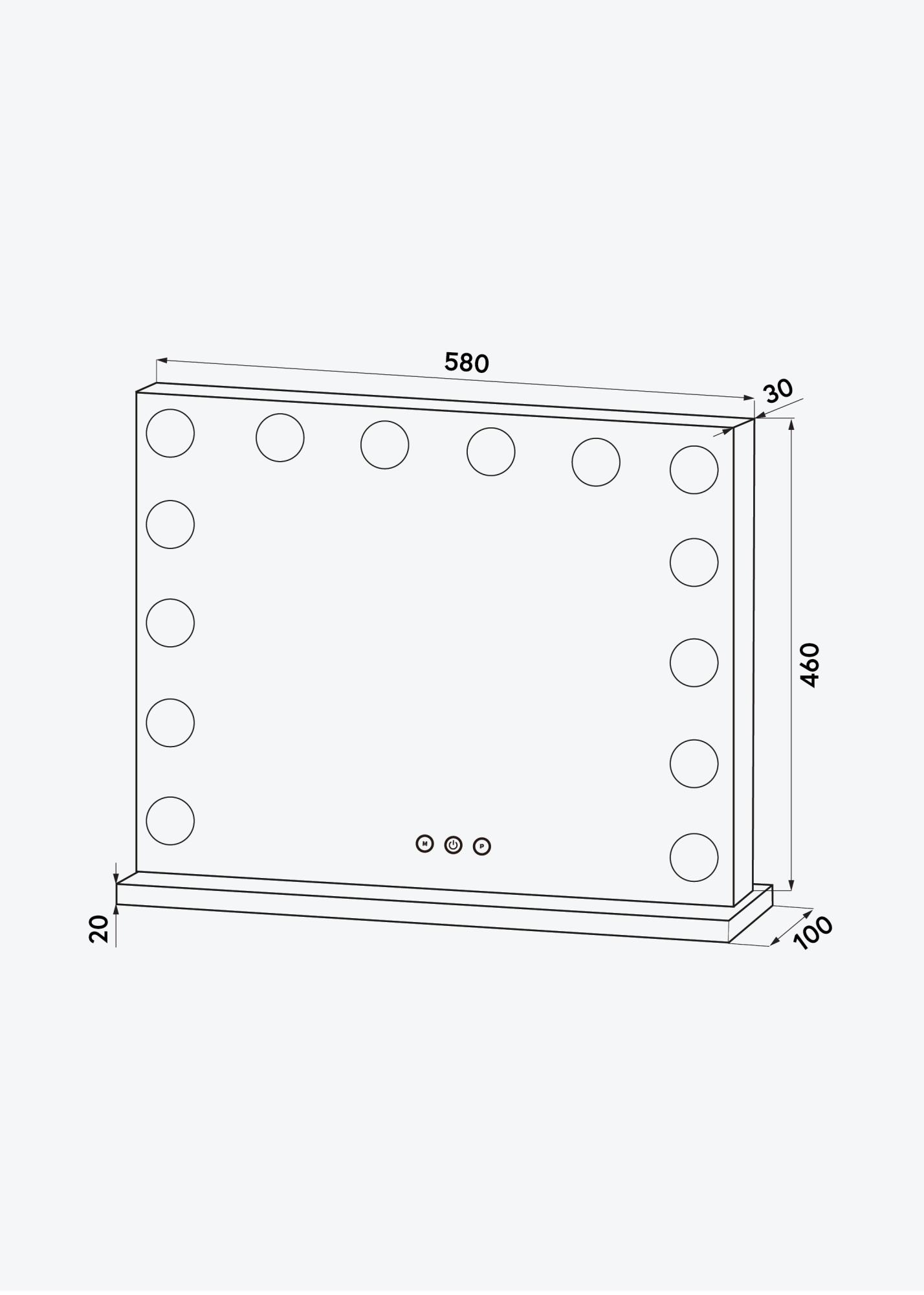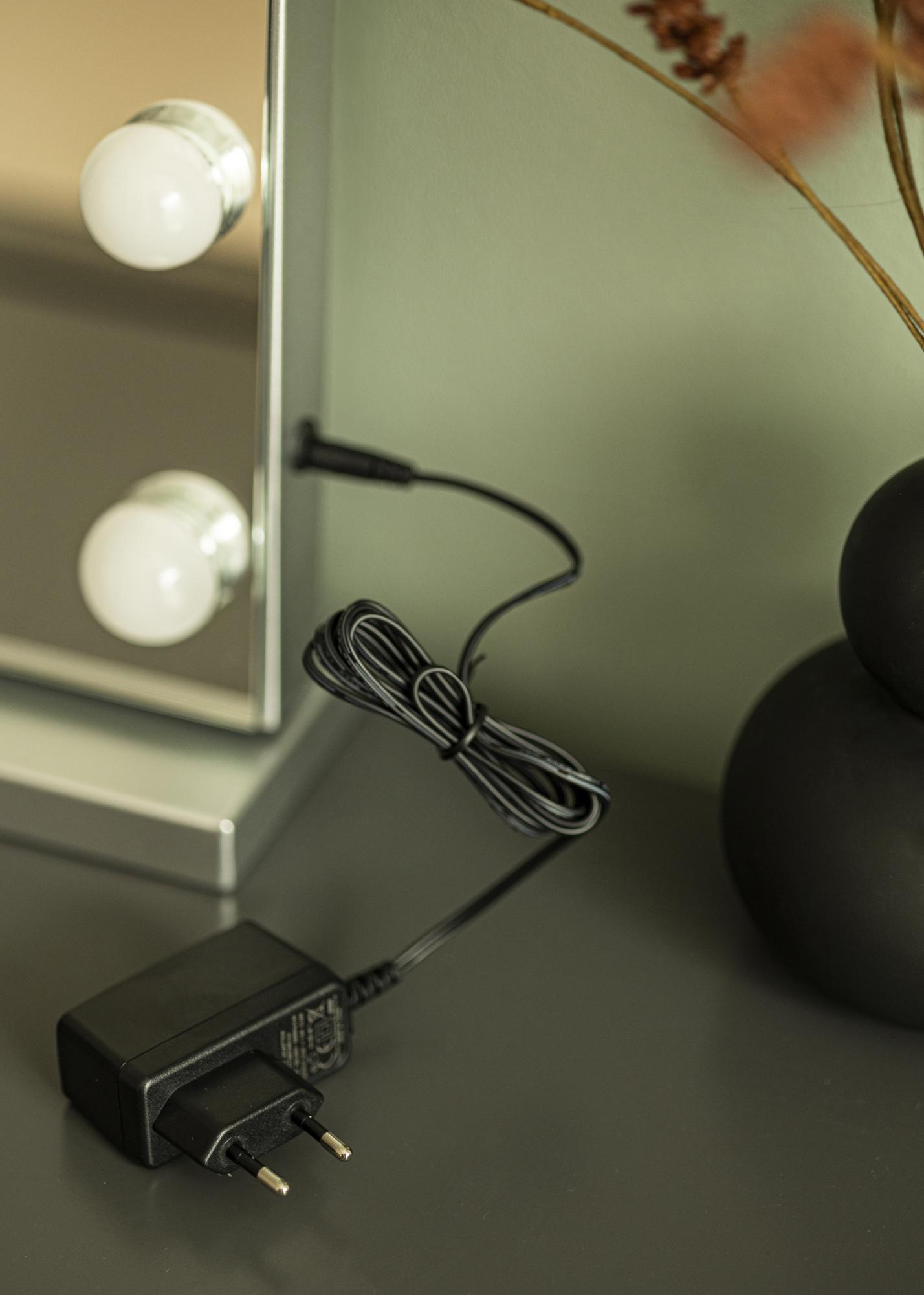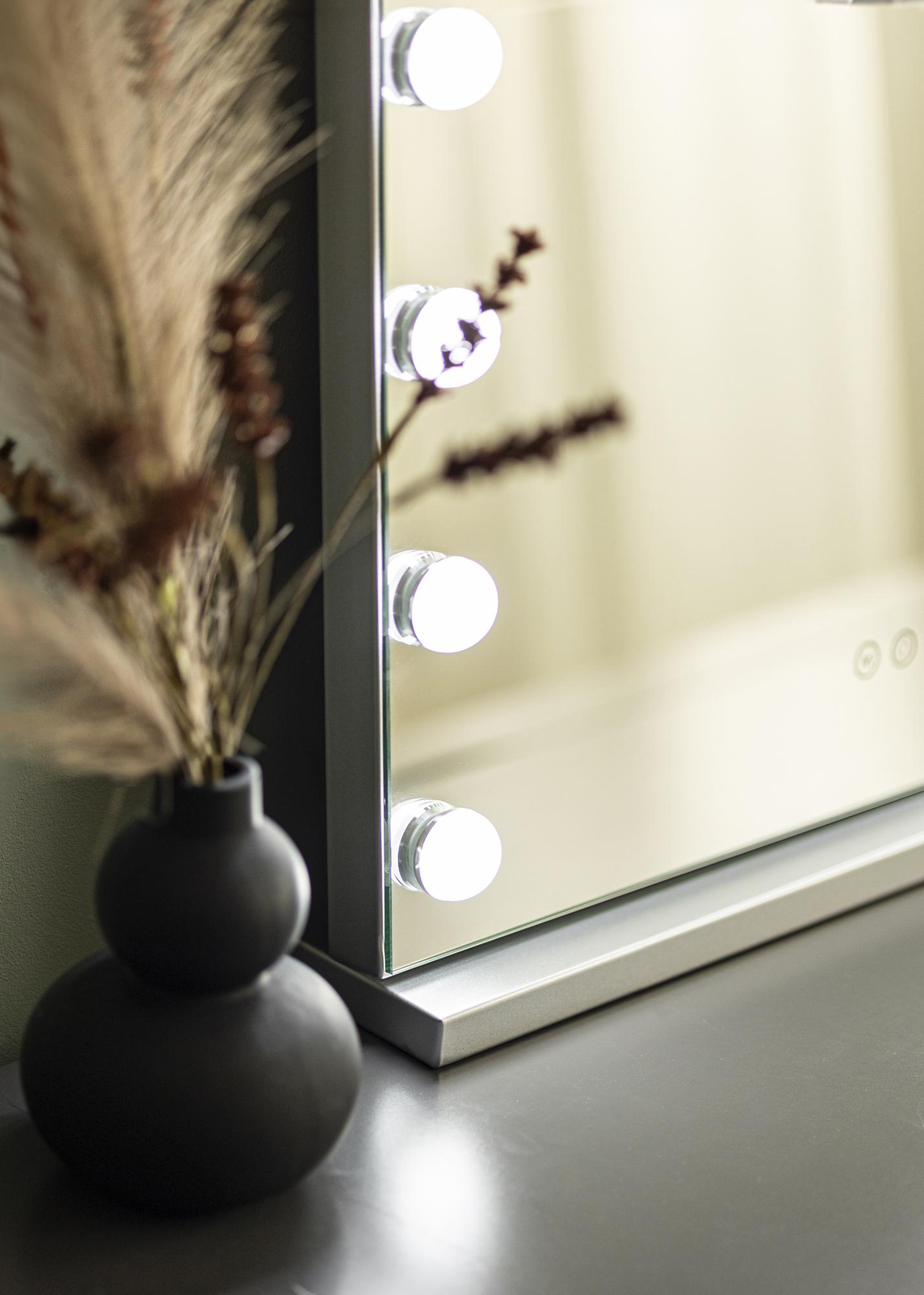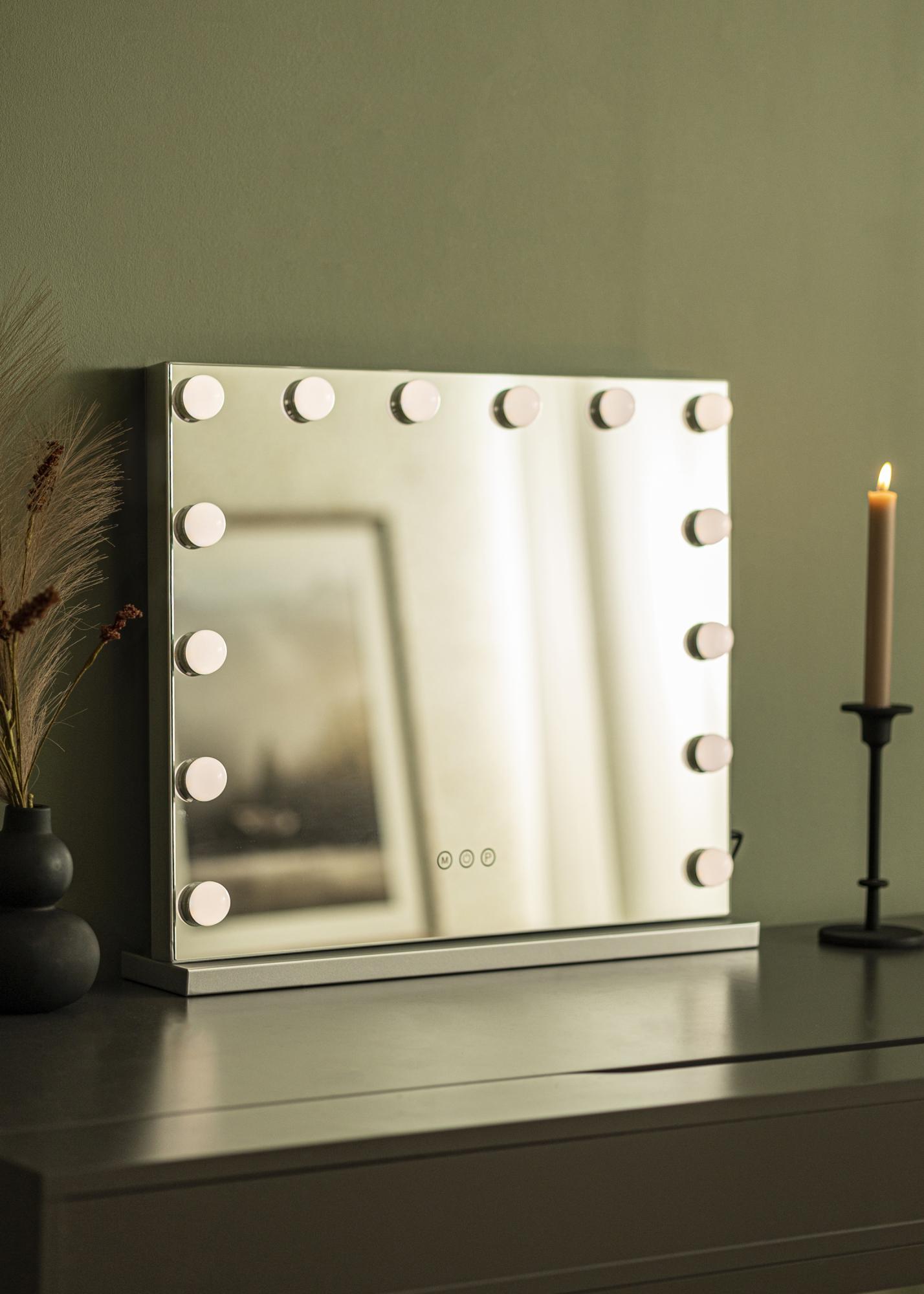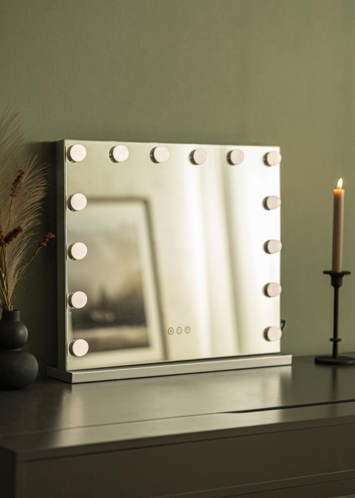 Este espejo para tocador tiene un diseño elegante, con una forma rectangular atemporal y 14 luces LED que proporcionan una buena iluminación cuando aplicas tu maquillaje. Las luces están colocadas como un marco alrededor de la superficie del espejo de 56x46 cm. La luz se puede atenuar y también puedes ajustar la temperatura de color que desees. Para atenuar la luz, mantén presionado el botón táctil marcado con "P" y para ajustar la temperatura de color entre 3000K-6000K, mantén presionado el botón marcado con "M". El espejo también tiene un botón táctil para encender y apagar la iluminación. La conexión eléctrica se realiza mediante un enchufe.