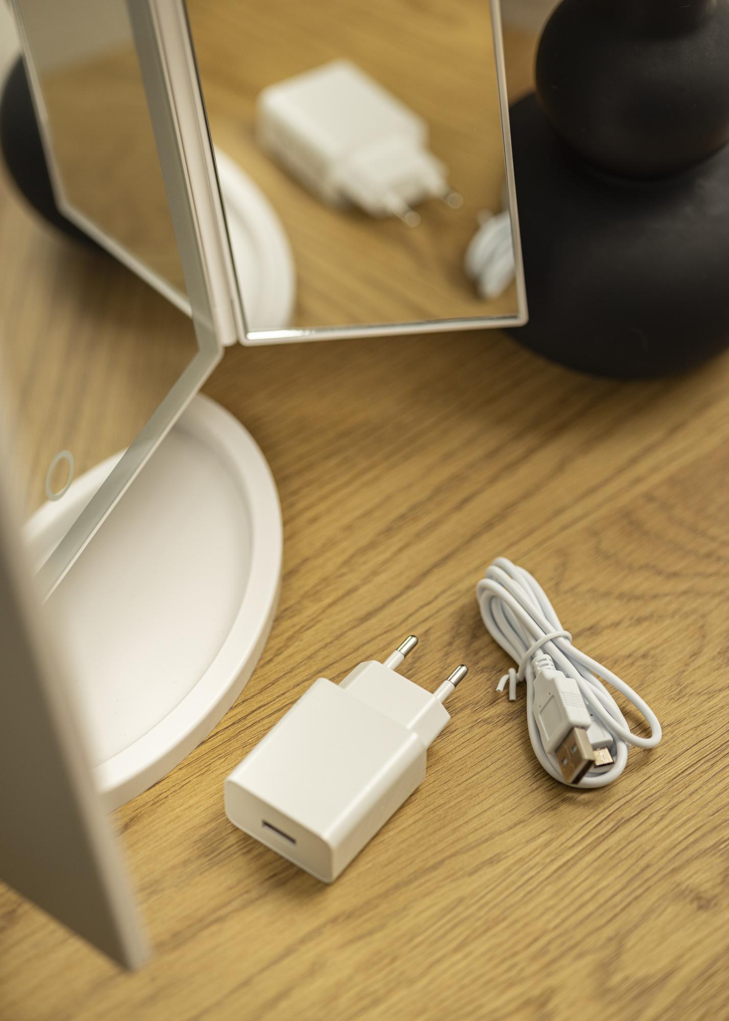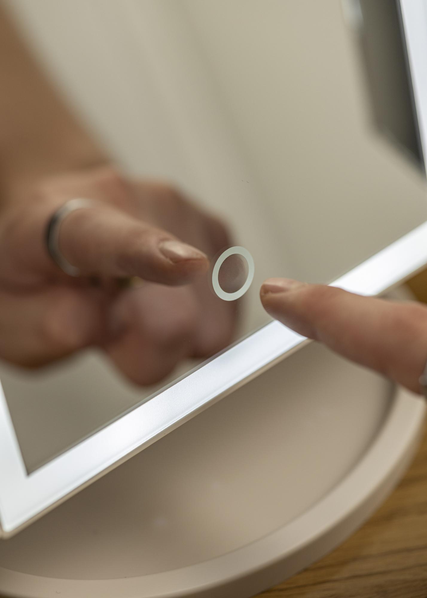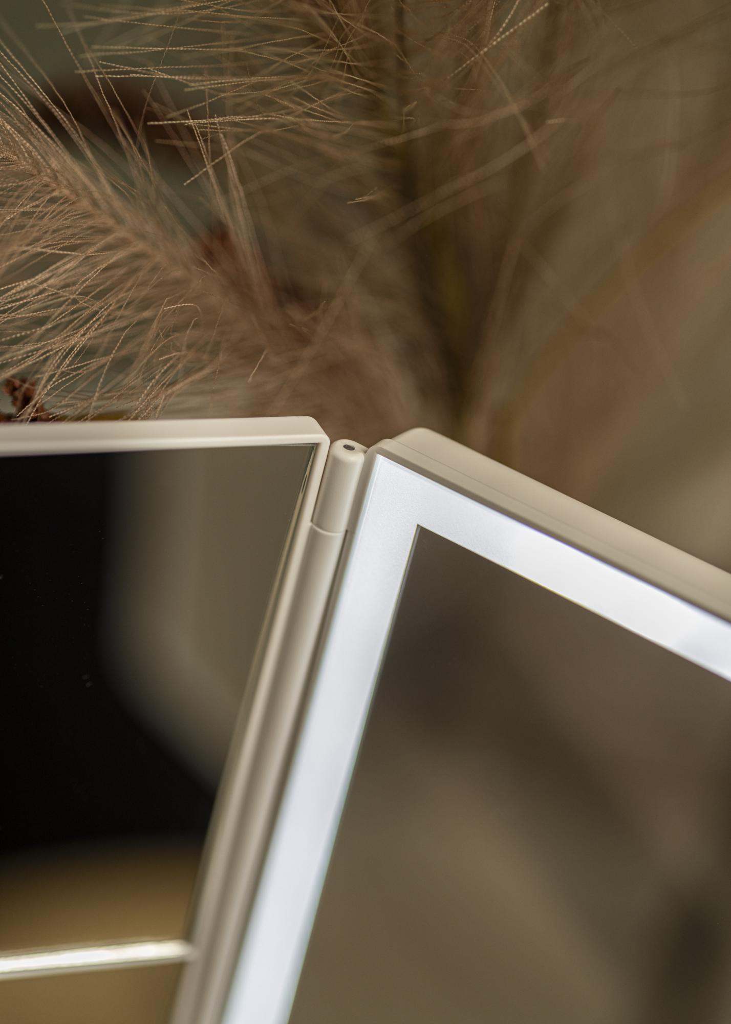 Un espejo para tocador moderno y elegante con soporte, con cuatro espejos diferentes e iluminación LED regulable. El lado izquierdo del espejo tocador tiene espejos de aumento de x2 y x3. La iluminación LED integrada enmarca elegantemente el espejo más grande en el centro y proporciona una agradable luz blanca cálida de 3000K. Puedes encender fácilmente la iluminación presionando el botón táctil en la pantalla y ajustar fácilmente la intensidad de la luz manteniendo presionado el botón durante unos segundos. El espejo mide 38x30 cm y se puede inclinar, lo que te permite reflejarte desde diferentes ángulos.
