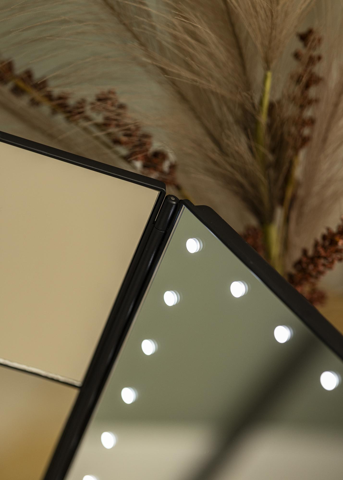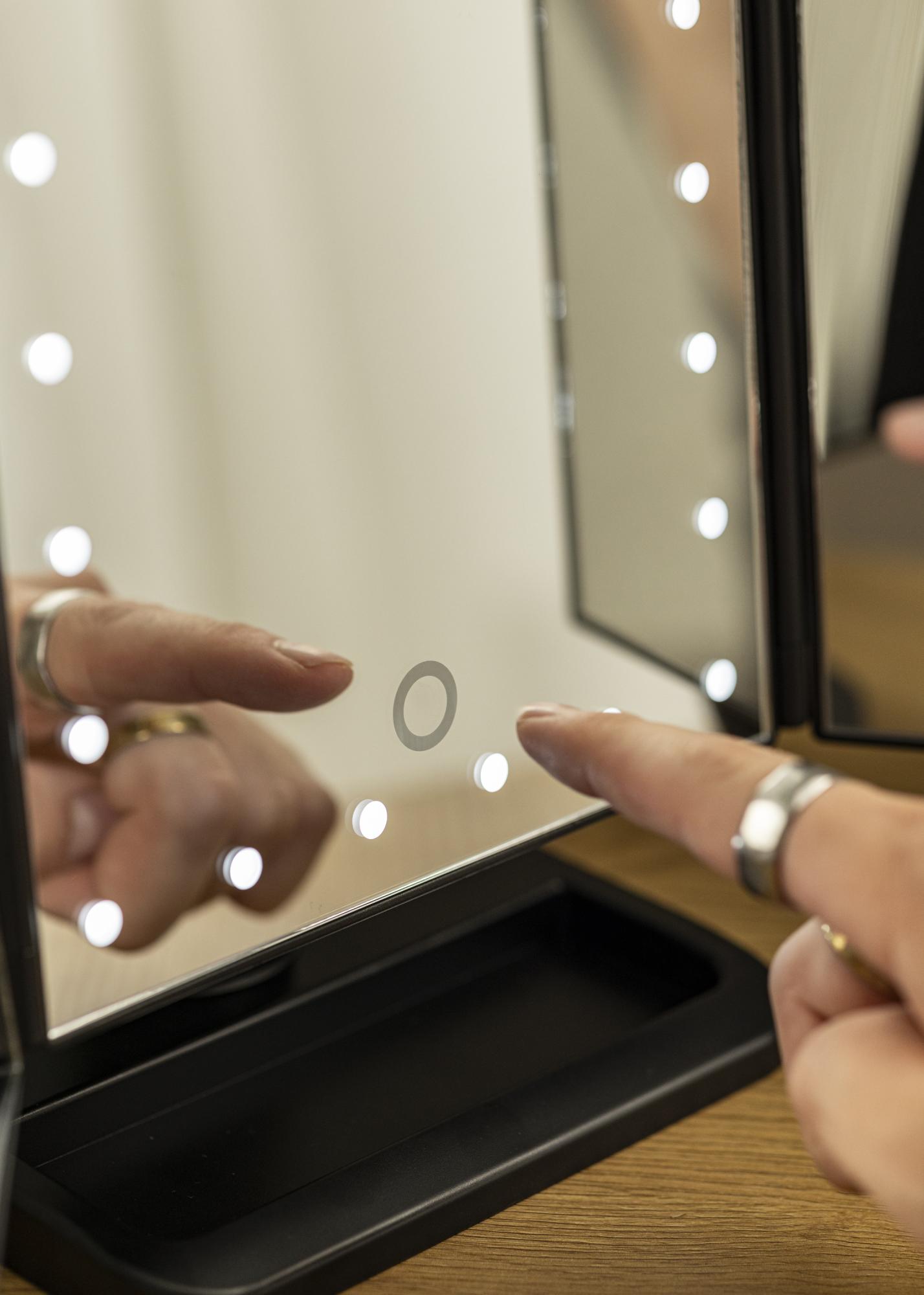 Un moderno espejo para tocador 4 en 1 en diseño sueco de KAILA. Este espejo para tocador te permite reflejarte desde diferentes ángulos con tres lados de espejo y tiene un soporte ajustable que permite girar el espejo 180°. El lado izquierdo del espejo para tocador tiene espejos de aumento de x2 y x3. Alrededor de la gran superficie del espejo en el centro hay 24 luces LED decorativas que proporcionan una agradable luz blanca cálida de 3000K. La iluminación LED integrada se enciende presionando el botón táctil y se ajusta fácilmente manteniendo presionado el botón durante al menos dos segundos. El espejo para tocador mide 38x25 cm y se puede plegar fácilmente cuando no se utiliza.