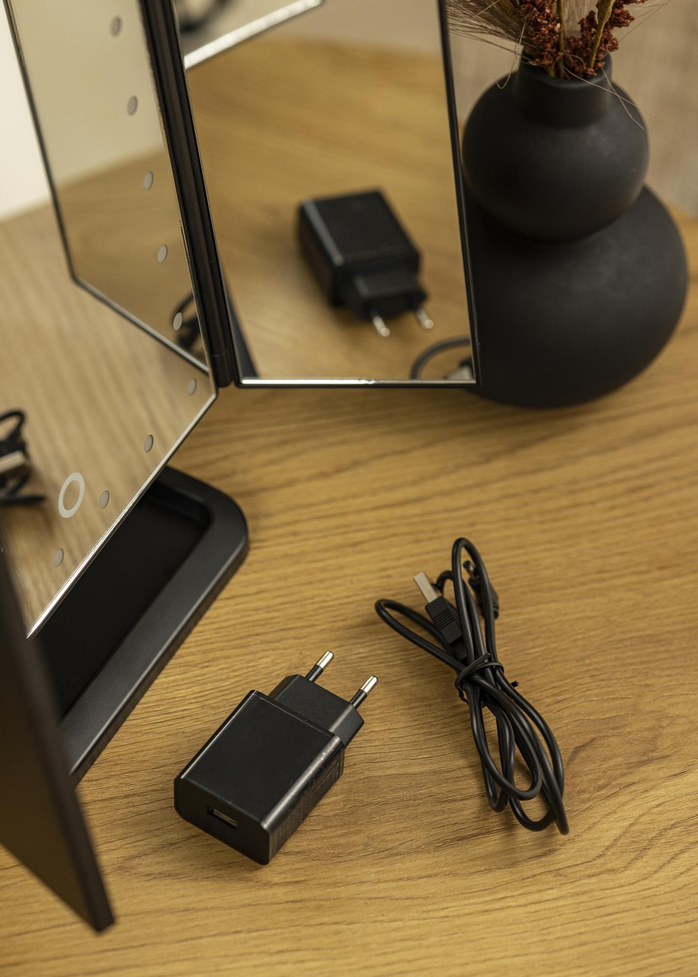 El espejo para tocador está hecho de ABS para obtener la mejor calidad posible y la bombilla LED es una luz natural que consume menos energía. El espejo funciona con 4 pilas AA (no incluidas) o se puede cargar con el adaptador de pared USB y el cable USB incluidos.