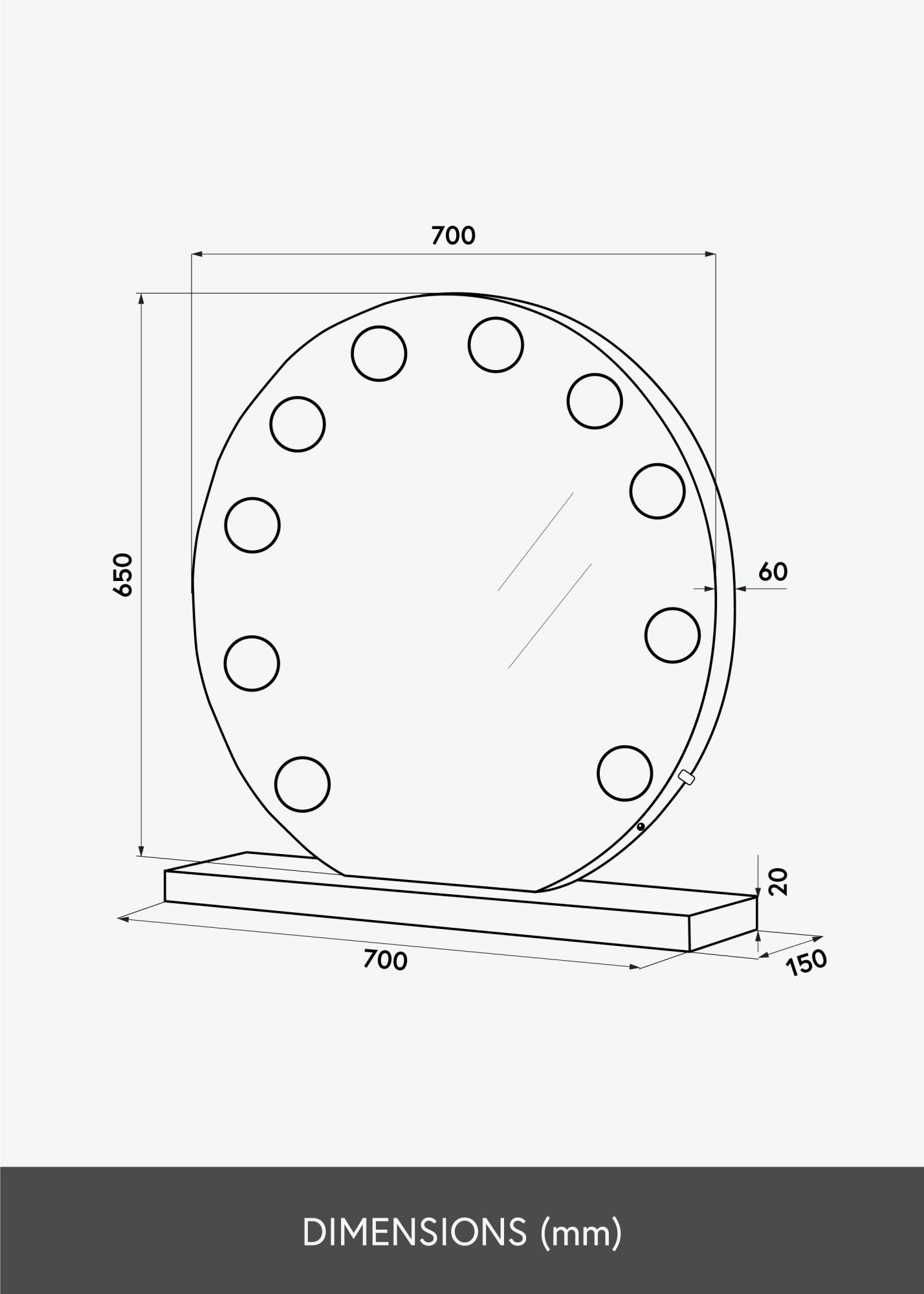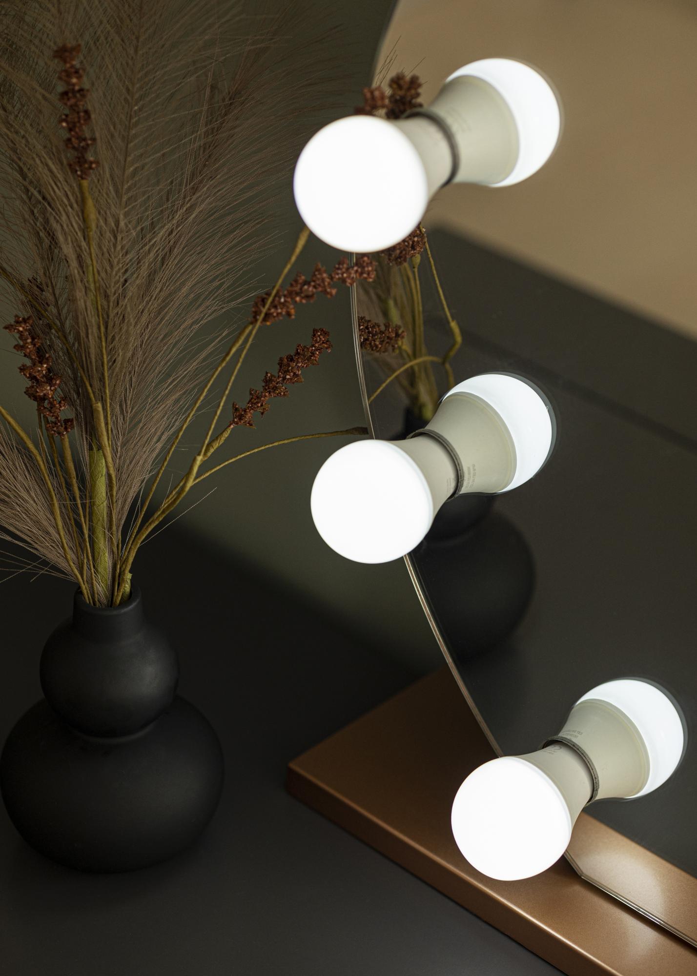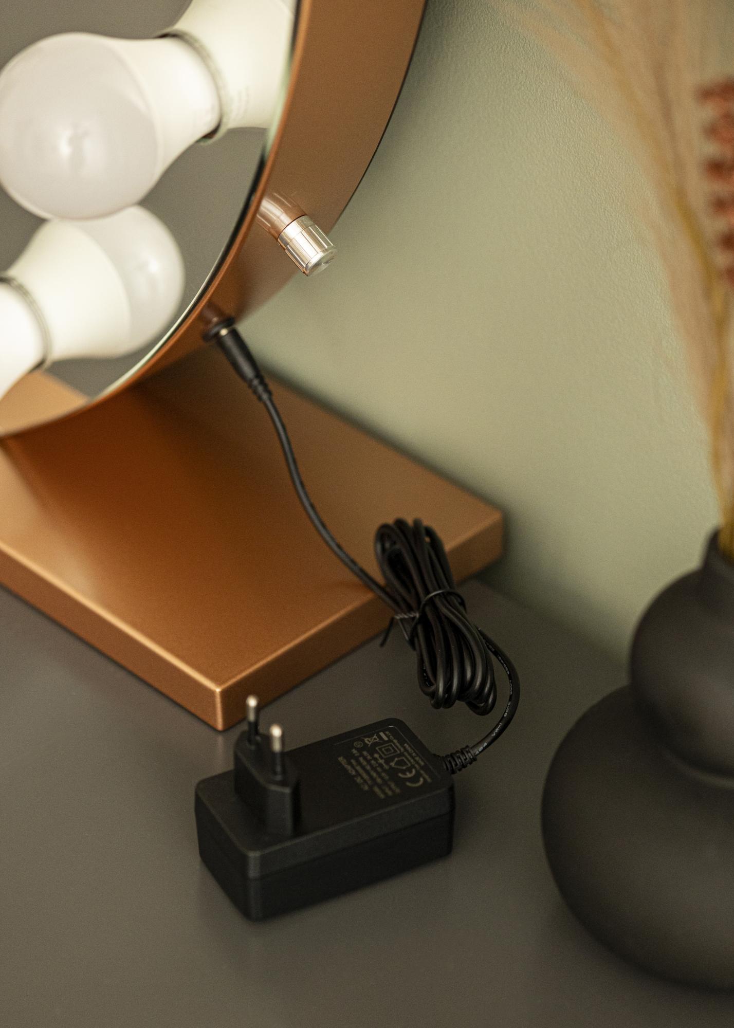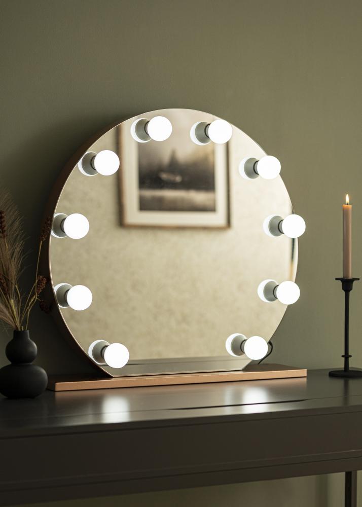 Deja que este espejo para tocador en dorado rosa añada un toque de lujo a tu habitación. Las 10 bombillas del espejo, colocadas como un marco alrededor de la superficie del espejo, proporcionan una luz blanca, fría y uniforme. Las bombillas tienen una base E27 y son intercambiables. Gracias a la función de atenuación inteligente, puedes ajustar la intensidad de la luz según tus necesidades. Todo lo que tienes que hacer es girar el botón en un lado corto del espejo.