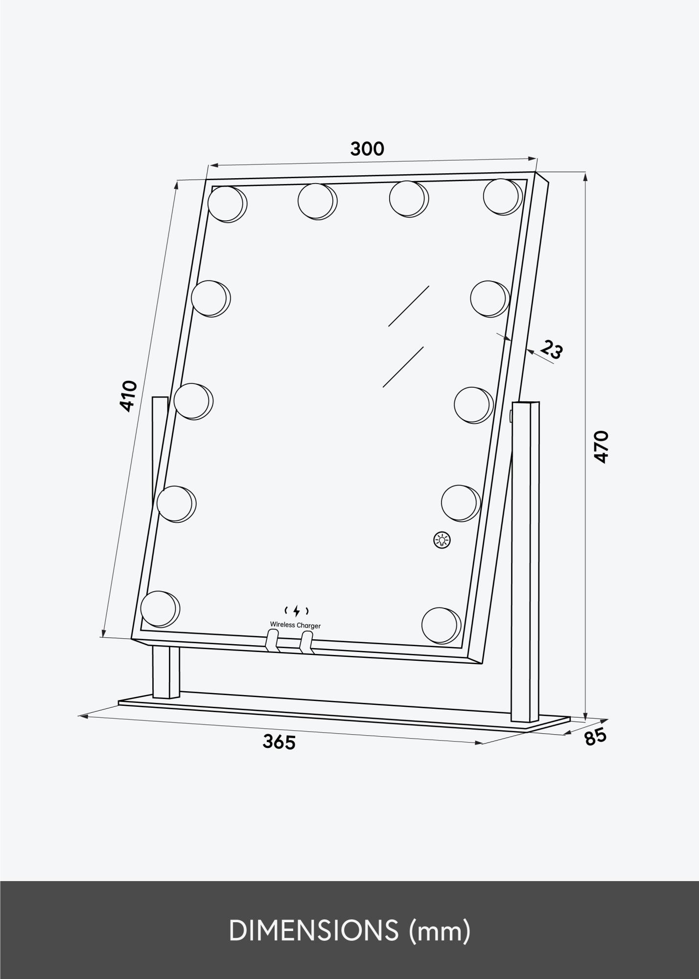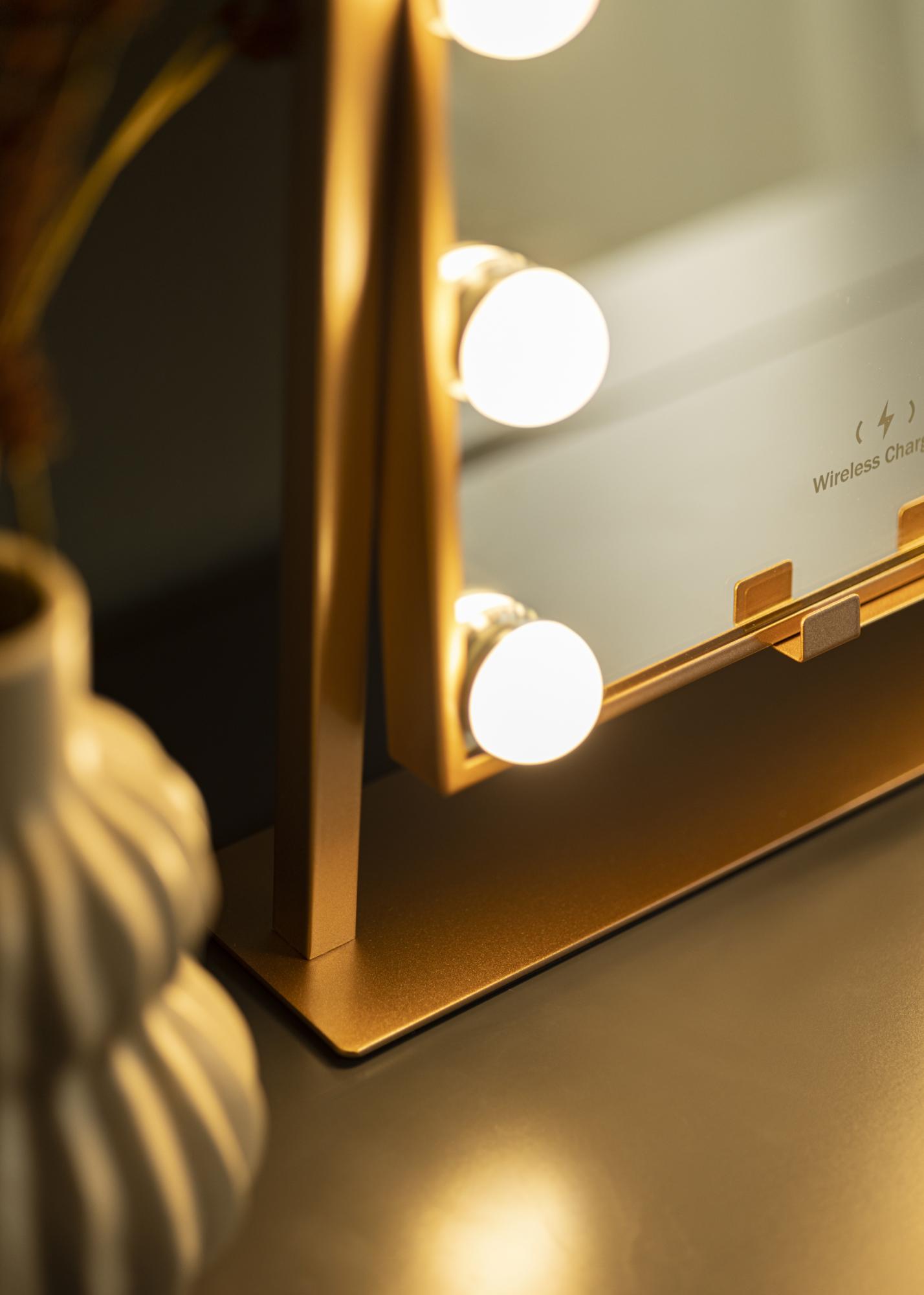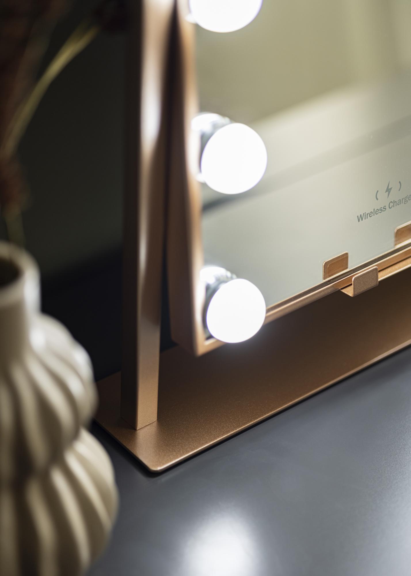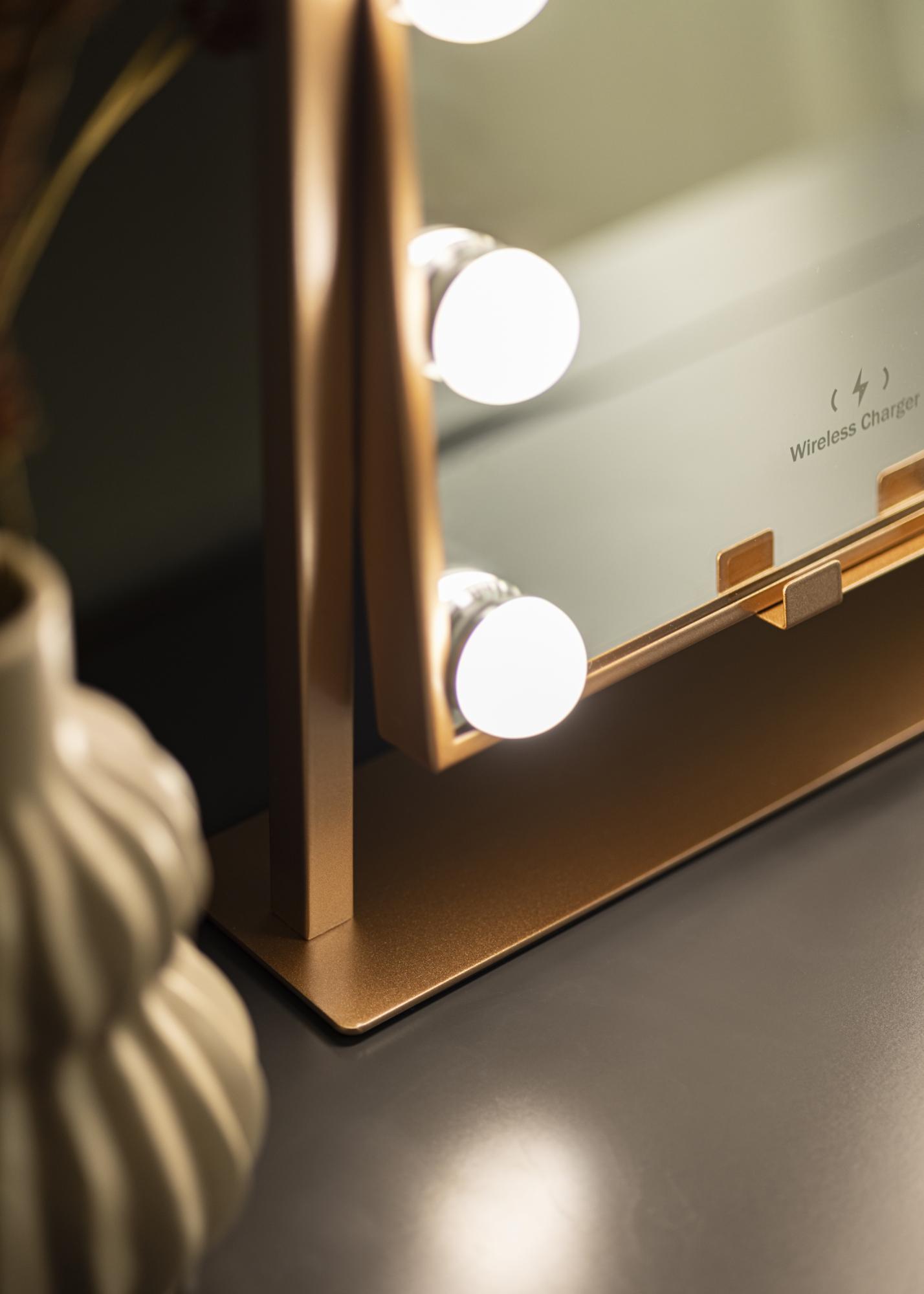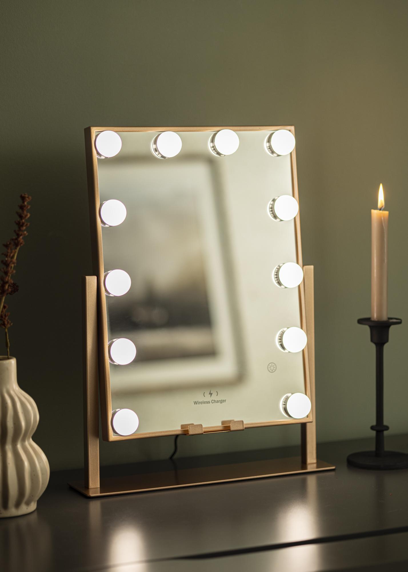 Este es un espejo para tocador en tono dorado rosa, con la lujosa función de carga inalámbrica. Cuando el espejo está encendido, colocas tu teléfono en el lugar designado para cargarlo con 5V/2A (10W). La función de carga funciona para todos los dispositivos de smartphone que admiten carga inalámbrica. Otras inconfundibles inteligentes de este espejo incluyen una superficie de espejo ajustable y una iluminación LED incorporada que te proporciona una buena luz al aplicar maquillaje. La iluminación consta de 12 lámparas LED que enmarcan hermosamente la superficie del espejo y le dan a todo el espejo un aspecto elegante. La iluminación es regulable, y para ajustar la luz al brillo que deseas, mantén presionado el botón táctil en la parte frontal del espejo durante unos segundos.