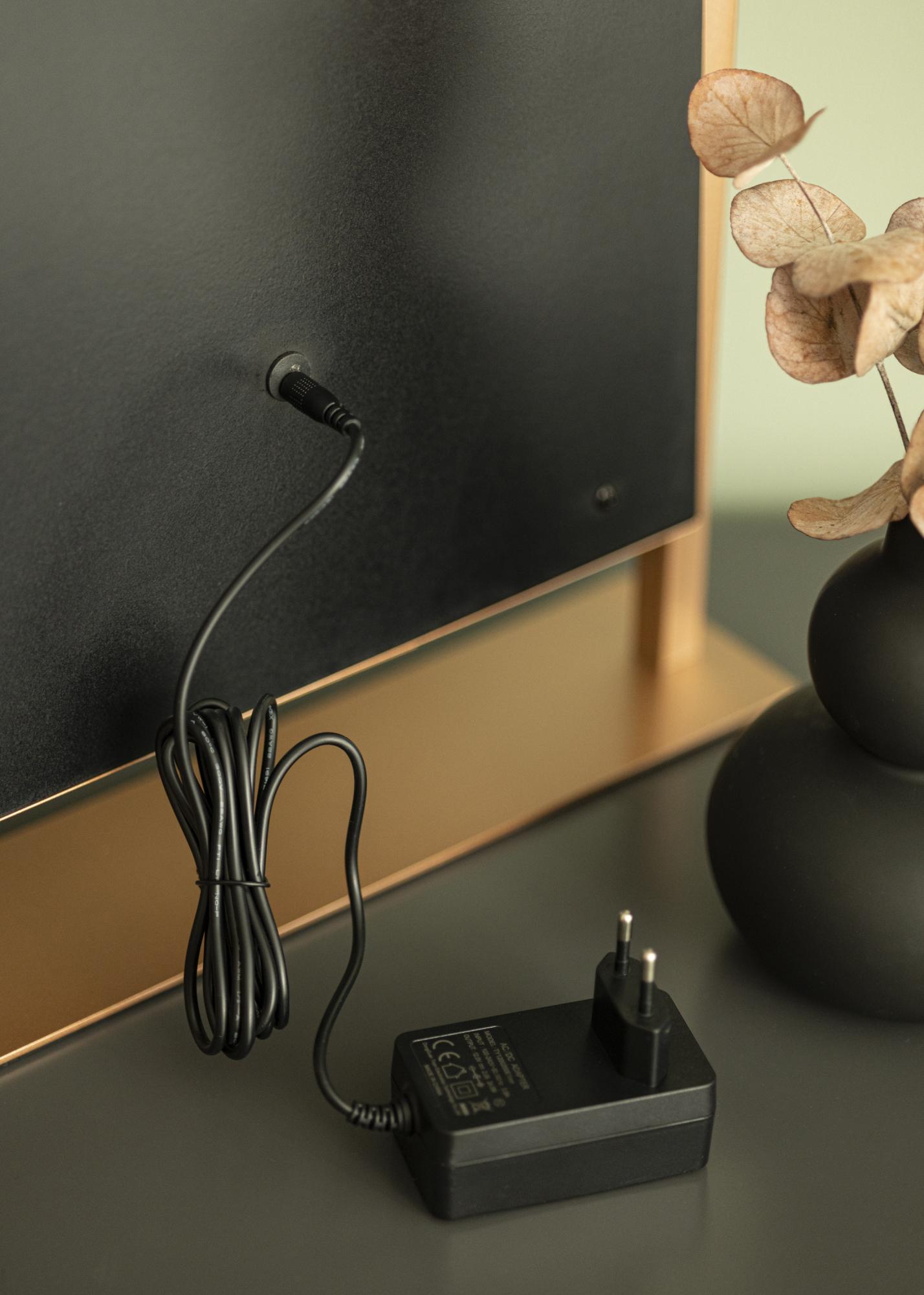 El espejo tiene un diseño vertical y se puede colocar fácilmente en cómodas, aparadores y mesas. Se conecta a la electricidad mediante un enchufe.