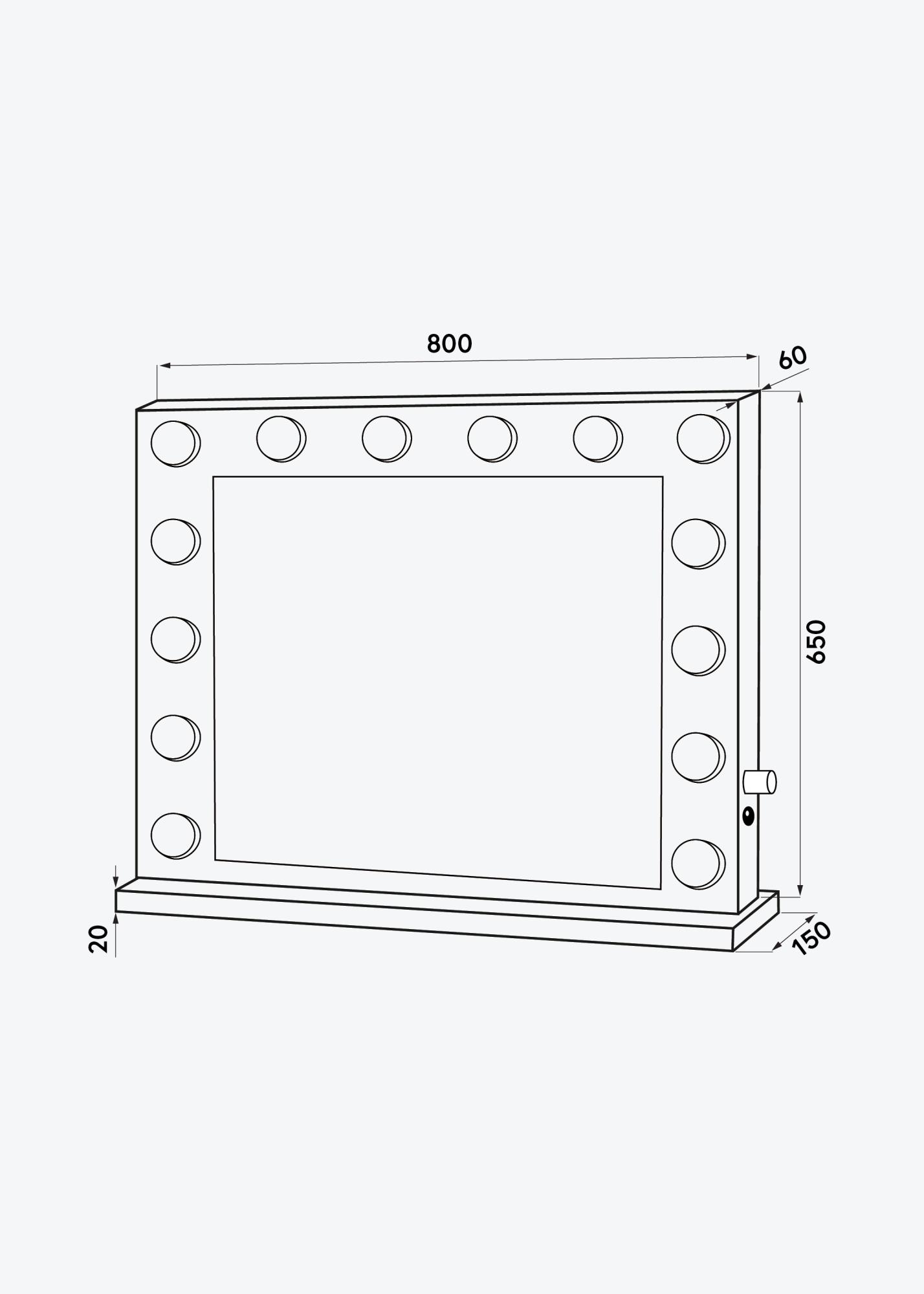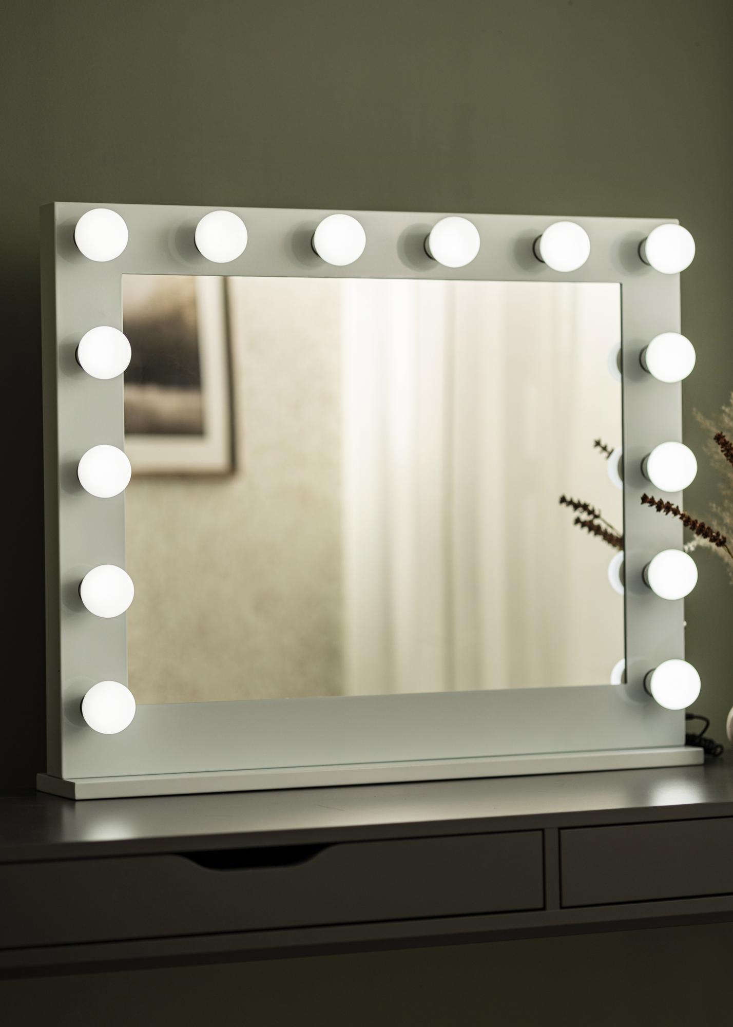 Este es un espejo para tocador grande con iluminación incorporada, perfecto para aplicar maquillaje o mirarte antes de salir durante el día. El gran tamaño, con una superficie de espejo de 80x65 cm, combinado con un elegante marco blanco con 14 bombillas intercambiables, le da al espejo una sensación de glamour de Hollywood. Las bombillas tienen una base E27. El espejo se coloca de soporte en una cómoda, tocador o cualquier otra superficie plana que desees adornar con un hermoso espejo para tocador. También se puede montar en la pared sin el soporte.
