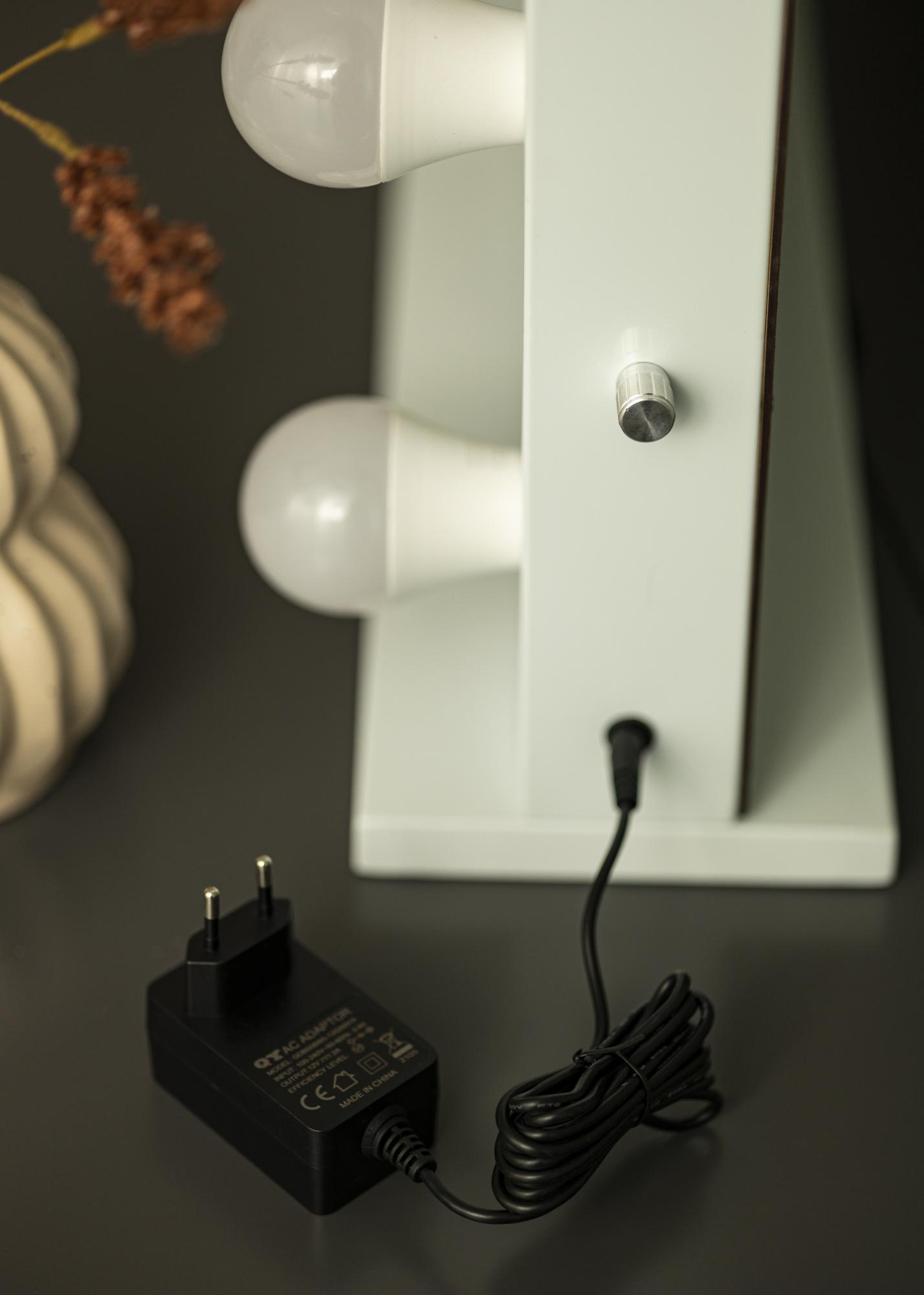 Las luces del espejo emiten una luz blanca fría. Si deseas atenuar la iluminación, puedes hacerlo con la ayuda de un práctico botón giratorio en uno de los lados cortos. La instalación eléctrica se realiza con un enchufe.
