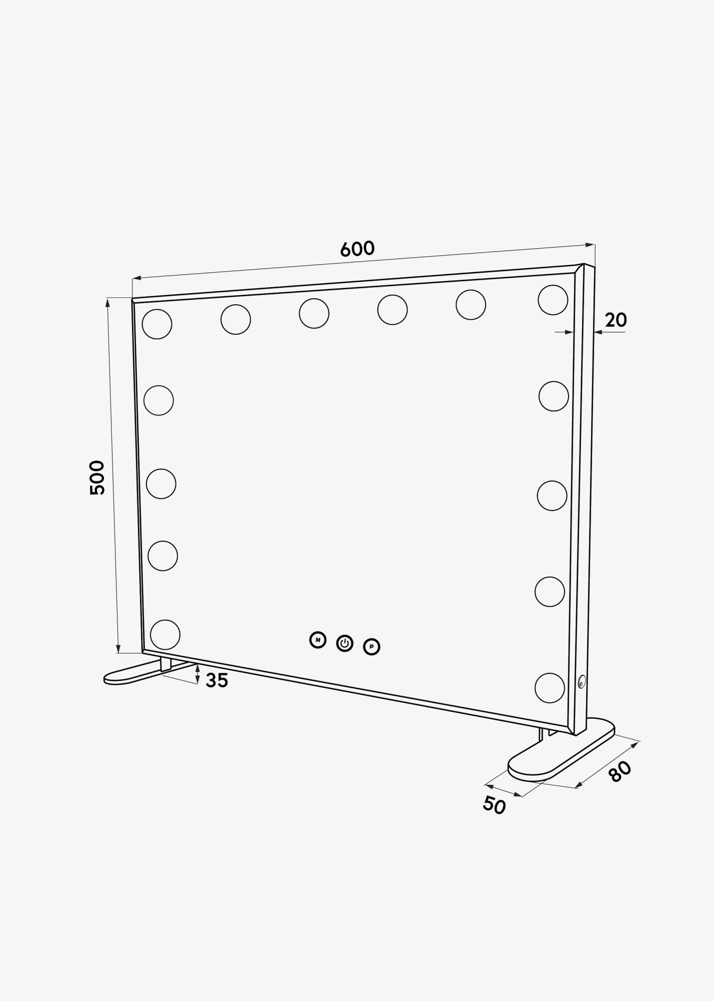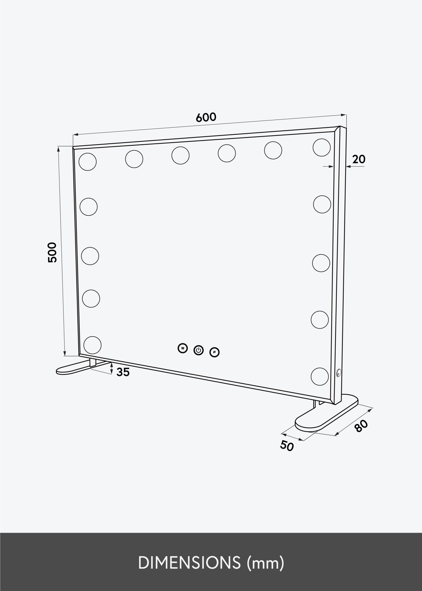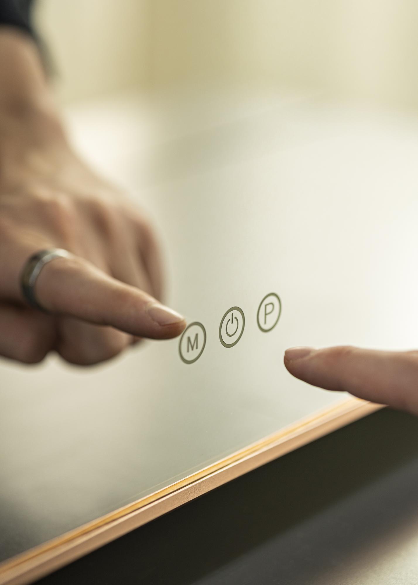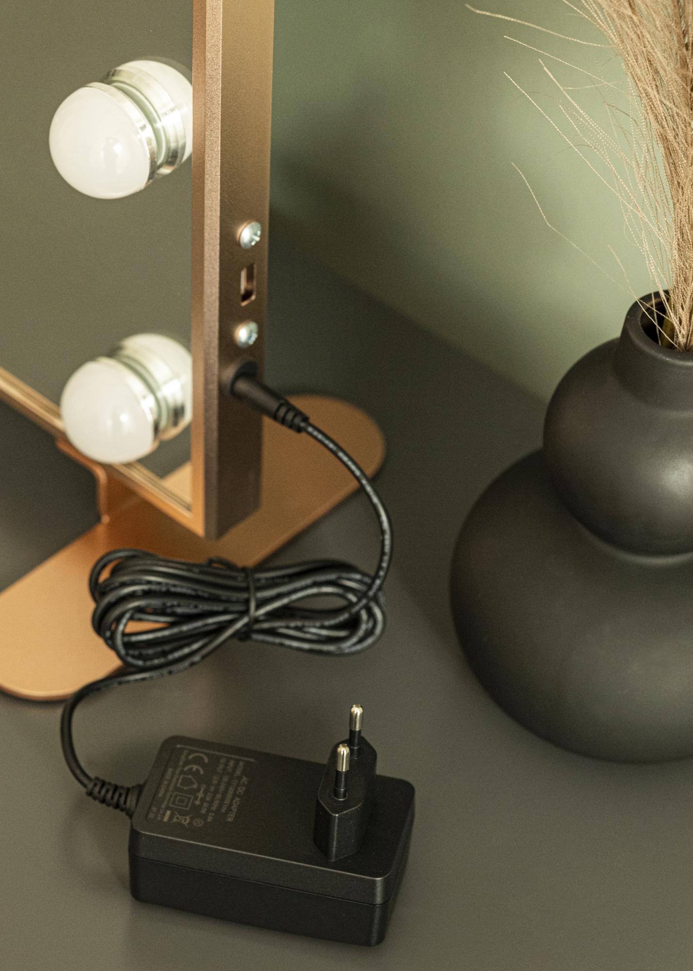 La iluminación LED es ajustable y para cambiar la configuración de luz, utiliza los botones táctiles en el borde inferior del espejo. El botón "M" cambia la temperatura de color y el botón "P" ajusta la intensidad de la luz. También hay un botón que enciende y apaga la iluminación. La iluminación flexible hace que este espejo sea adecuado tanto para la sala de estar cuando deseas tener una iluminación de fondo más suave, como para el área para tocador cuando deseas una luz brillante que te ayude a enfocarte. Además, el espejo está equipado con un puerto USB para que puedas cargar fácilmente tus dispositivos inteligentes.