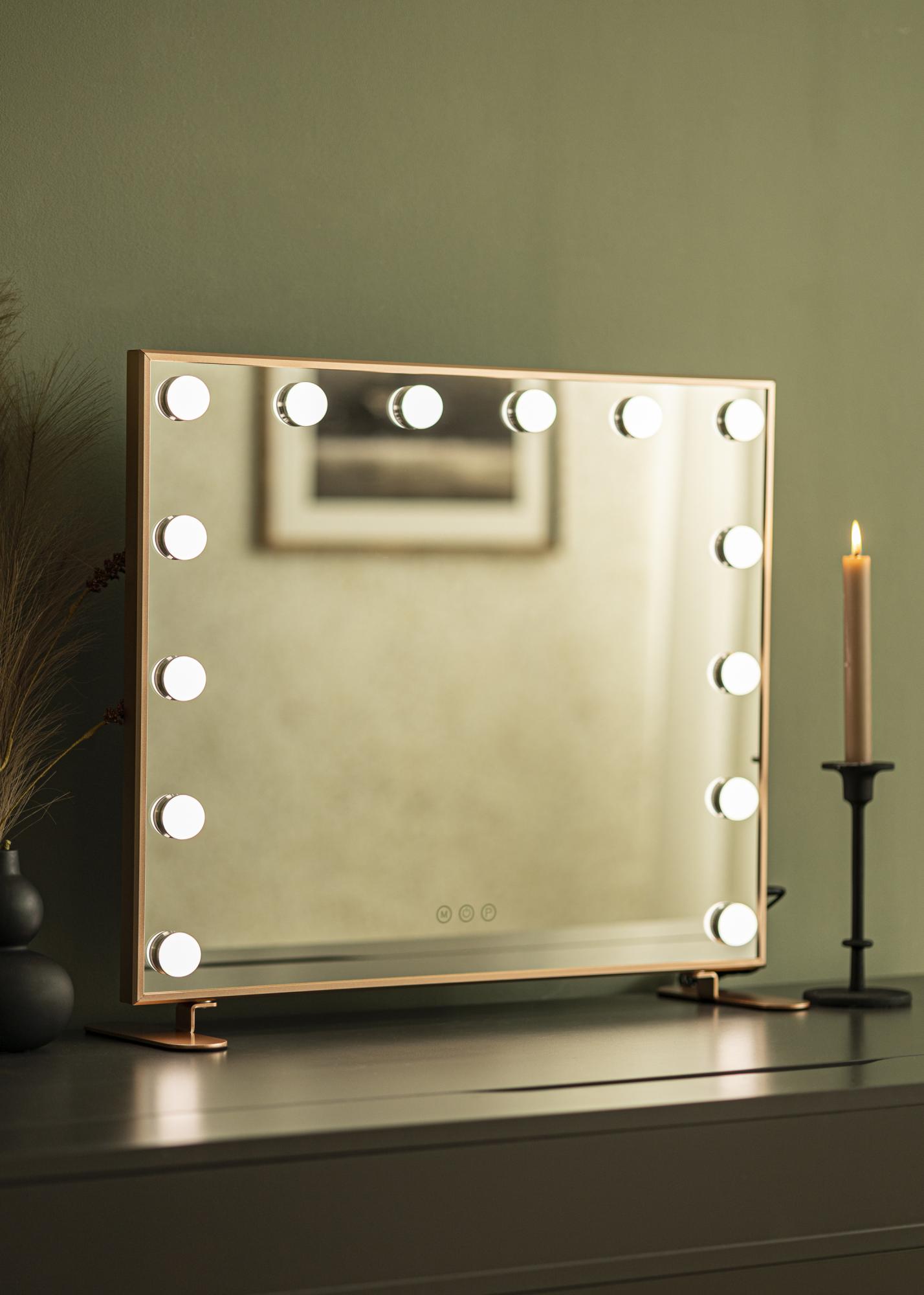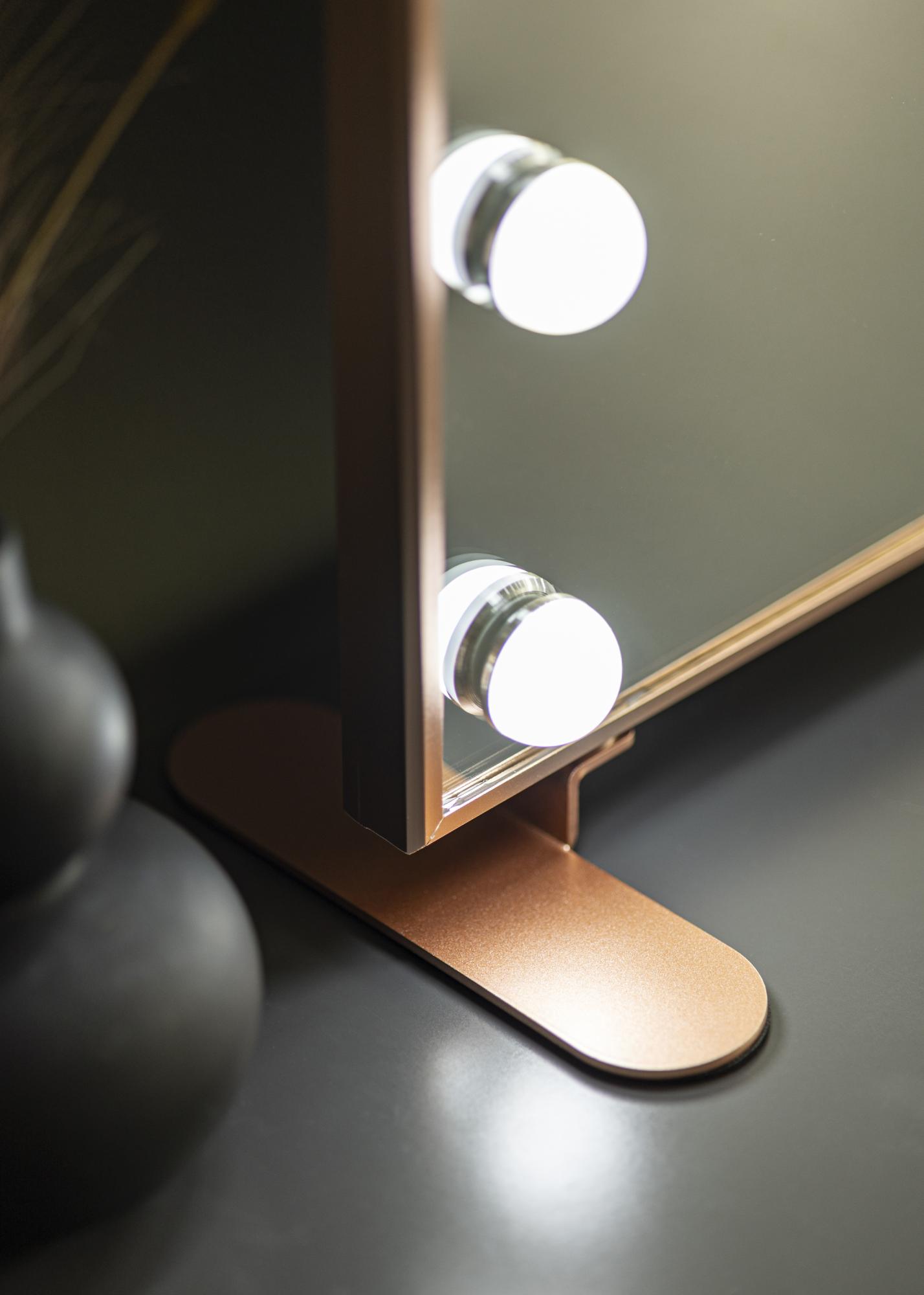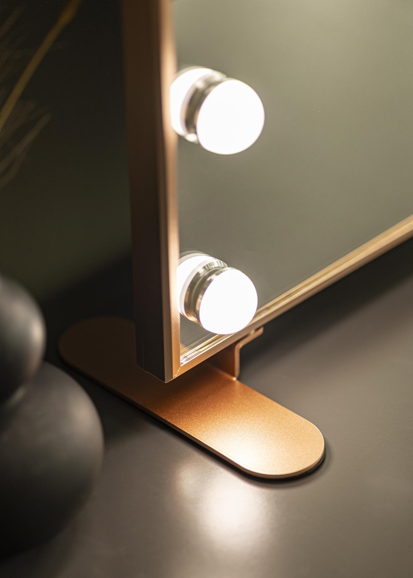 Este lujoso espejo para tocador tiene un fino marco de metal en dorado rosa y una iluminación LED en forma de 14 grandes lámparas. Esto le da al espejo un aspecto glamoroso inspirado en Hollywood que establece el estilo en cada habitación. Tiene un elegante soporte para el soporte, también en tono dorado rosa, que se puede quitar si deseas colgar tu espejo en la pared.