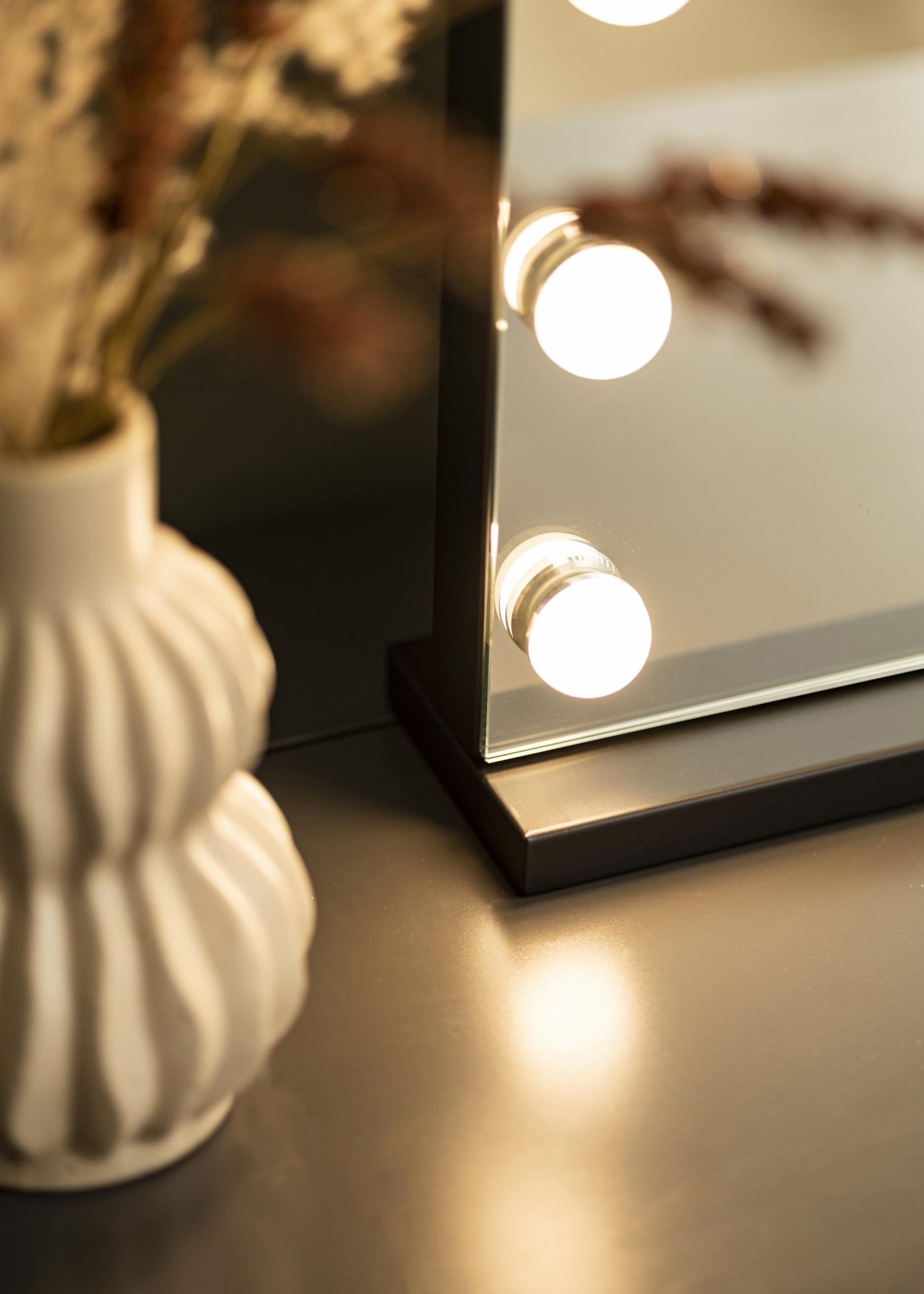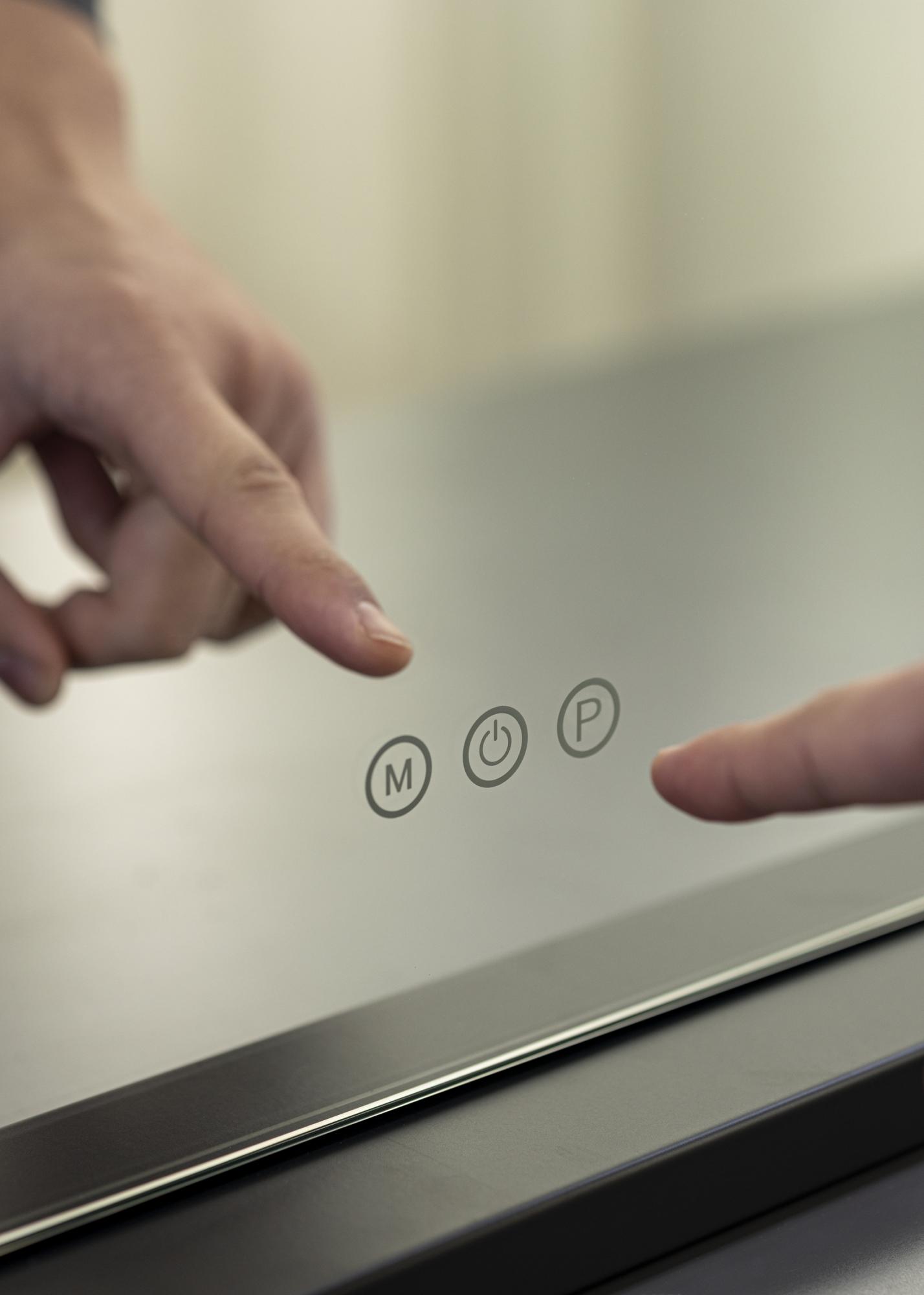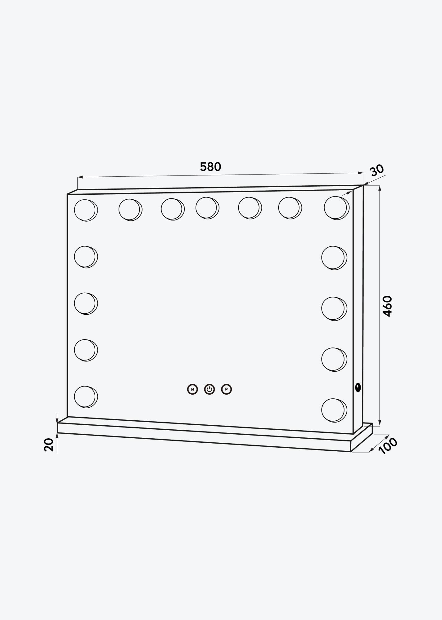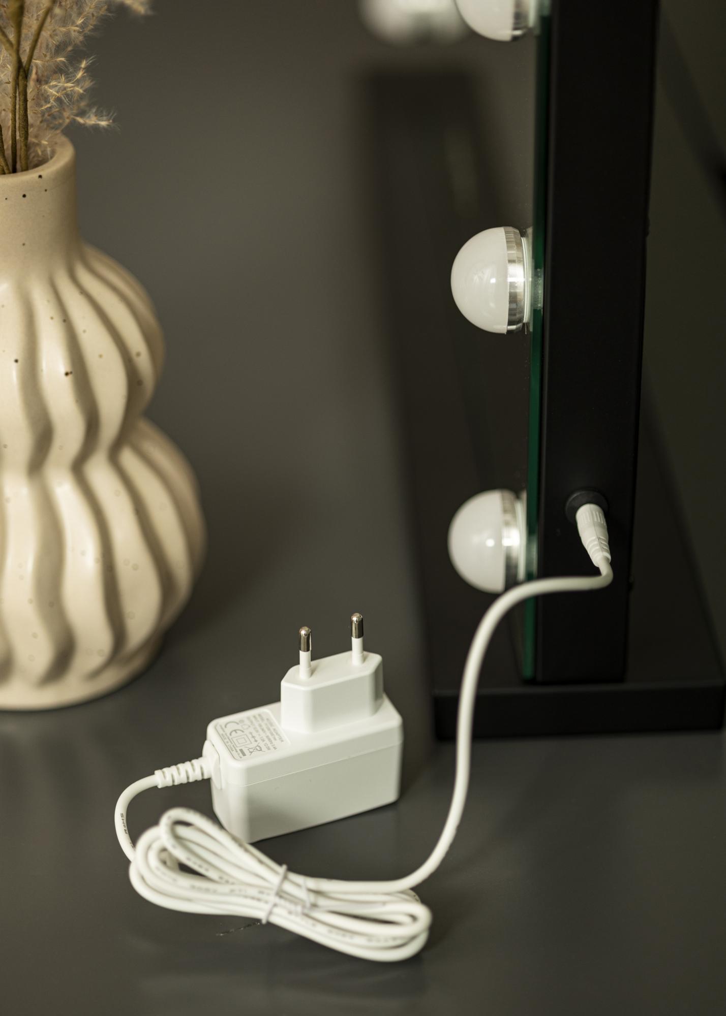 ¡Embellece tu rincón para tocador, sala de estar o recibidor con un elegante espejo para tocador con iluminación incorporada! El espejo no tiene un marco tradicional, en su lugar, la superficie del espejo está enmarcada por 15 luces LED que están colocadas a lo largo de los bordes del espejo. La iluminación es ajustable y puedes configurar tanto la intensidad de la luz como la temperatura de color. Los ajustes de luz se realizan a través de los botones táctiles en el borde inferior del espejo, donde el botón "P" cambia la intensidad de la luz y el botón "M" ajusta la temperatura de color. También hay un botón táctil para encender o apagar la iluminación. La conexión eléctrica se realiza mediante un enchufe.
