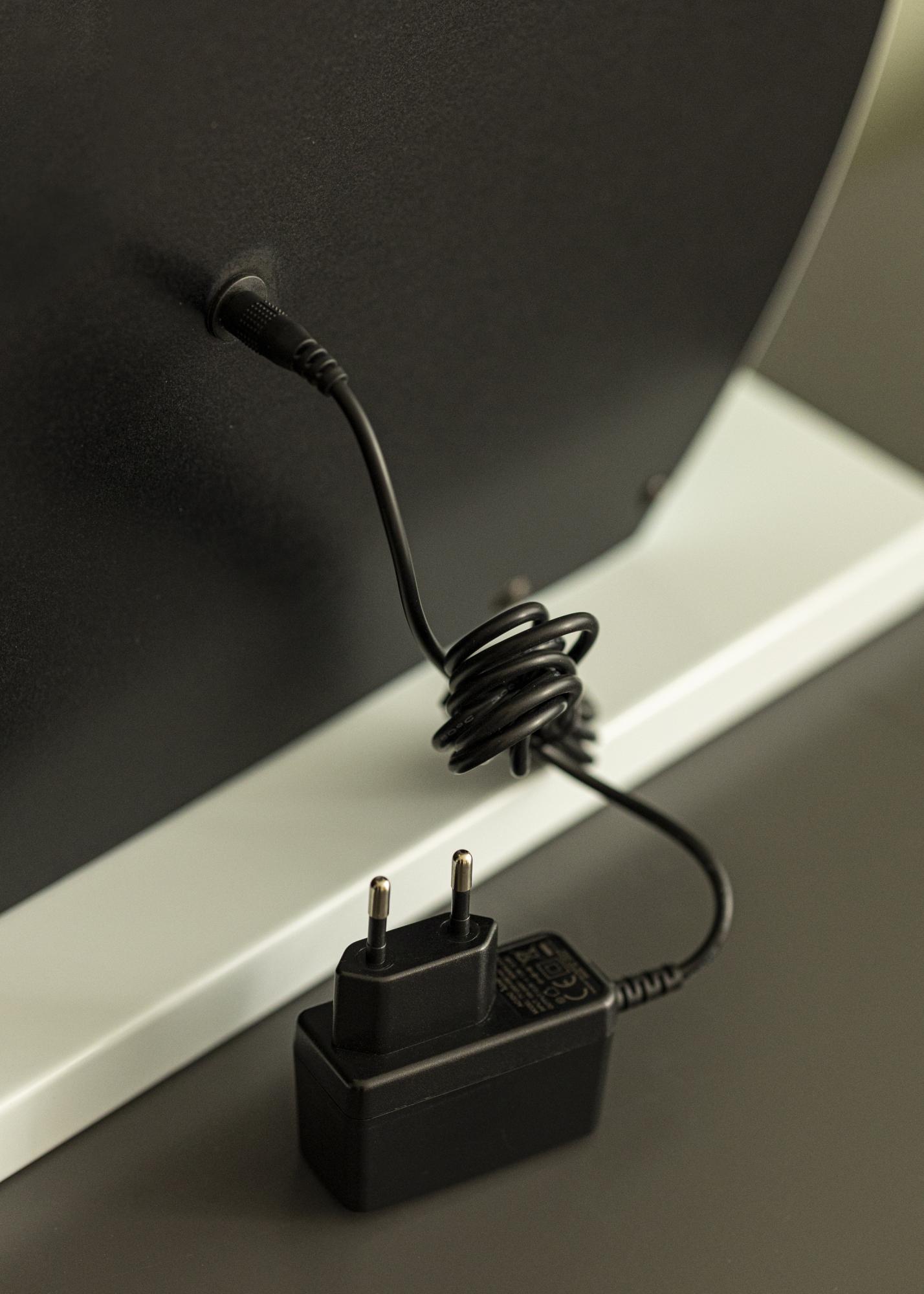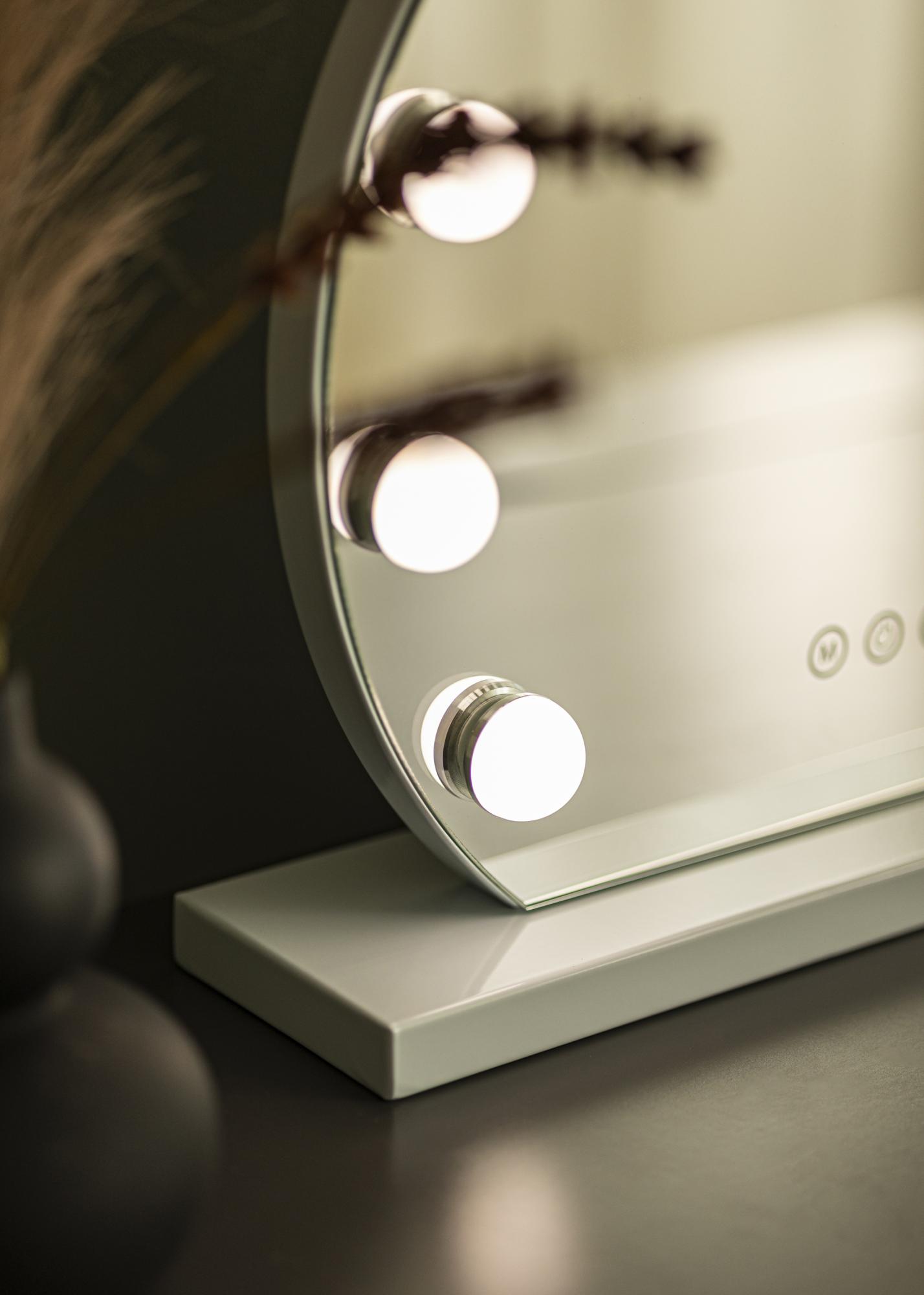 Este es un espejo para tocador de lujo con iluminación LED incorporada que proporciona una luz uniforme en tu rostro cuando te miras en el espejo. La iluminación consta de 10 lámparas LED que están colocadas a lo largo del borde de la superficie del espejo. La luz se puede ajustar según tus preferencias, ya que tienes la opción de ajustar tanto la intensidad de la luz como la temperatura de color. Los ajustes de luz se realizan a través de los botones táctiles en el borde inferior del espejo, que están marcados con letras. En el botón marcado con "M" puedes elegir la temperatura de color entre luz cálida, fría y natural. El botón marcado con "P" se utiliza para atenuar la luz. También hay un botón de encendido/apagado que se utiliza para encender o apagar la iluminación. La conexión eléctrica se realiza mediante un enchufe.