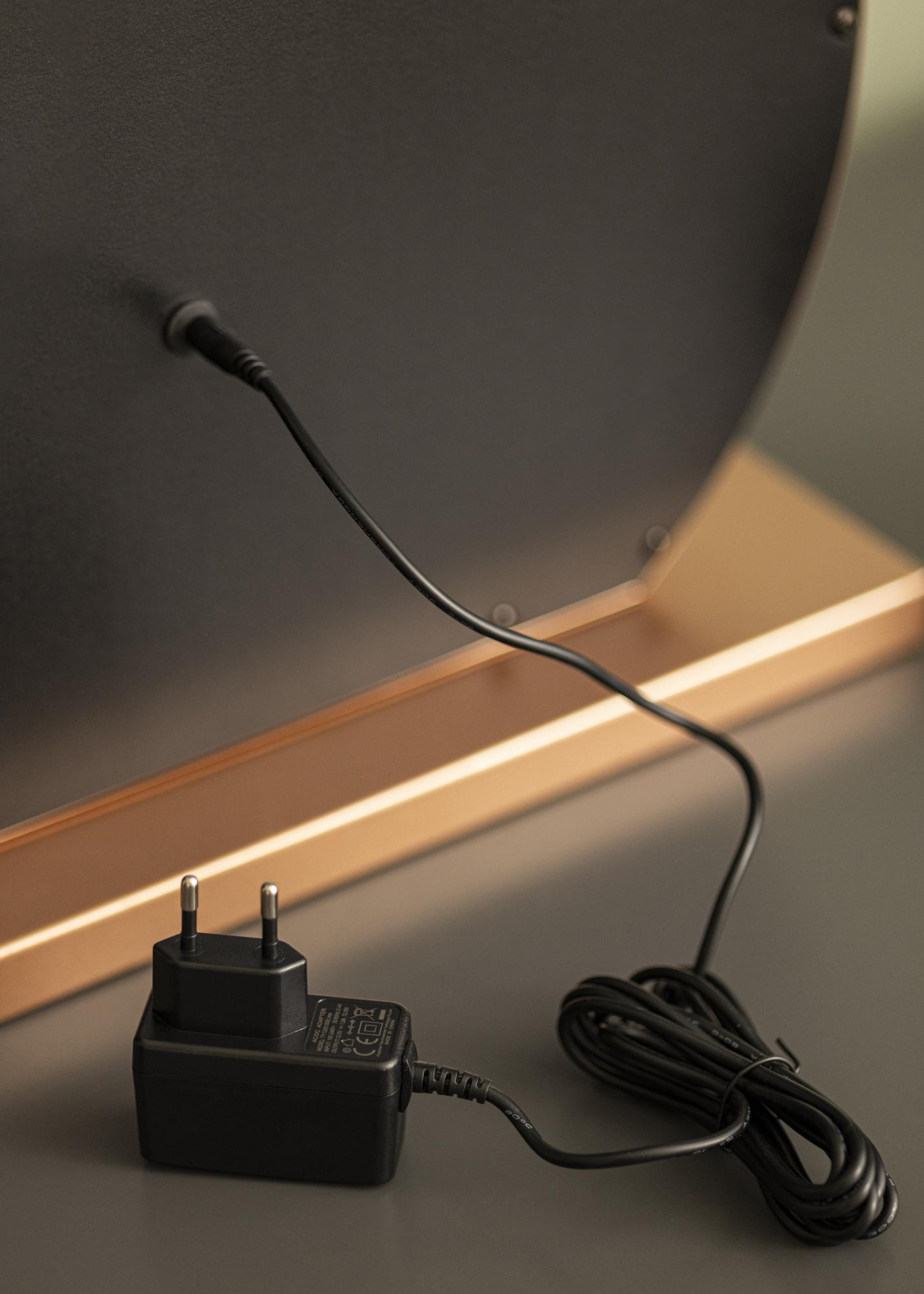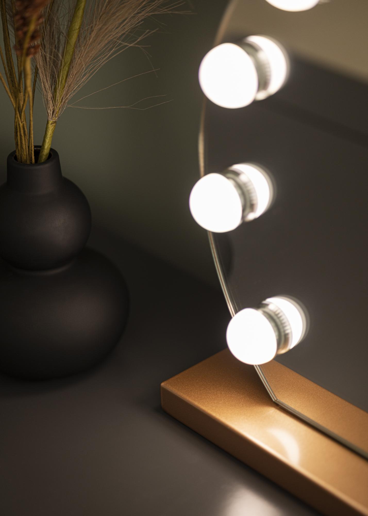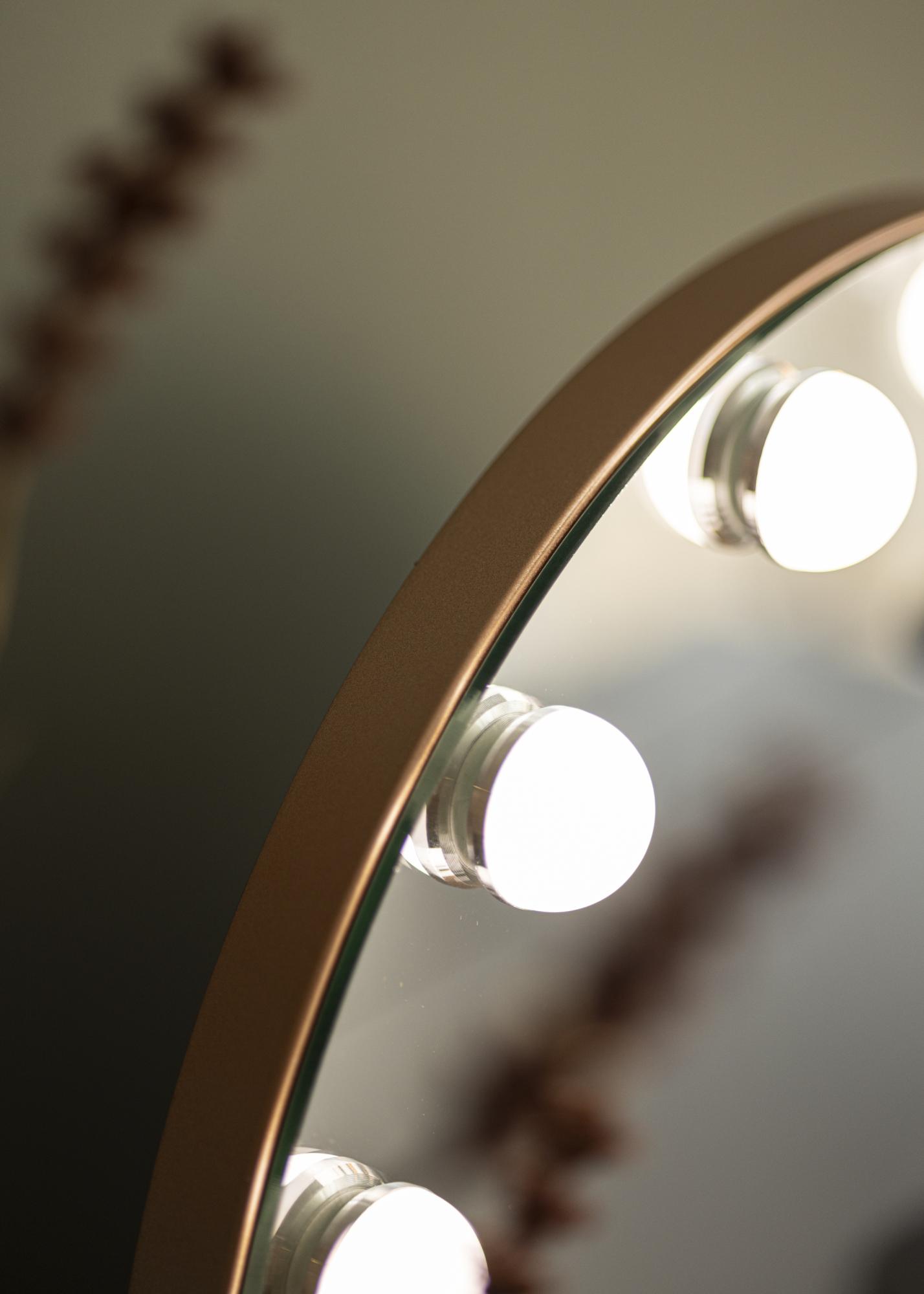 Este espejo tiene una forma redonda clásica con 10 grandes luces LED que enmarcan la superficie del espejo de 40x30 cm. Esto le da un aspecto exclusivo, que se ve reforzado aún más por el soporte del espejo en un moderno tono dorado rosa. Enciendes la iluminación incorporada con un botón táctil en el frente del espejo. También tienes la posibilidad de ajustar la temperatura de color y el brillo de la luz según tus preferencias. Esto también se hace con botones táctiles convenientes, marcados con "M" para ajustar la temperatura de color y "P" para ajustar el brillo. Las tres temperaturas de color entre las que puedes elegir son cálida, fría y luz natural.