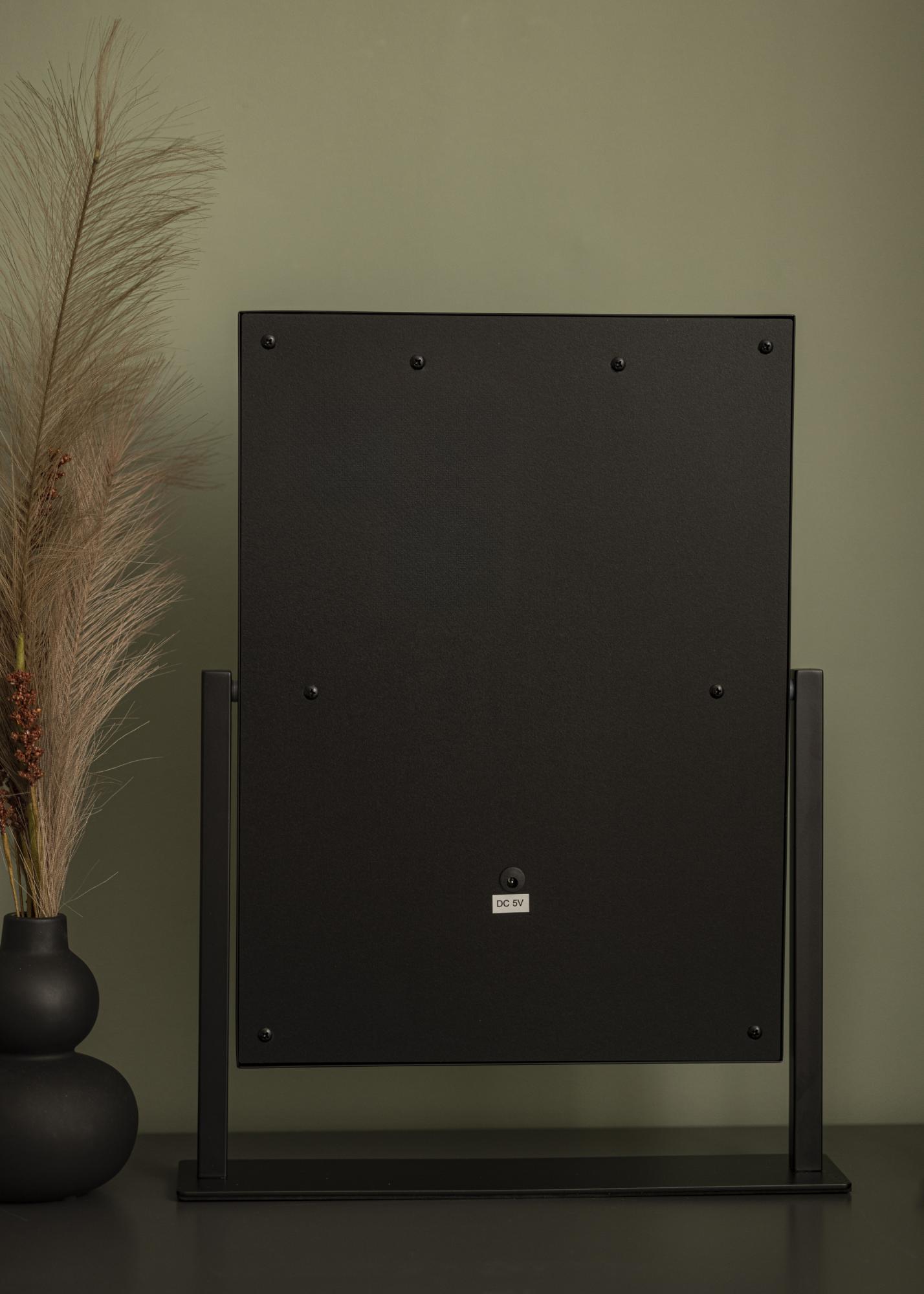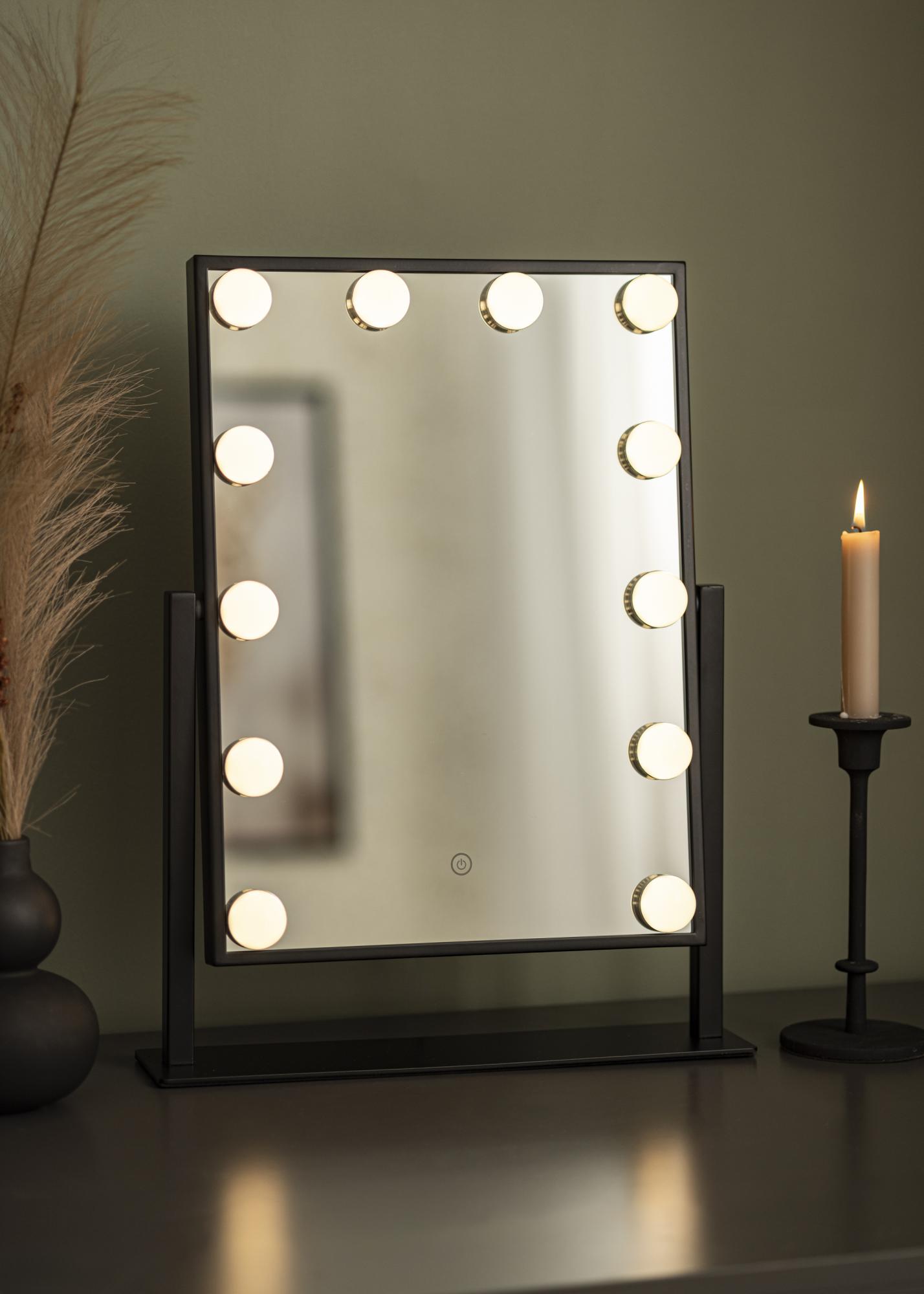 Este es un espejo para tocador de diseño lujoso con 12 bombillas LED decorativas en un elegante tono negro. Las bombillas enmarcan elegantemente la generosa superficie del espejo que mide 30x40 cm y proporciona una luz blanca cálida en 3000K. La iluminación se enciende presionando el botón táctil en la pantalla y tiene una función regulable que se ajusta fácilmente manteniendo presionado el botón durante unos segundos. El espejo se puede inclinar verticalmente para que puedas maquillarte desde el ángulo que más te convenga. Además de sus muchas funciones, este espejo para tocador se convierte en un elegante detalle y crea una auténtica sensación de Hollywood en tu hogar.