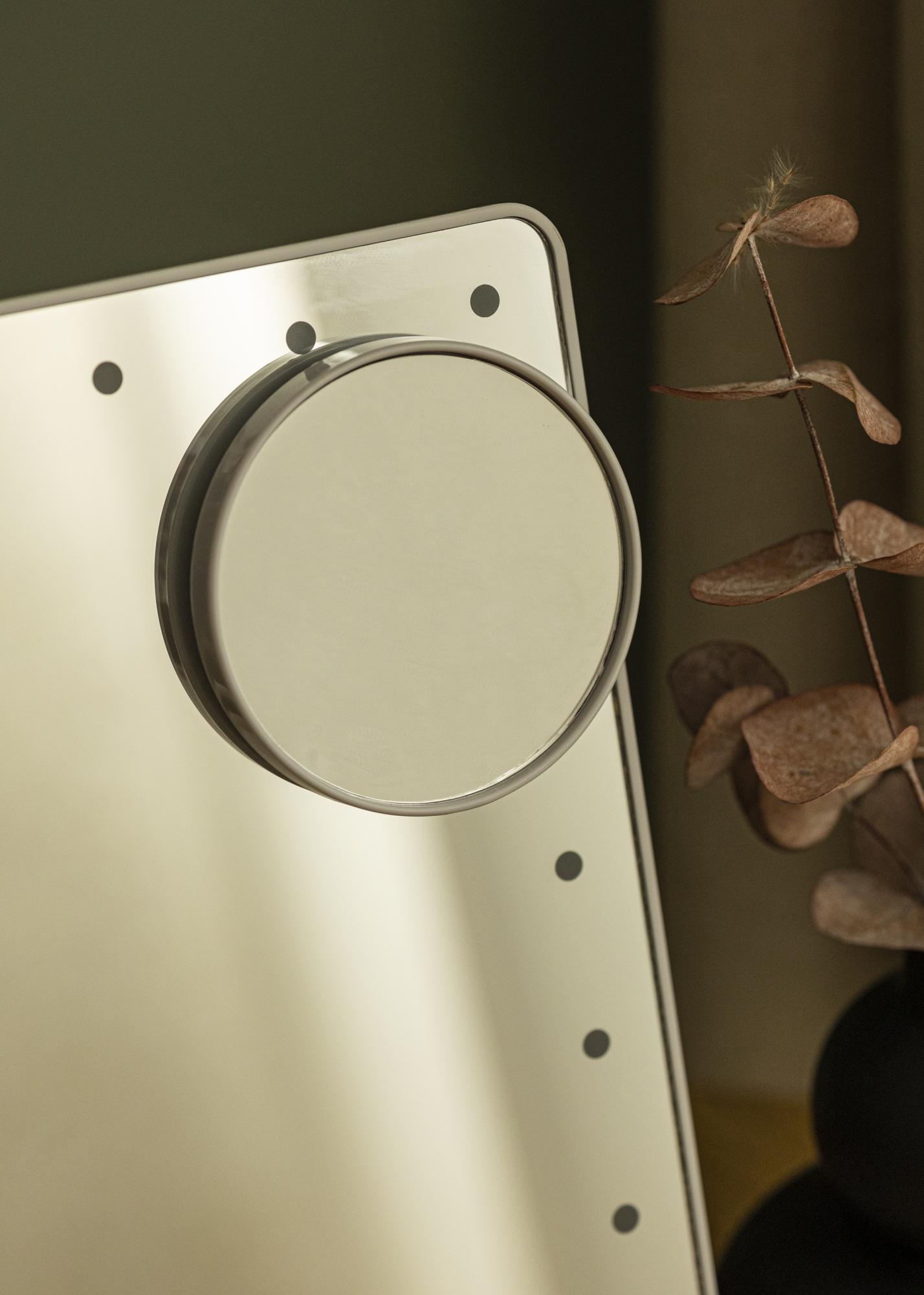 El espejo tiene un tamaño compacto con una superficie de espejo de 16,5x25 cm, lo que facilita su transporte. La superficie del espejo se puede girar e inclinar para que puedas ajustar un ángulo que te convenga. Viene con un espejo más pequeño con aumento de x2 y x3, que se puede usar por separado o colocarse en el vidrio del espejo más grande. Además, este espejo para tocador tiene iluminación LED incorporada que proporciona una luz blanca fría en tu rostro cuando te miras en el espejo. La iluminación se puede encender y apagar con un botón de encendido/apagado en la parte pósterrior del espejo y también tienes la opción de atenuar la luz. El espejo funciona con una batería incorporada que se carga a través de una conexión USB. Se incluye un cable de carga.