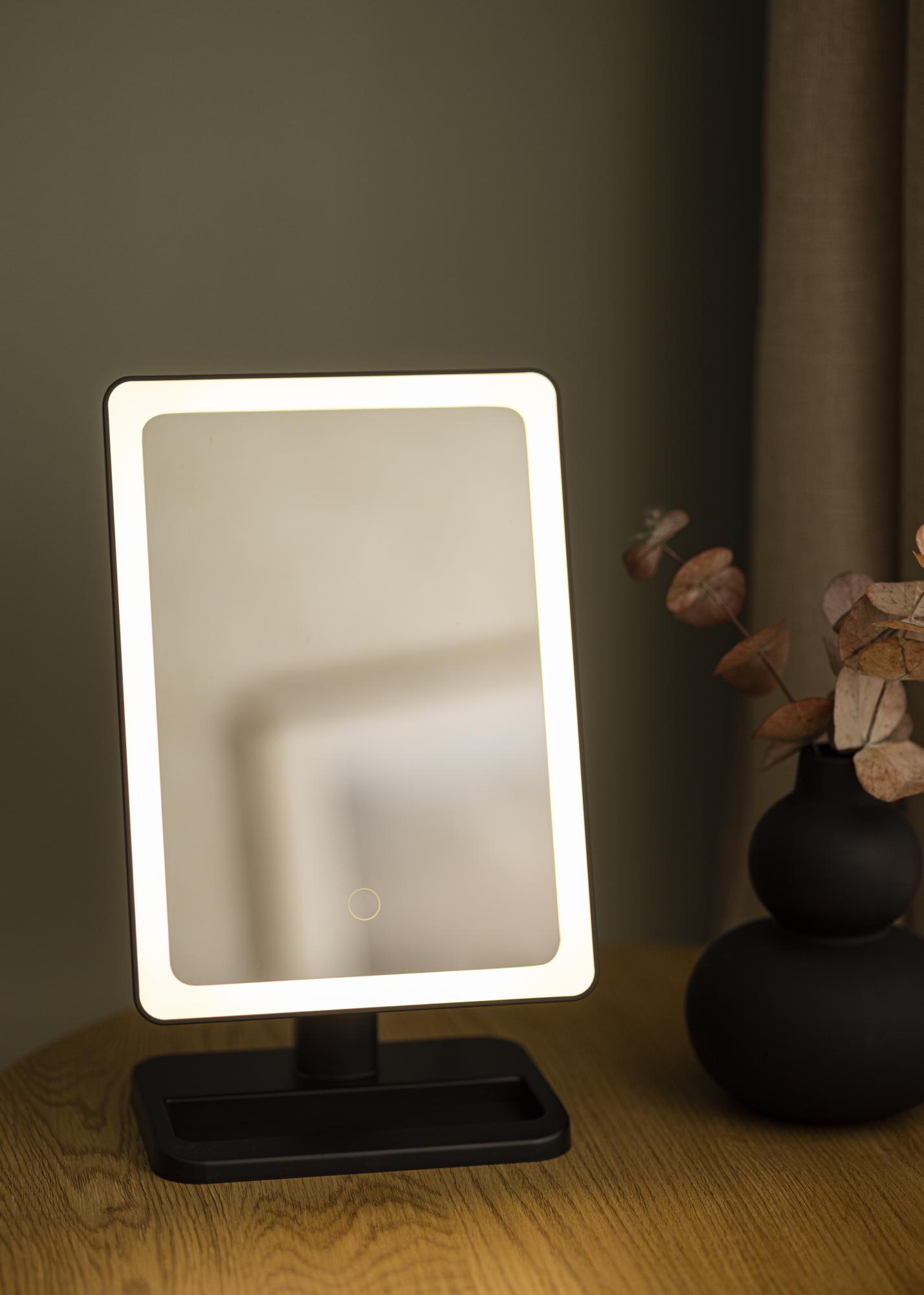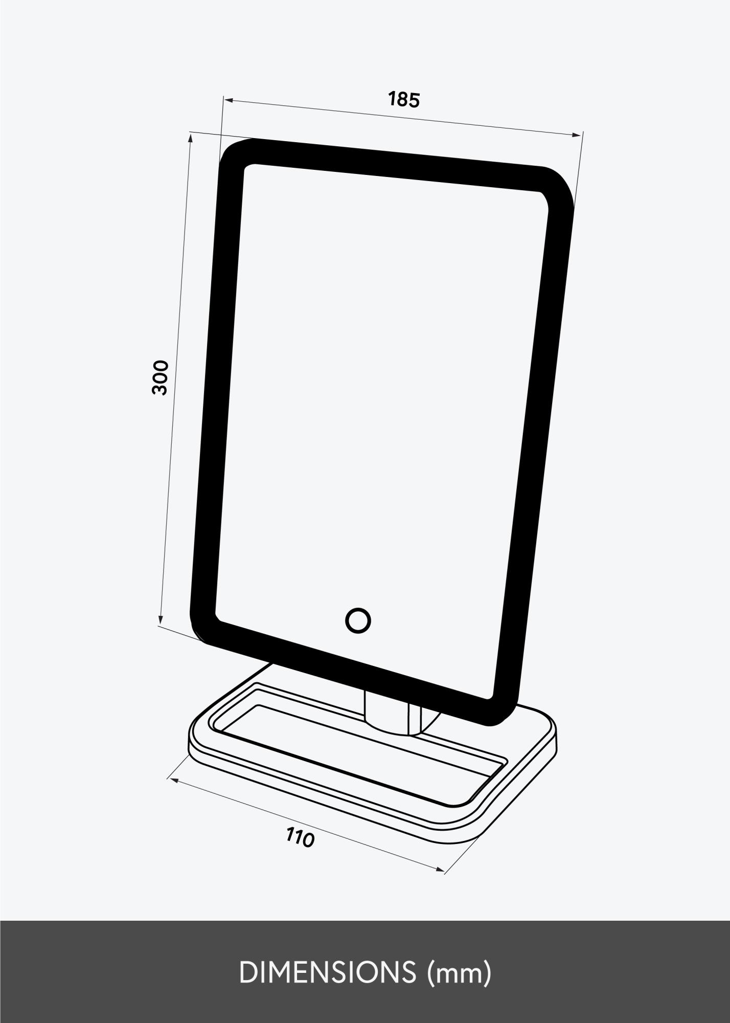 El espejo tiene un diseño inteligente con inconfundibles que facilitan el maquillaje con excelentes resultados. La superficie del espejo está rodeada por una tira de LED que ilumina tu rostro, además se puede girar y ajustar para que puedas encontrar el ángulo que te convenga. Puedes atenuar la iluminación presionando el botón en el espejo. También se incluye un espejo más pequeño con aumento de 10x, perfecto cuando quieres enfocarte en una pequeña parte de tu rostro. El espejo funciona con una batería incorporada que se carga a través del cable USB incluido.