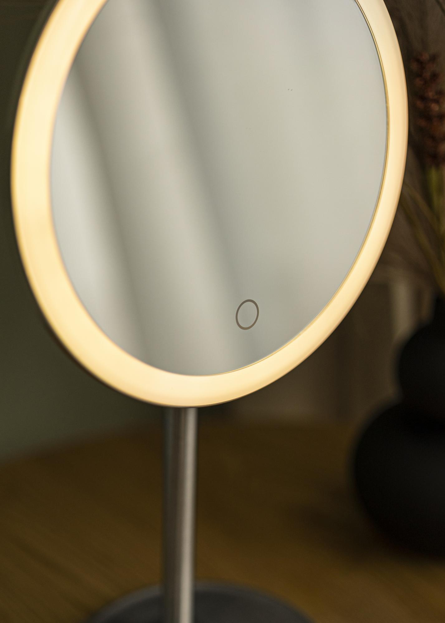 Este es un espejo de baño clásico con iluminación LED, perfecto cuando quieres reflejarte con buen enfoque. La iluminación integrada tiene brillo y temperatura de color ajustables. Todo lo que necesitas hacer es mantener presionado el botón táctil del espejo durante unos segundos y se cambiarán los ajustes de iluminación. El espejo tiene una batería incorporada que se carga con el cable de carga incluido.