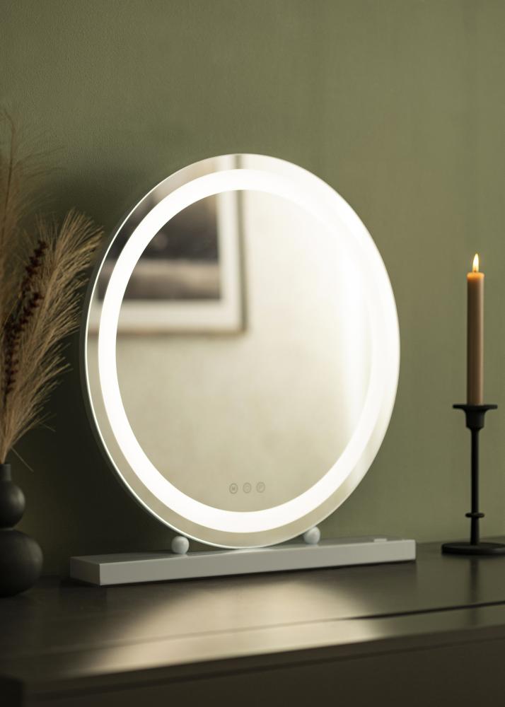 ¿Quieres tener un espejo sofisticado en diseño vertical en tu tocador, en el recibidor o en el mueble del salón? Este es un espejo redondo con un elegante soporte blanco e iluminación LED integrada, que será una adición elegante y práctica para tu hogar. La iluminación LED del espejo para tocador consta de una tira LED integrada que se enciende y apaga mediante un botón táctil en la superficie del espejo. También hay botones táctiles para ajustar la configuración de luz del espejo; un botón marcado con "M" para ajustar la temperatura de color y un botón marcado con "P" para corregir la intensidad de la luz.