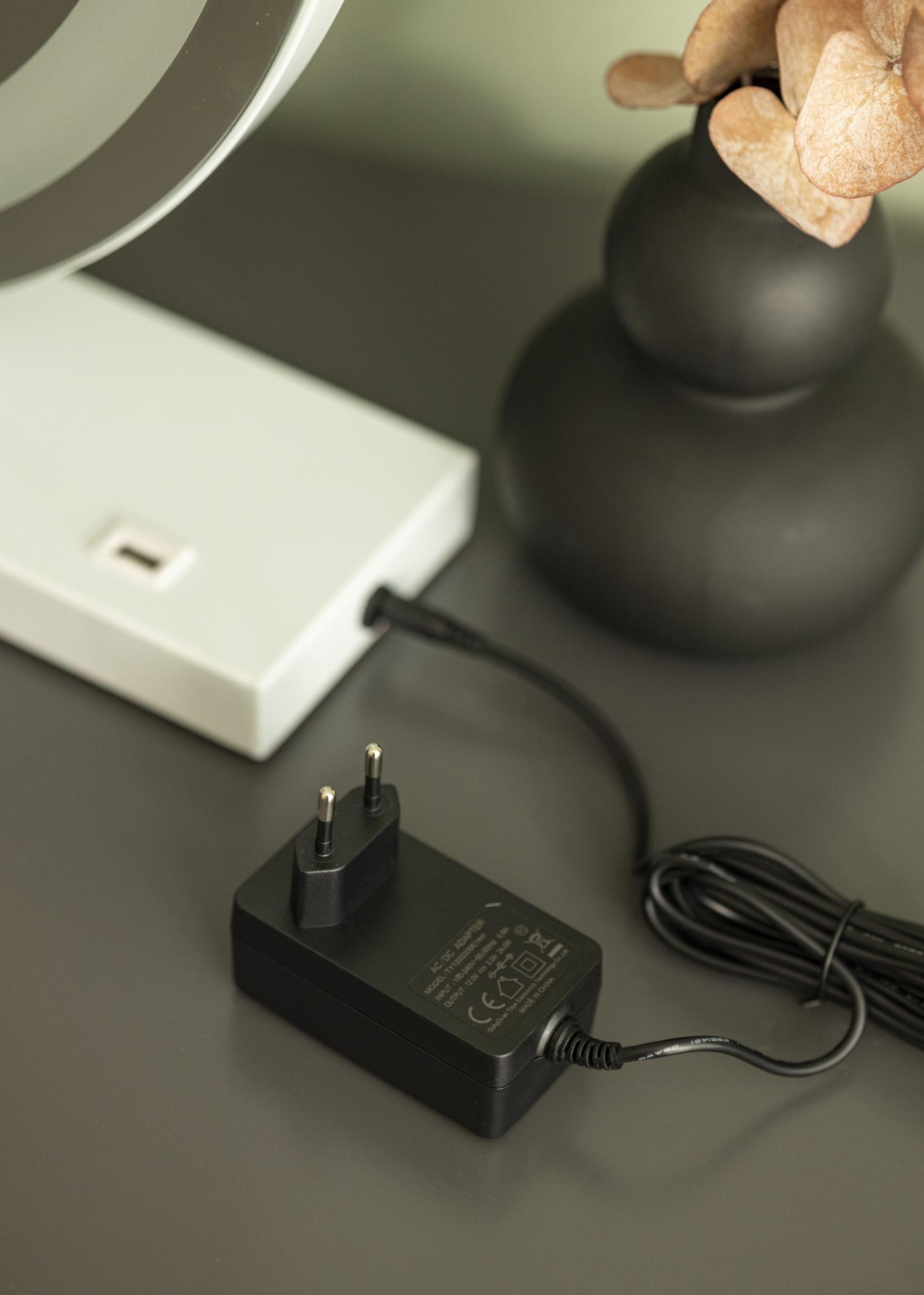 Este espejo tiene una inconfundible adicional: un puerto USB para cargar dispositivos inteligentes. De esta manera, puedes cargar tu teléfono y tenerlo cerca mientras te maquillas. La conexión eléctrica se realiza mediante un enchufe.
