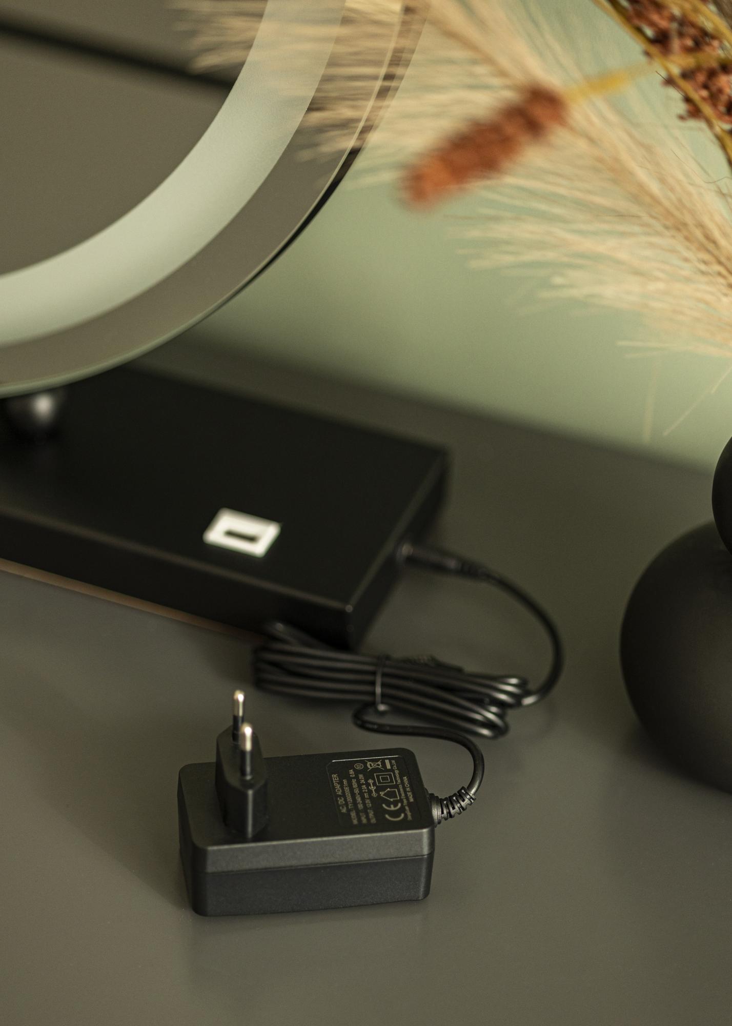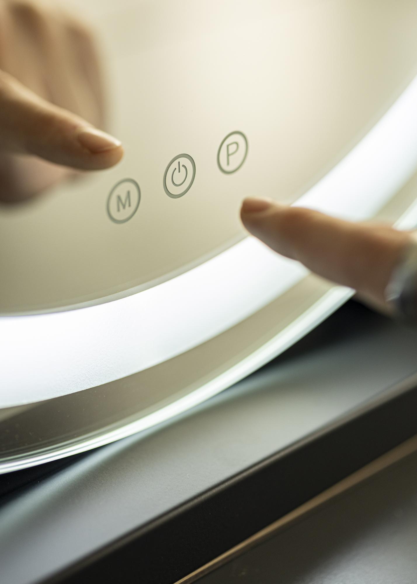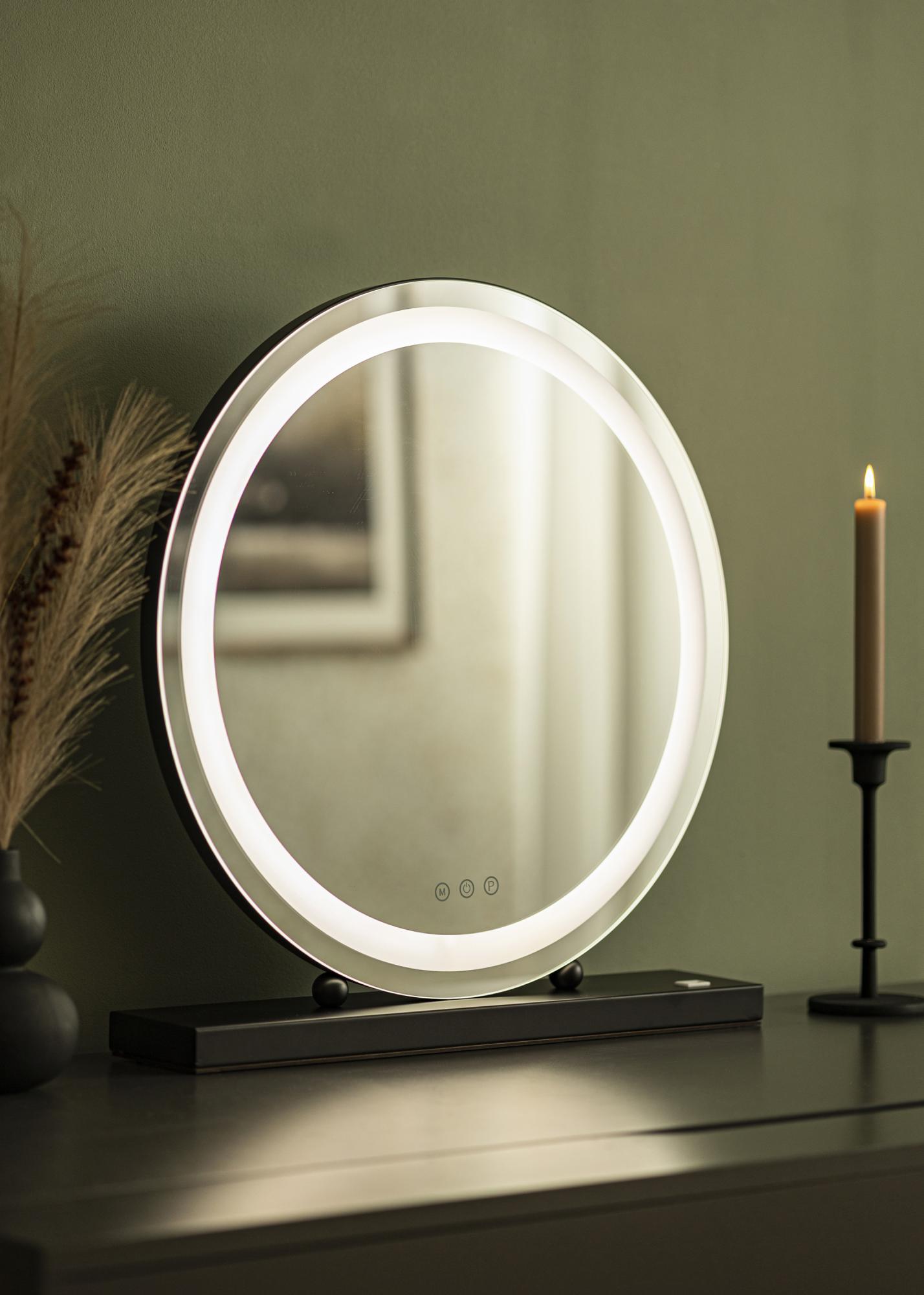 Este es un espejo para tocador en modelo vertical, con un soporte en un color negro neutro que se puede combinar fácilmente con el resto de la decoración. La superficie del espejo tiene una forma redonda clásica con un diámetro de 50 cm, que está elegantemente enmarcada por una tira de LED integrada. Hay tres botones táctiles en el borde inferior del espejo: un botón de encendido/apagado que enciende y apaga la iluminación, un botón "M" que ajusta la temperatura de color de la luz y un botón "P" que te permite regular el brillo de la iluminación según tus preferencias. La conexión eléctrica se realiza mediante un enchufe.