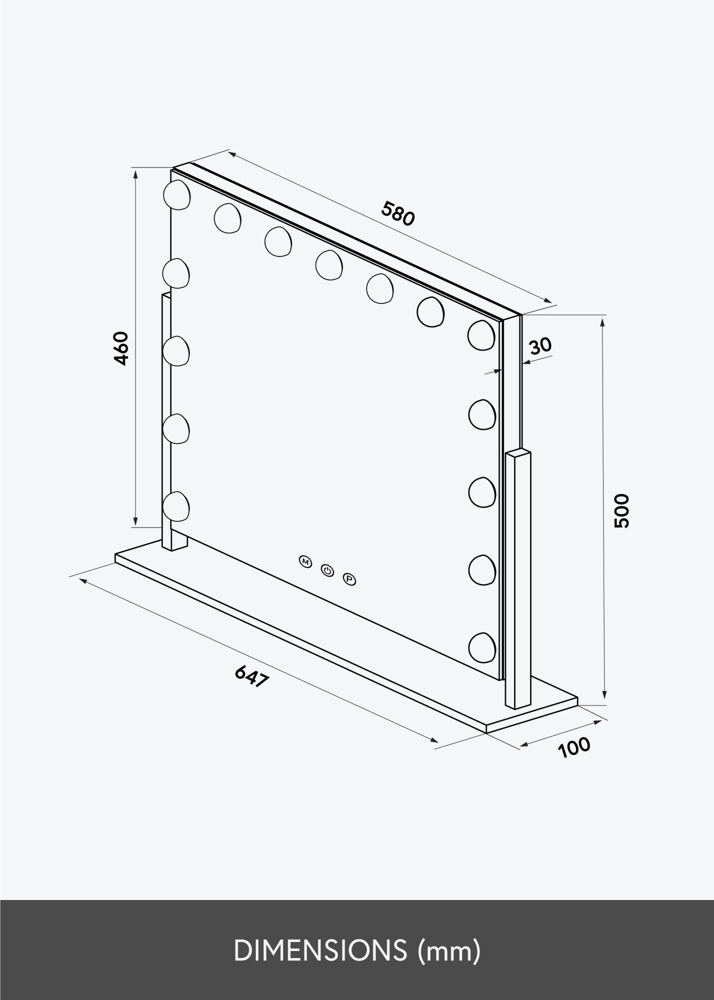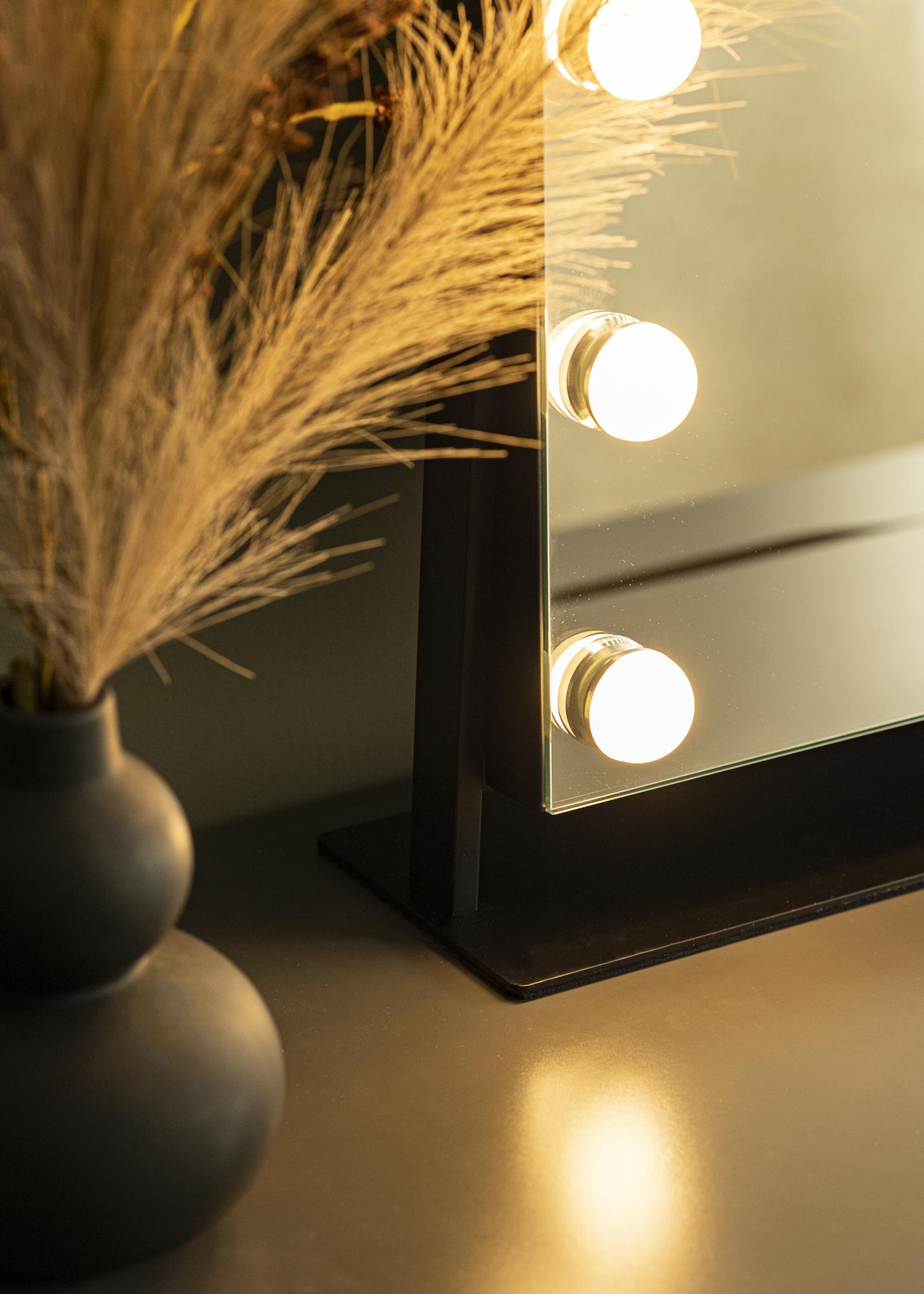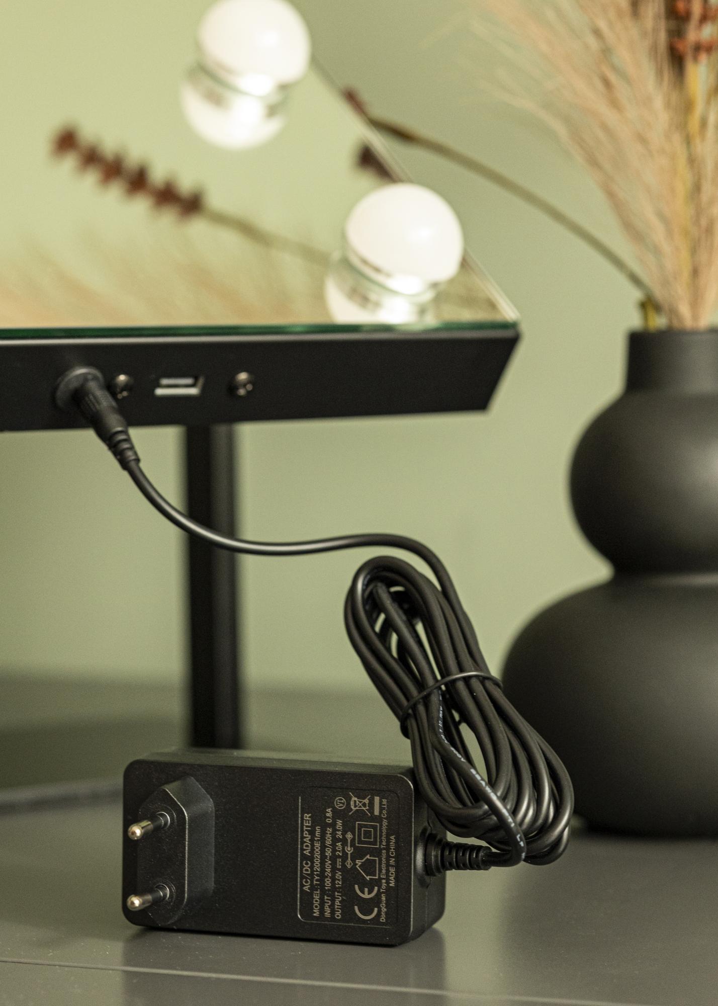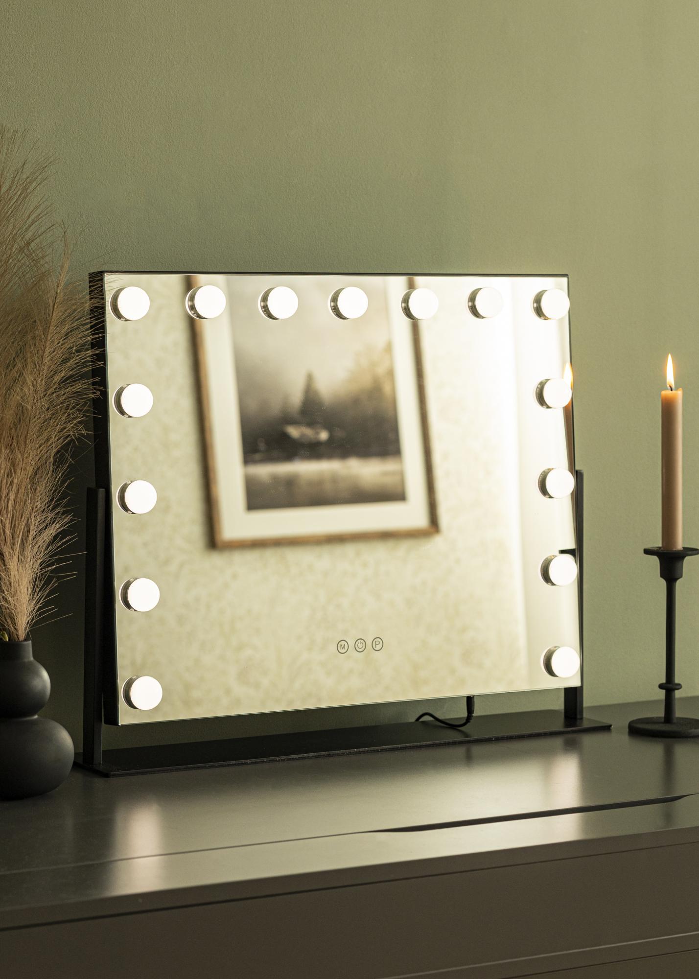 El espejo para tocador está hecho de metal de color negro con un soporte que le permite colocarse de soporte sobre una superficie plana. La superficie del espejo, de 58x46 cm, se puede inclinar a la posición que prefieras. En la parte inferior del espejo hay un puerto USB para que puedas cargar tu smartphone mientras te maquillas.