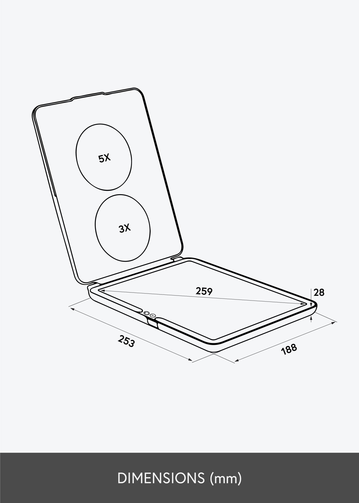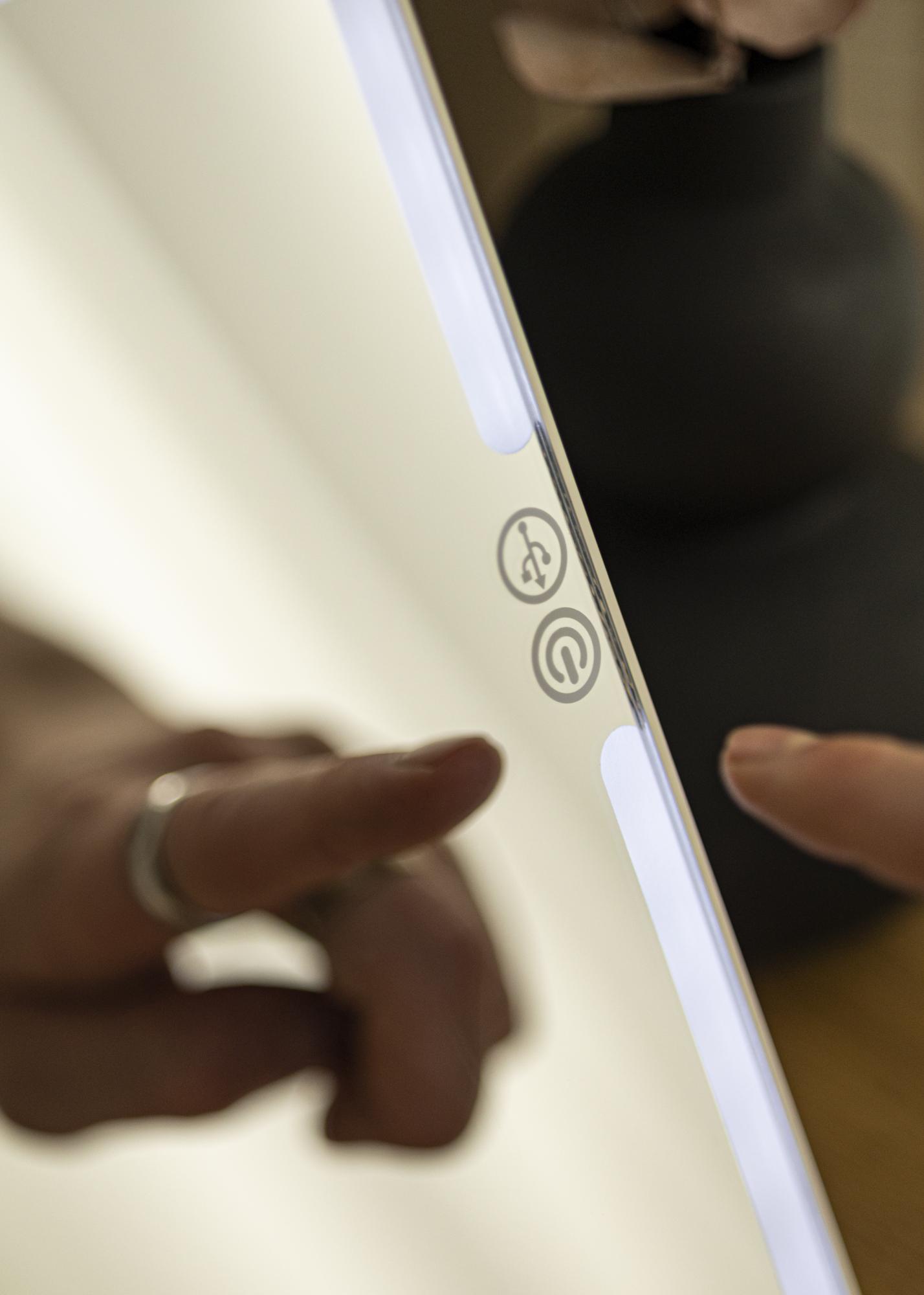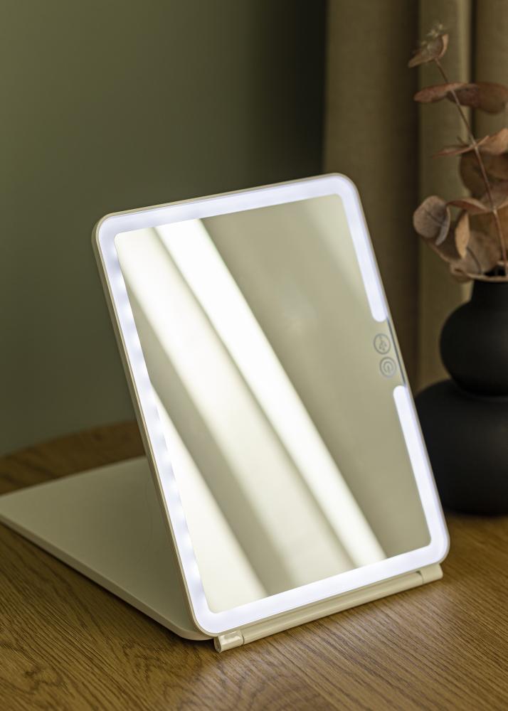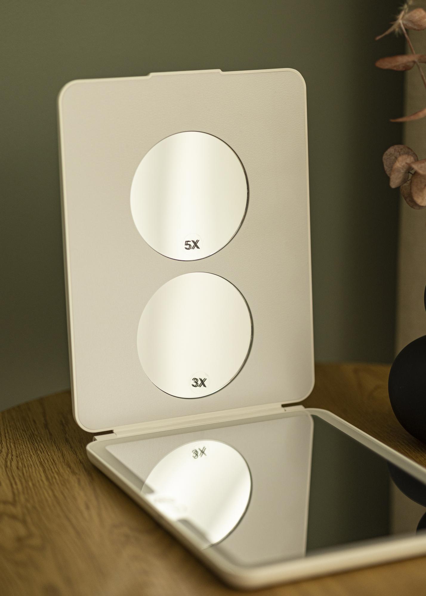 Este es un espejo para tocador en un formato más pequeño, con un diseño plegable inteligente que te permite ajustar fácilmente el ángulo del espejo cuando lo uses. El diseño plegable también ahorra espacio y protege la superficie del espejo cuando está guardado en el bolso. Es un espejo excelente para llevar contigo cuando estás de viaje, ya que es compacto, ligero y tiene iluminación incorporada que proporciona una luz uniforme en tu rostro cuando te miras en el espejo. La iluminación se enciende y apaga con un botón táctil en el marco del espejo. Si mantienes presionado el botón durante unos segundos, puedes ajustar la intensidad de la luz y la temperatura de color.
