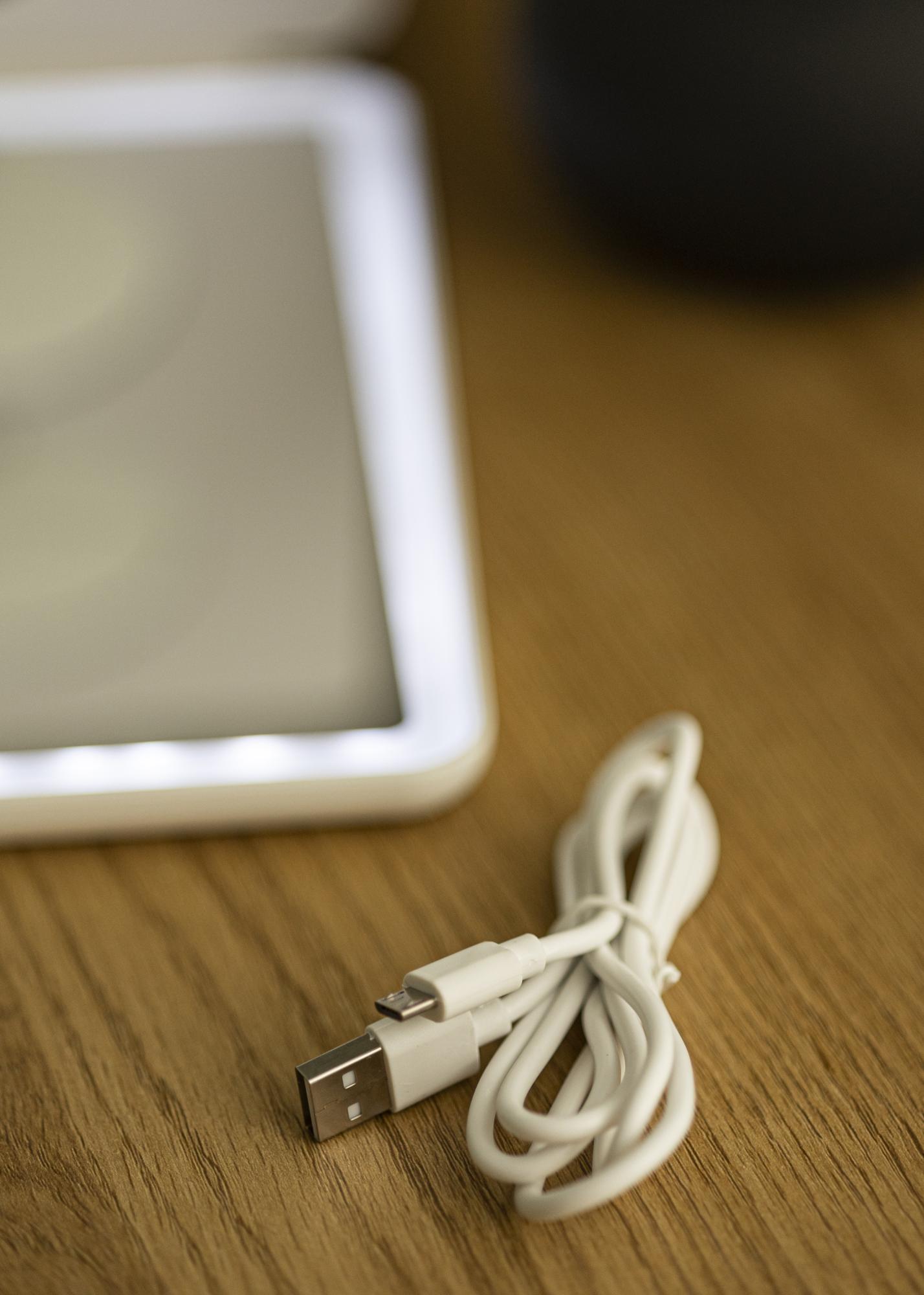 Cuando el espejo encendido se pliega, automáticamente entra en modo de ahorro de energía hasta que vuelvas a abrir el espejo. Este espejo para tocador funciona con batería y se carga a través de una conexión USB.