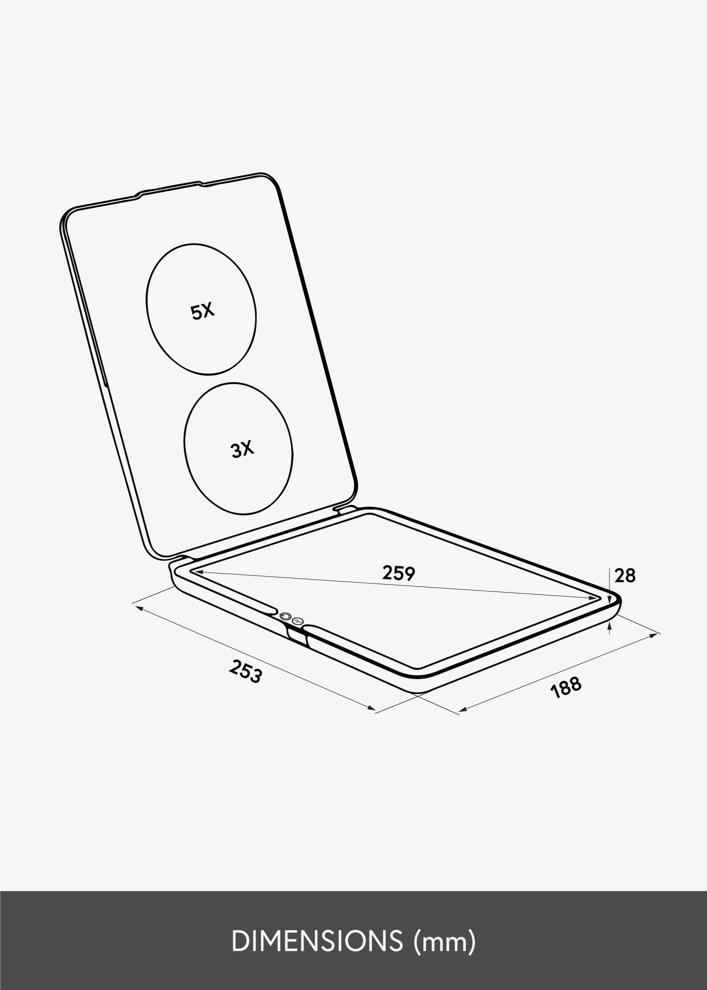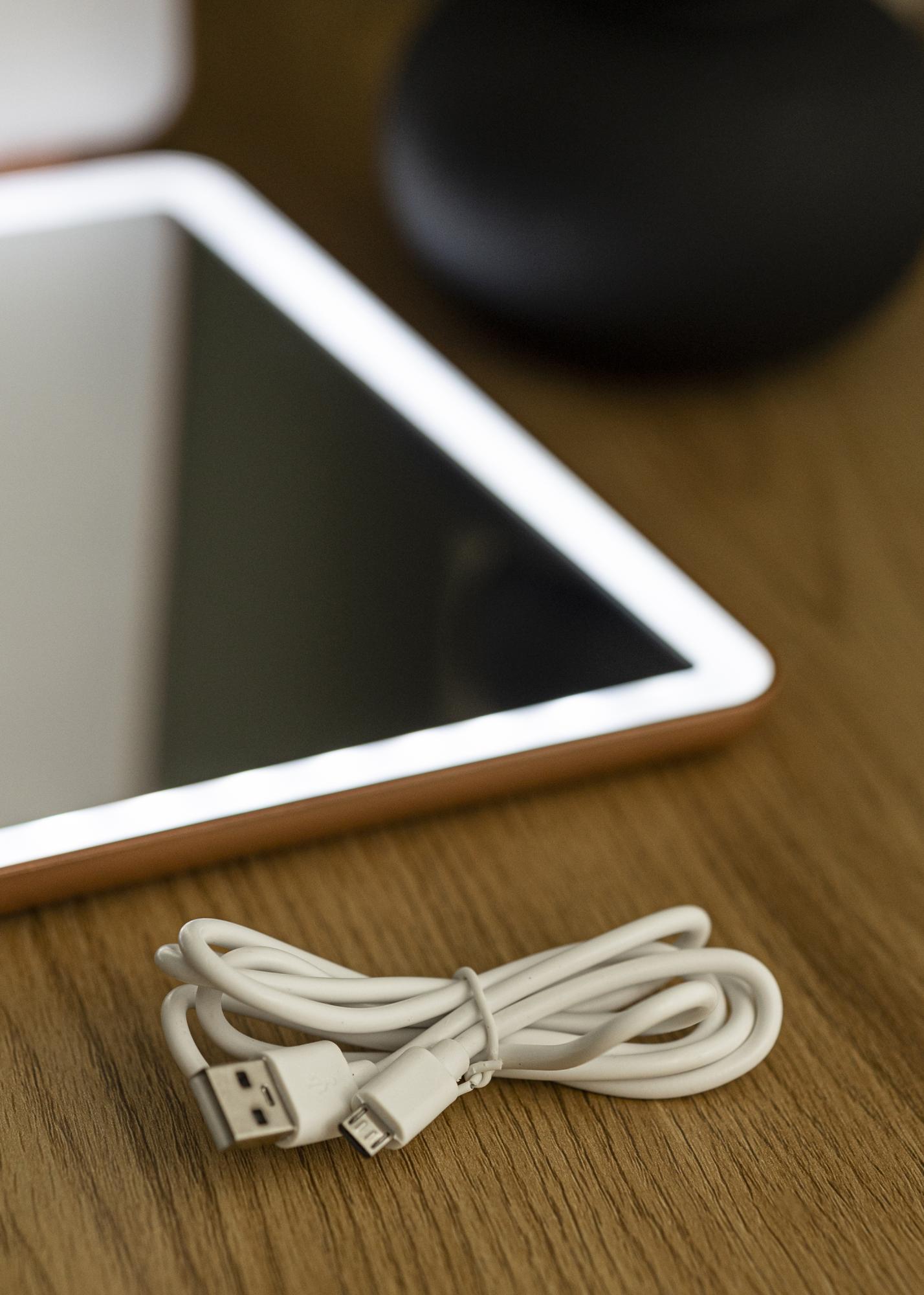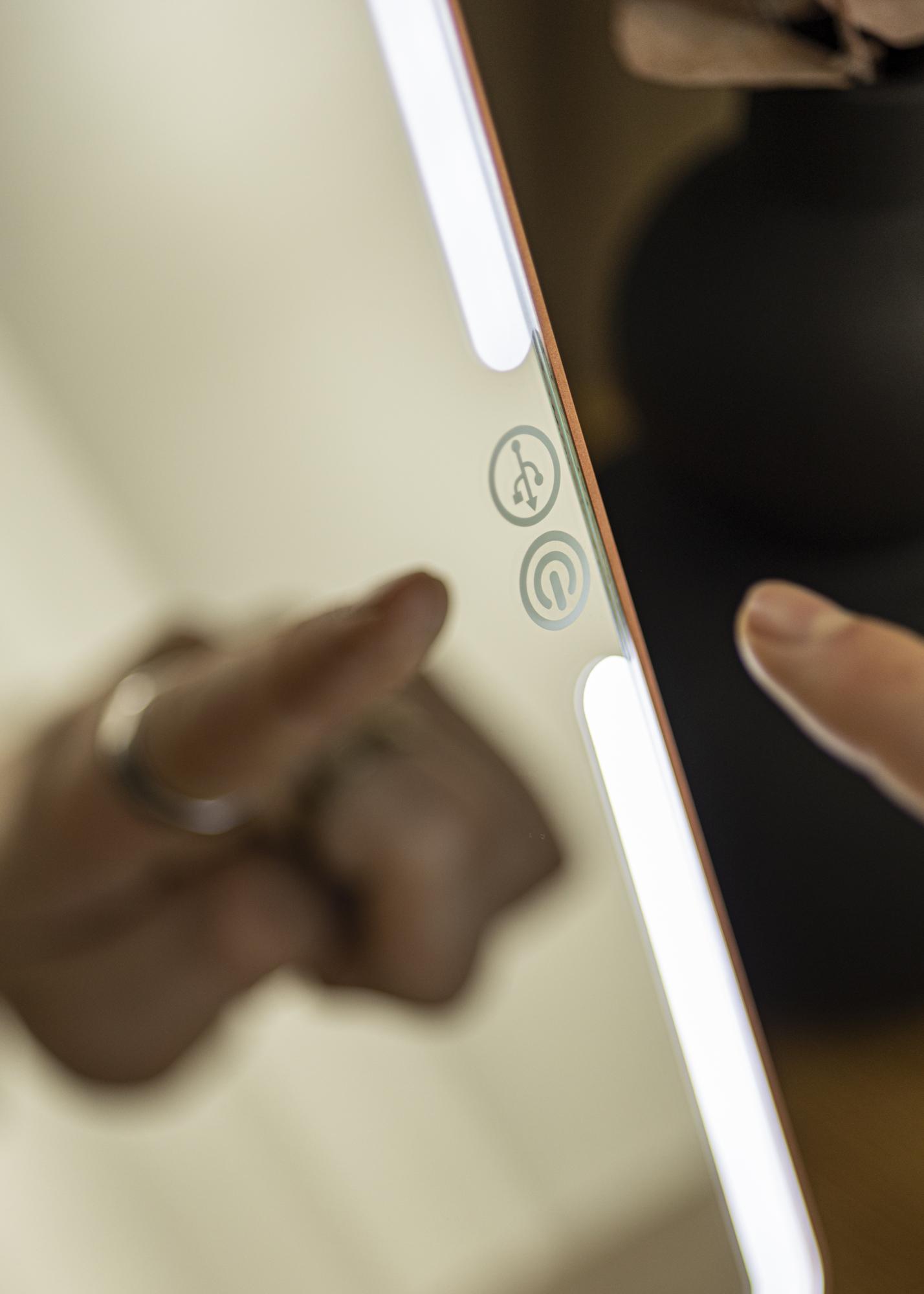 La tira de LED incorporada proporciona una luz agradable cuando te estás maquillando. La iluminación funciona con una batería incorporada que se carga fácilmente a través de una conexión USB. El espejo está equipado con un botón táctil que se utiliza para encender y apagar la iluminación, así como para ajustar la intensidad de la luz. Si cierras el espejo cuando está encendido, se activa automáticamente el modo de ahorro de energía y la lámpara se apaga hasta que vuelvas a abrir el espejo.