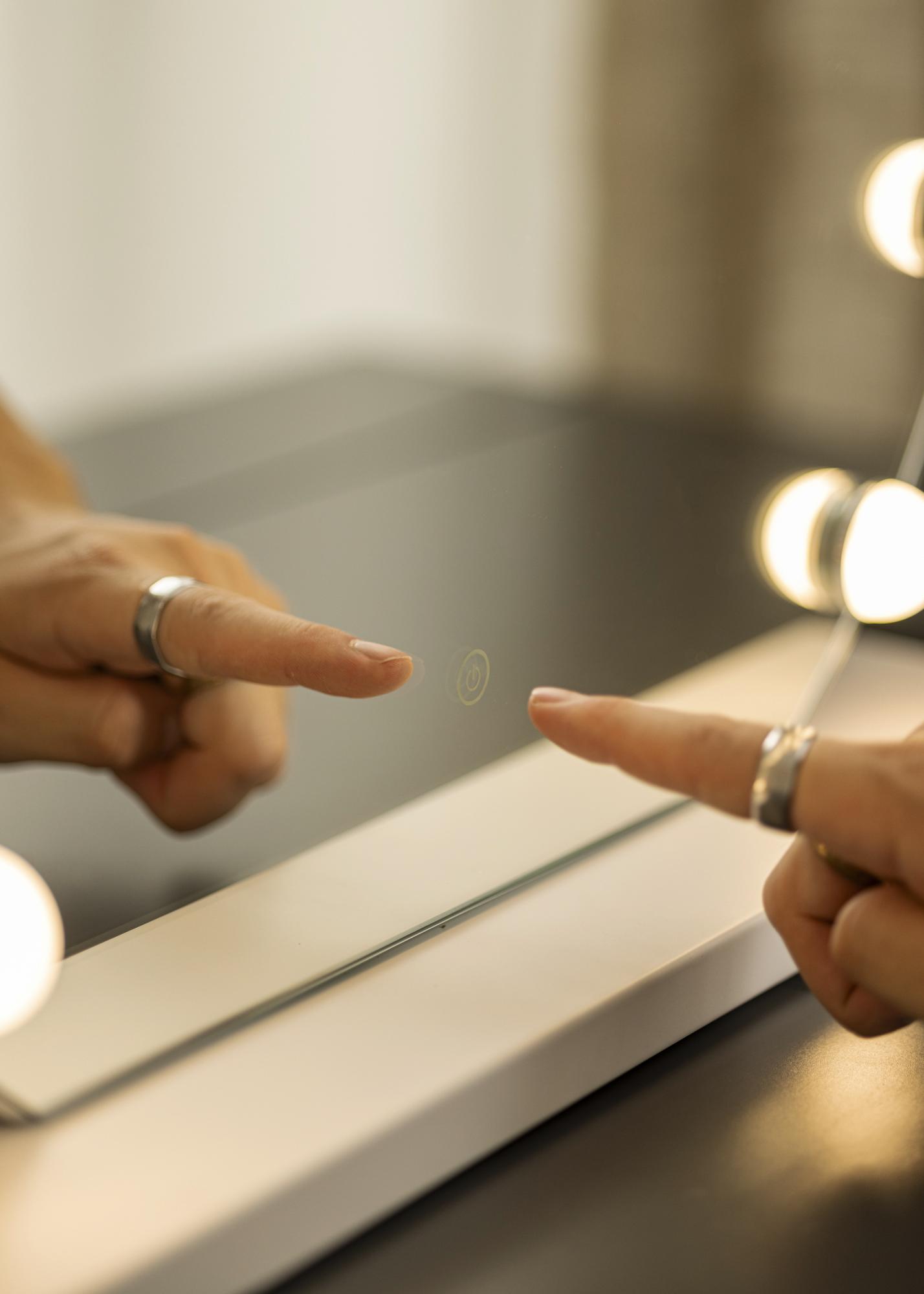 ¡Un elegante y lujoso espejo para tocador en un tono blanco elegante que irradia una fuerte sensación de Hollywood! El espejo para tocador tiene 12 bombillas LED decorativas que proporcionan una luz blanca uniforme y cálida de 3000K, ¡perfecta para aplicar maquillaje! La iluminación se enciende presionando el botón táctil y se ajusta fácilmente manteniendo presionado el botón durante unos segundos. La iluminación LED es una bombilla de bajo consumo que proporciona una luz natural.