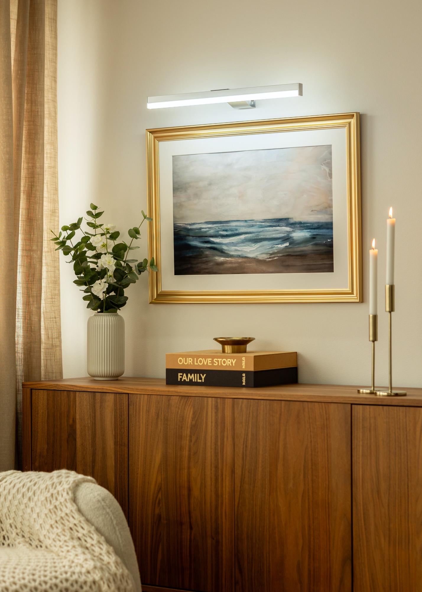 Con su color plateado elegante, esta iluminación de cuadros encaja en la mayoría de interiores y da una impresión moderna. La iluminación se controla fácilmente con un control remoto incluido que te permite ajustar el brillo y configurar un temporizador con intervalos seleccionables de 15, 30 o 60 minutos, lo cual es una manera práctica de ahorrar batería.