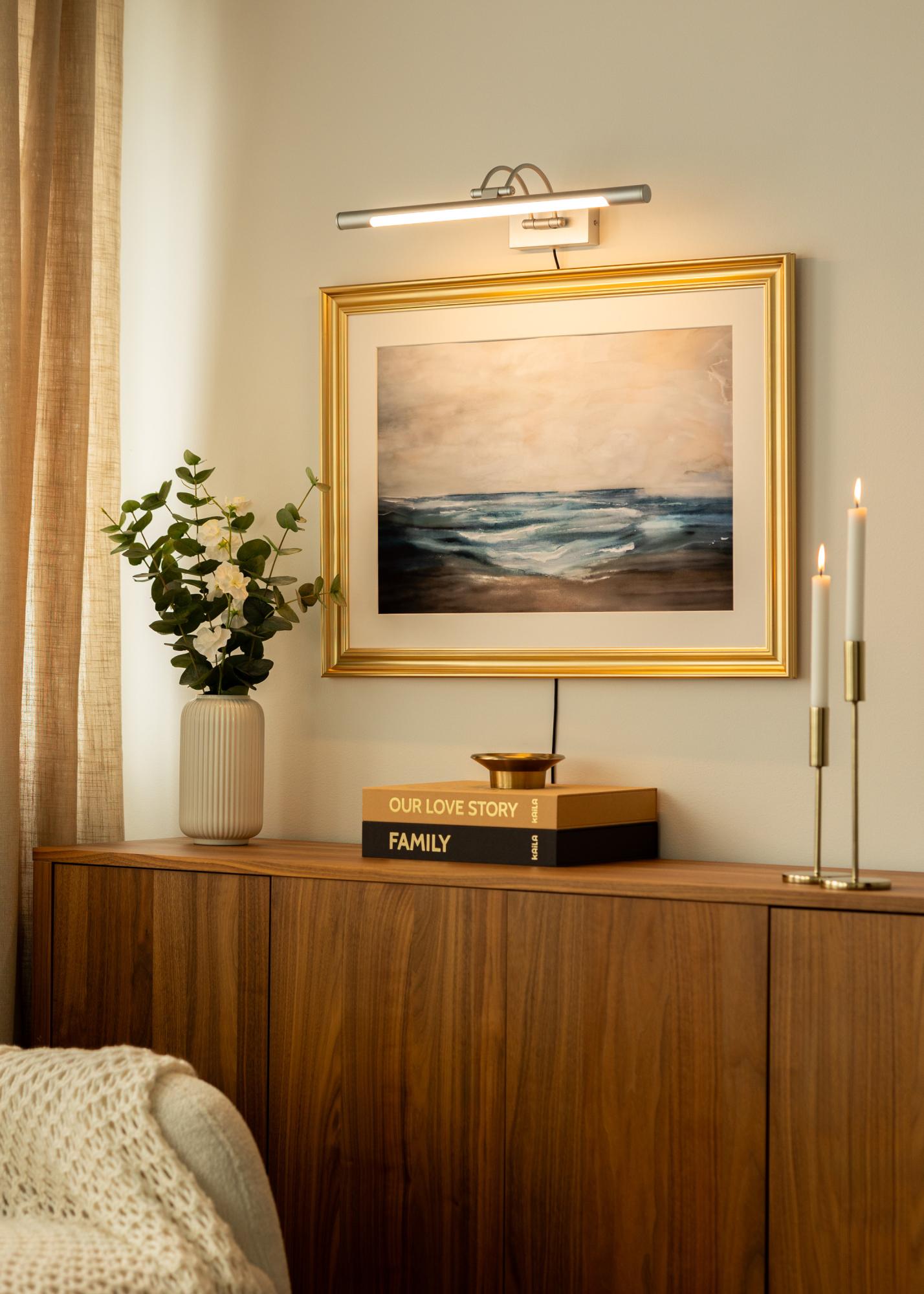 La iluminación está equipada con una función de atenuación que te permite ajustar la intensidad de la luz según diferentes necesidades y estados de ánimo. Esto hace que sea fácil resaltar tu arte de la mejor manera posible, ya prefieras un resplandor suave para la noche o una presentación más brillante durante el día. Con una intensidad lumínica de 520 lúmenes, la iluminación proporciona una luz equilibrada sobre toda la superficie, sin ser intrusiva.