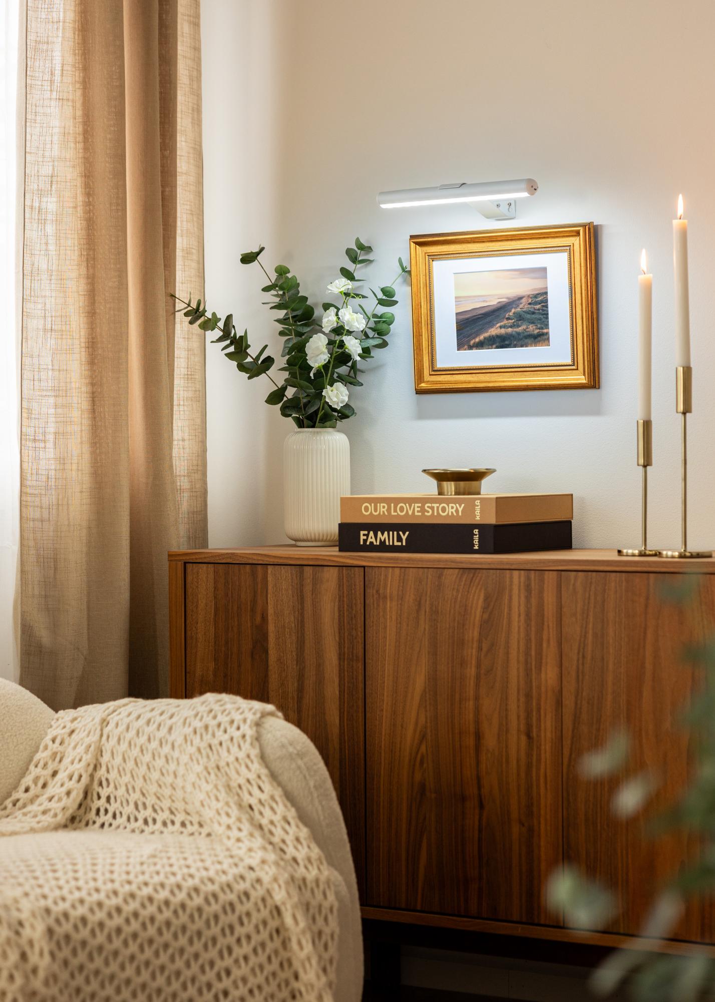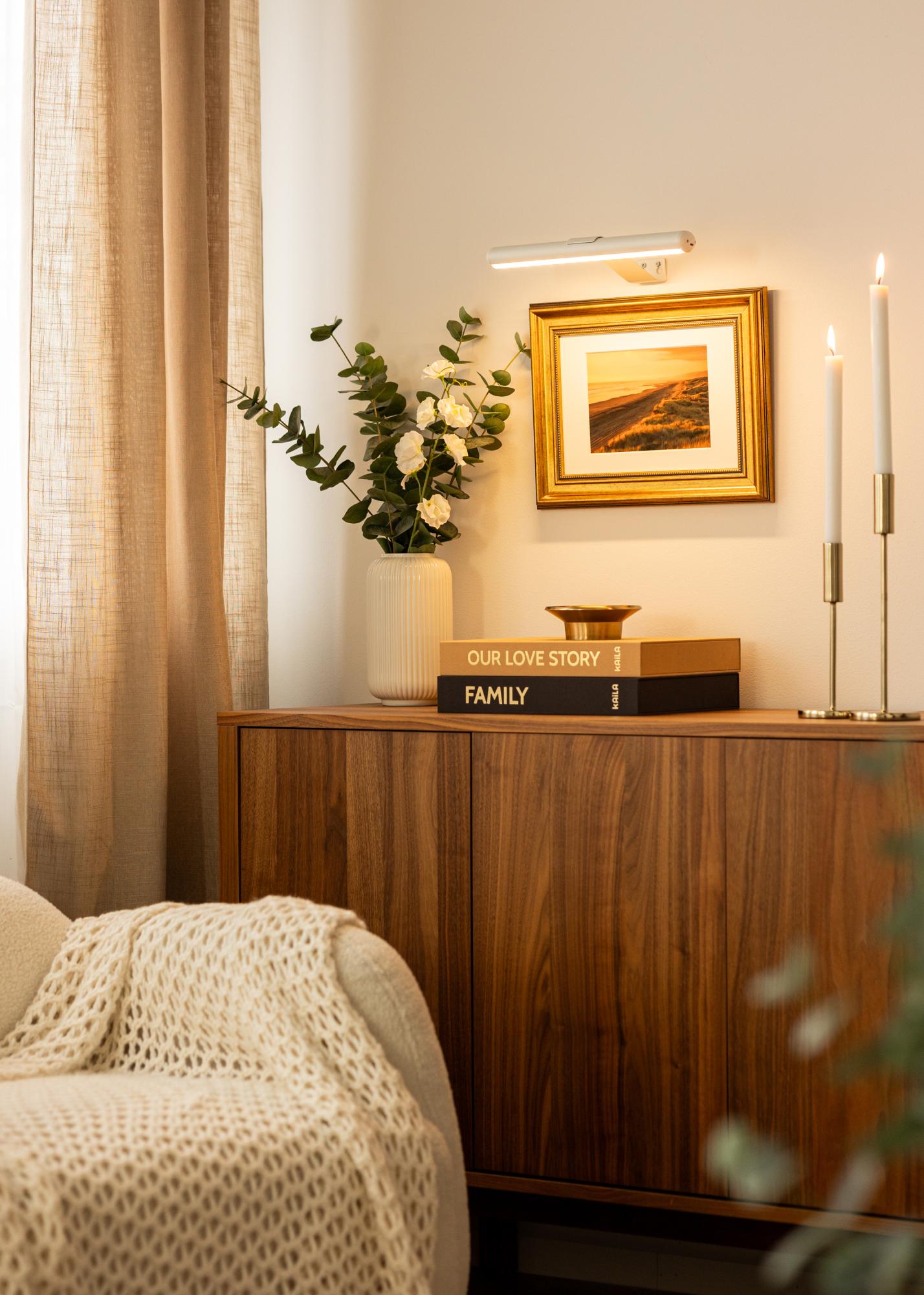 Esta iluminación de cuadros a pilas con diseño blanco ofrece una solución práctica para iluminar tus obras de arte sin necesidad de cables. Gracias a que funciona con baterías, se puede colocar en cualquier lugar sin preocupar por los enchufes, lo que la hace muy flexible. Con una profundidad de 15 cm y una longitud de 33 cm, la iluminación es compacta y fácil de instalar, al mismo tiempo que puede iluminar obras de arte con un ancho de hasta 60 cm.