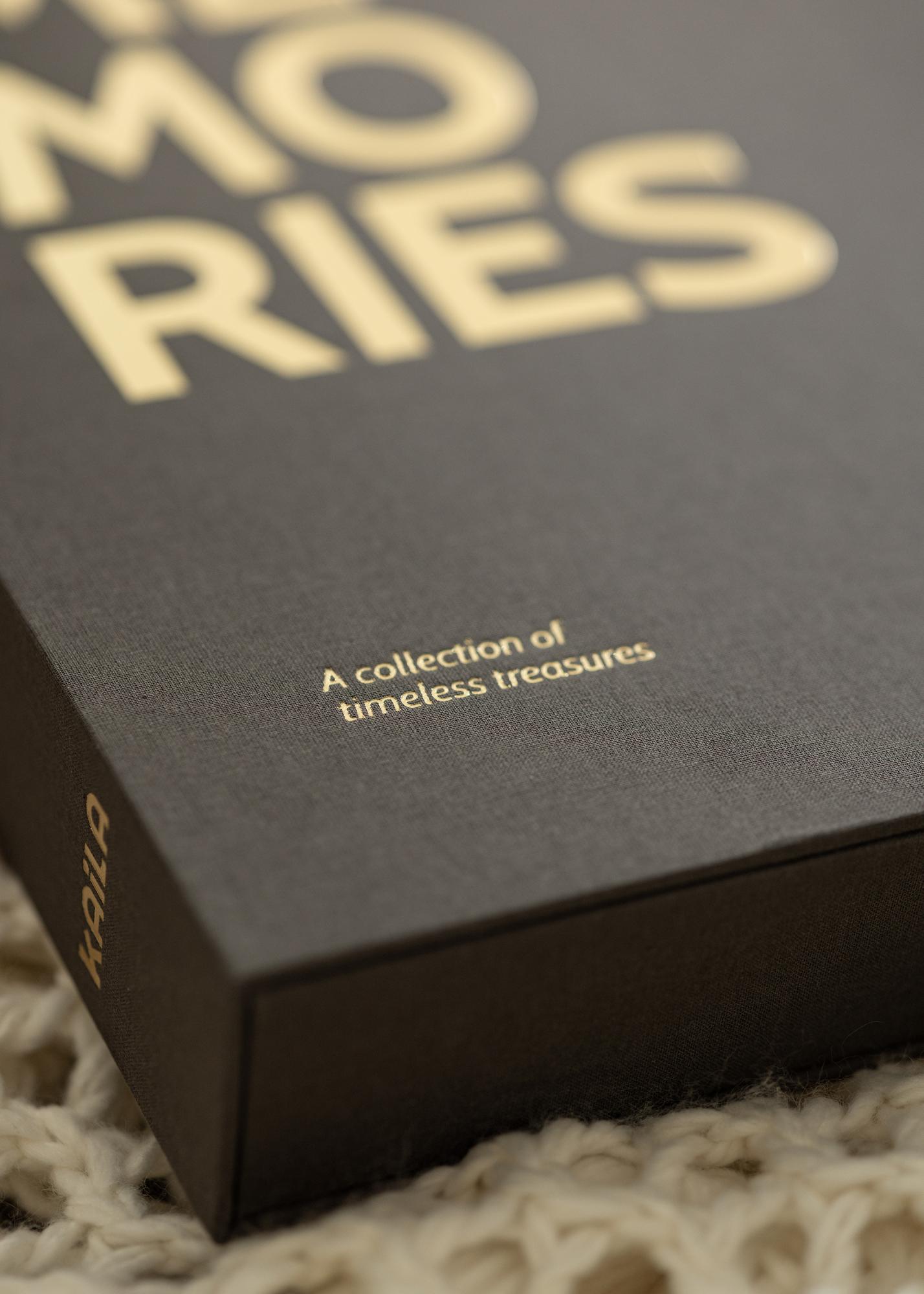 El álbum está elegante cubierto con tela negra y decorado delante y trasero con "recuerdos" en texto de color dorado. El título del álbum también incluye la frase evocadora "Una colección de tesoros atemporales", impreso en la esquina inferior izquierda.