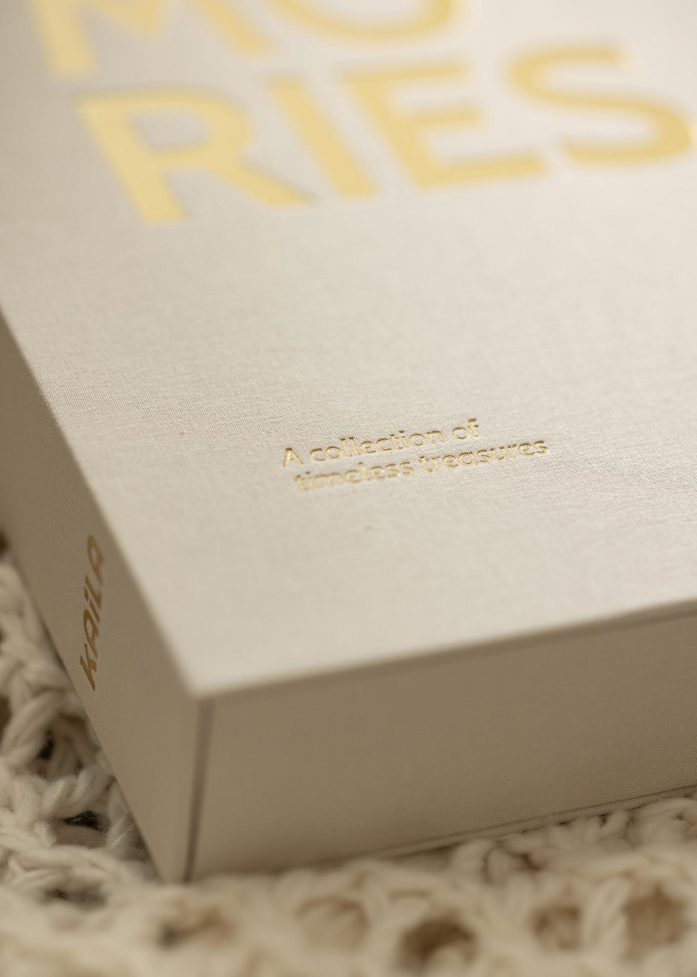 El álbum está elegante cubierto con tela gris claro y delantero y trasero decorados con "recuerdos" en texto de color dorado. El título del álbum también incluye la frase evocadora "Una colección de tesoros atemporales", impreso en la esquina inferior izquierda.