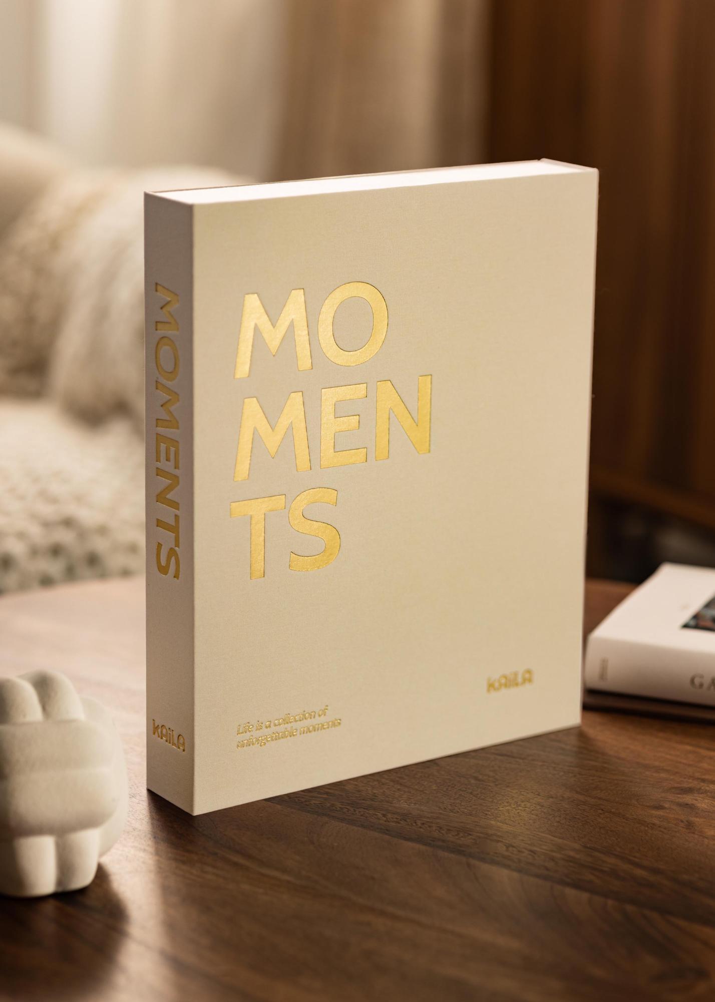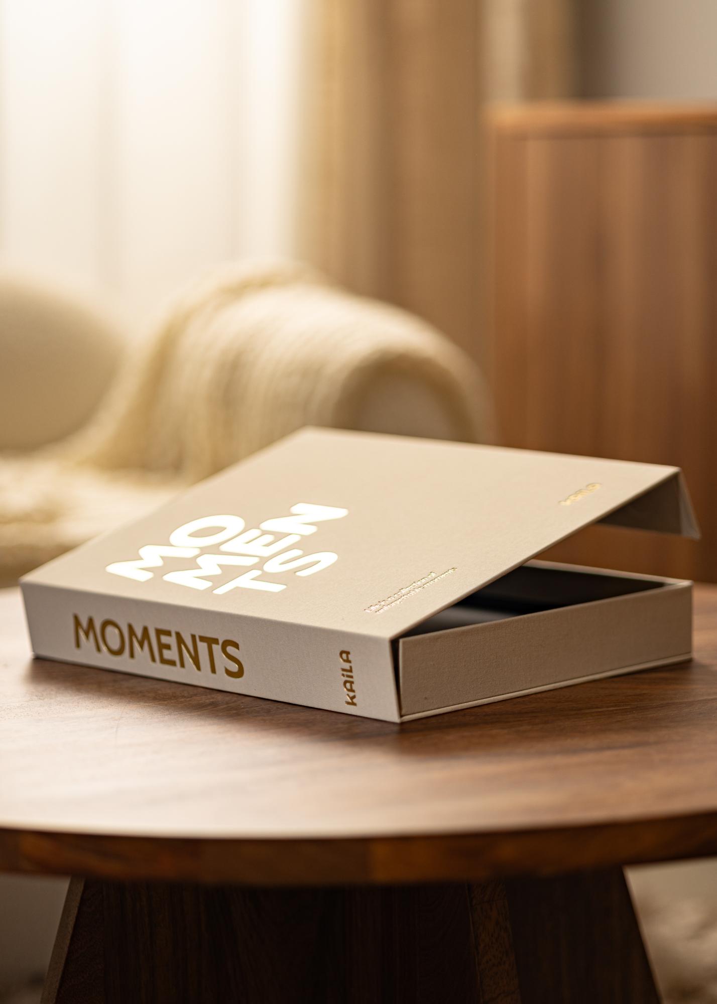 El álbum de fotos está diseñado como una caja que puedes abrir para acceder a tus imágenes. La cubierta está decorada con tela de color crema, lo que le da una sensación de lujo. En la parte delantera y en el lateral se encuentra el texto "MOMENTS". En la esquina superior izquierda de la parte superior se muestra el hermoso subtítulo "La vida es una colección de momentos inolvidables".