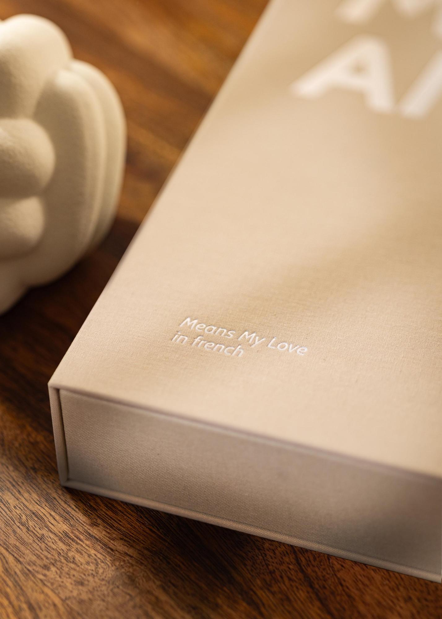 ¿Quieres tener un álbum de fotos moderno que funcione como un elemento de lujo en la decoración de tu hogar? ¡Entonces este Coffee Table Album es perfecto para ti! El álbum está diseñado como una pequeña caja, con una exclusiva cubierta de tela de color beige. El título del álbum, "MON AMOUR", le da un toque romántico a la expresión por lo demás minimalista. El subtítulo en la esquina izquierda del álbum dice "Means My Love in French".
