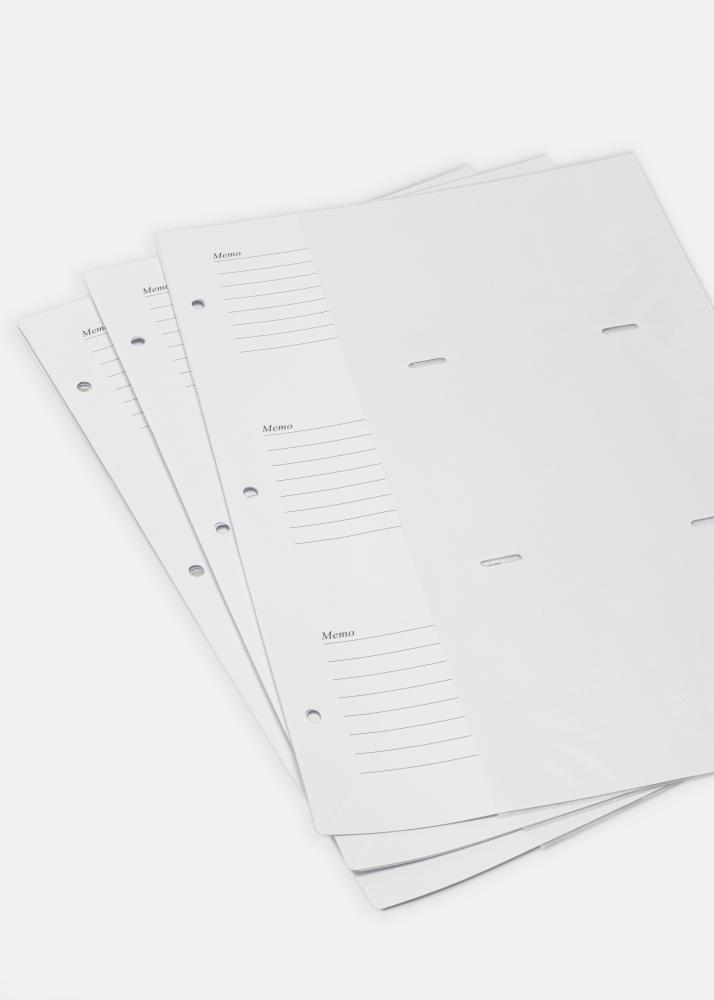 Páginas de álbum compatibles con nuestra moderna serie de álbumes KAILA Coffee Table Album XL. Las páginas blancas del álbum pueden contener 60 fotos de tamaño 10x15 cm y tienen un espacio de escritura junto a cada foto para que puedas escribir recuerdos y notas para cada fotografía.