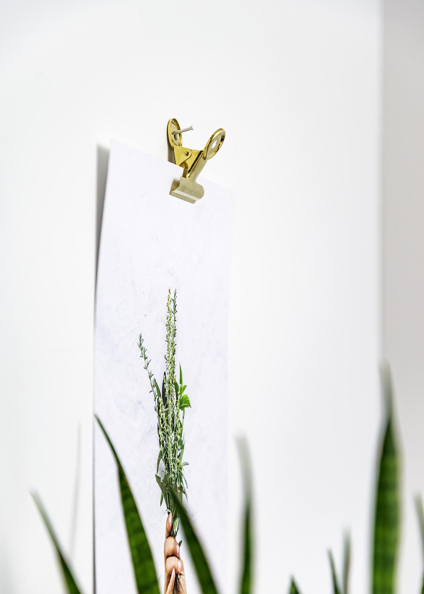 Un gancho de metal con un elegante y brillante acabado dorado que le da a tus pósters y láminas una suspensión moderna y minimalista. El diseño del clip para pósters es elegante, y los agujeros en la parte superior redonda del clip hacen que sea fácil de colgar a la pared con un pequeño clavo o tornillo. La abertura del clip tiene un agarre sólido que te permite colgar incluso el papel más fino, al mismo tiempo que también es flexible y permite montar imágenes de diferentes grosores. Si tienes un póster grande que quieres colgar, utiliza dos clips de metal para obtener los mejores resultados.