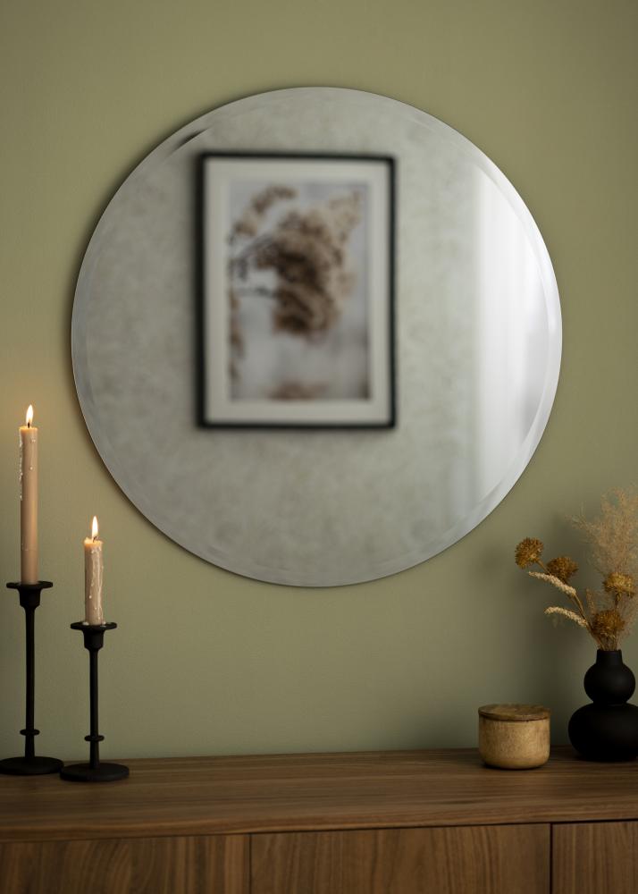La elegante sensación que la forma y el color del espejo transmiten se ve reforzada por el hecho de que el espejo no tiene marco. En su lugar, los bordes están adornados con un borde facetado ordenado, que le da al espejo ese toque especial.