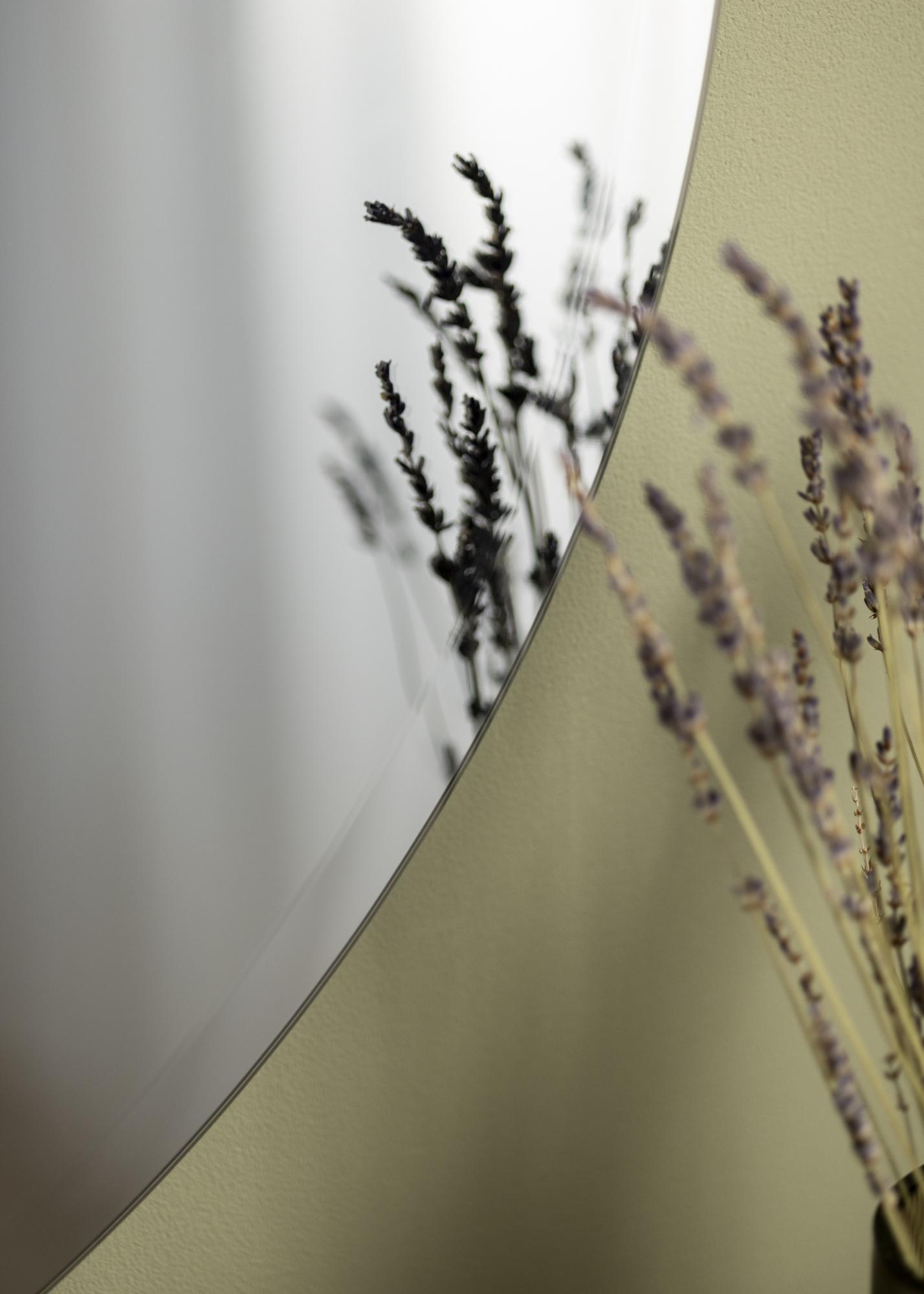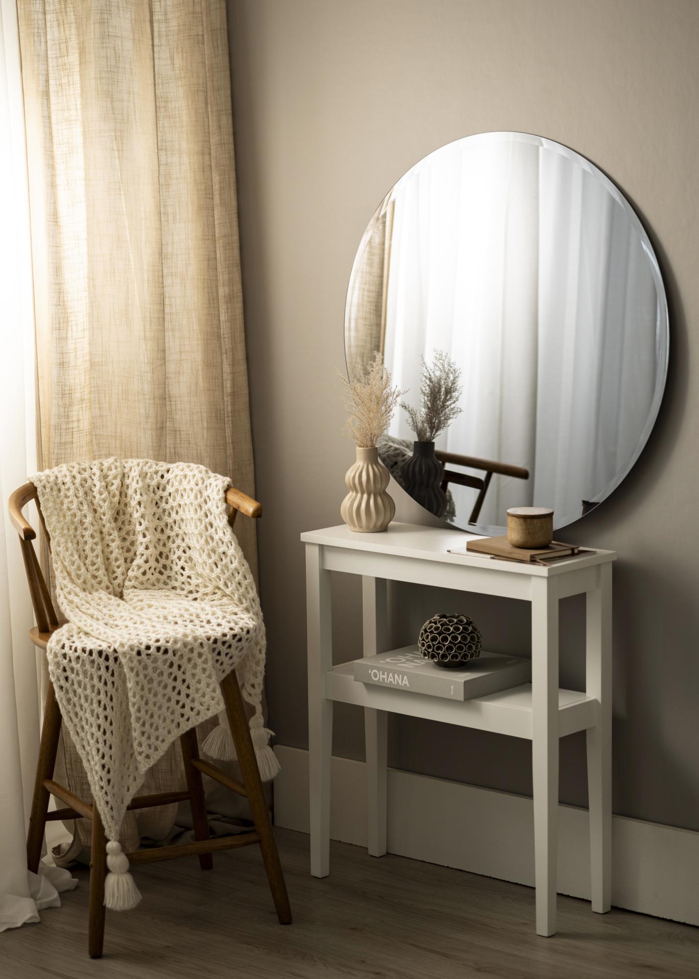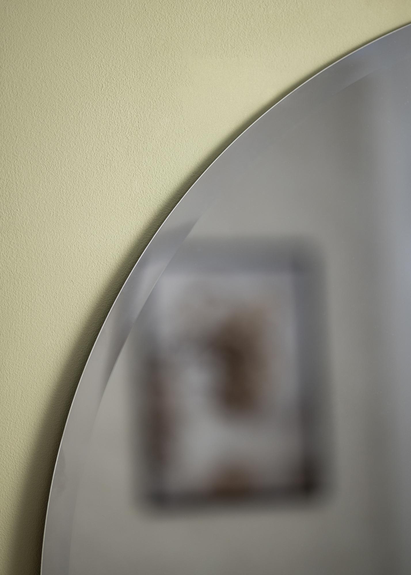 La elegante sensación que la forma y el color del espejo transmiten se ve reforzada por el hecho de que el espejo no tiene marco. En su lugar, los bordes están adornados con un borde facetado ordenado, que le da al espejo ese toque especial.