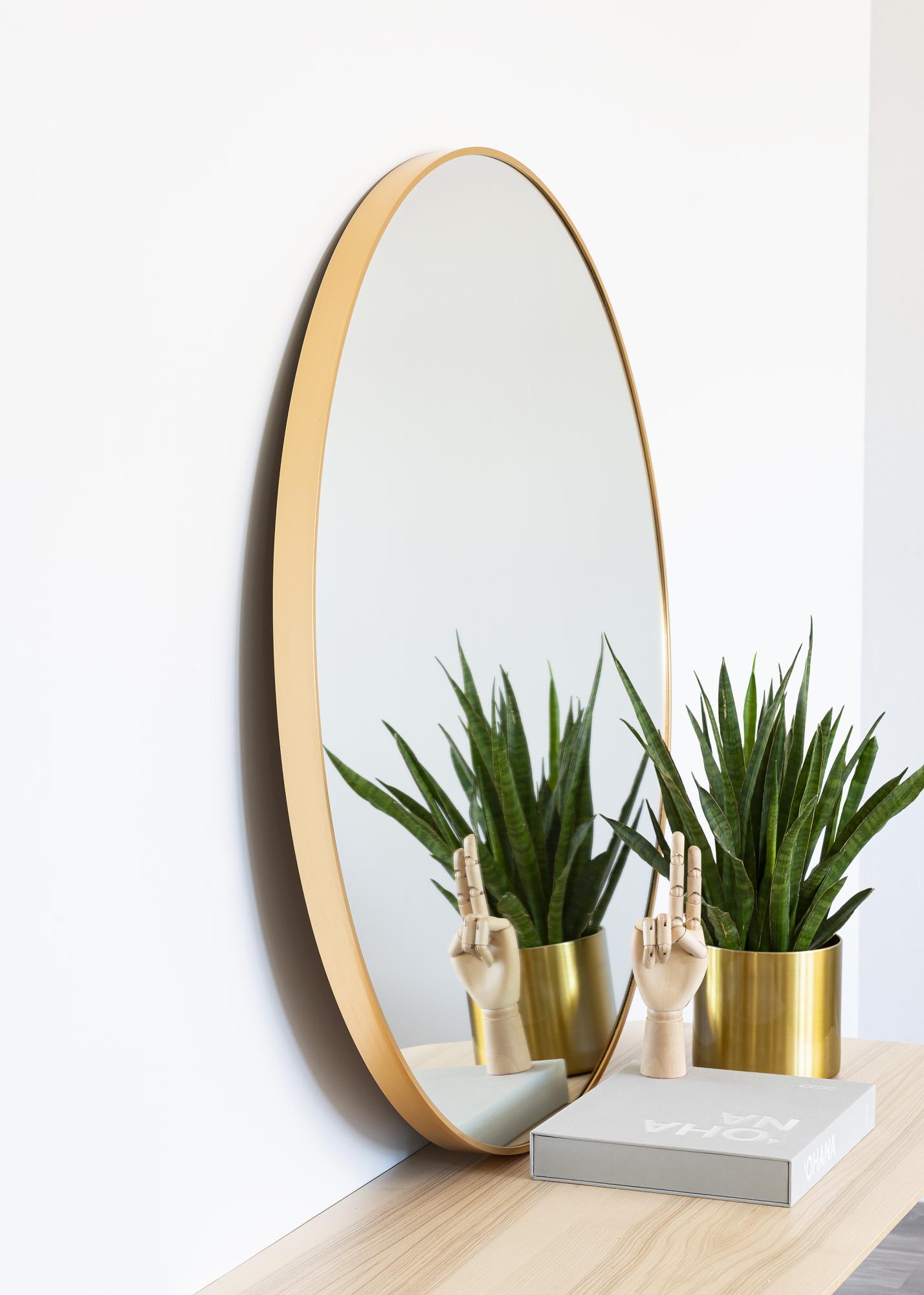 Un espejo redondo de diseño elegante sueco con un marco de metal en un hermoso acabado dorado. El marco tiene una superficie cepillada, lo que le da al hermoso color dorado un aspecto un poco más mate. El marco también es fino y a la moda, pero al mismo tiempo, dependiendo del tamaño, tiene una profundidad de entre 30-40 mm, lo que hace que sobresalga un poco de la pared y crea un efecto 3D fascinante. La profundidad del marco también hace que el espejo se sienta sólido y resistente, sin quitarle la sensación minimalista.