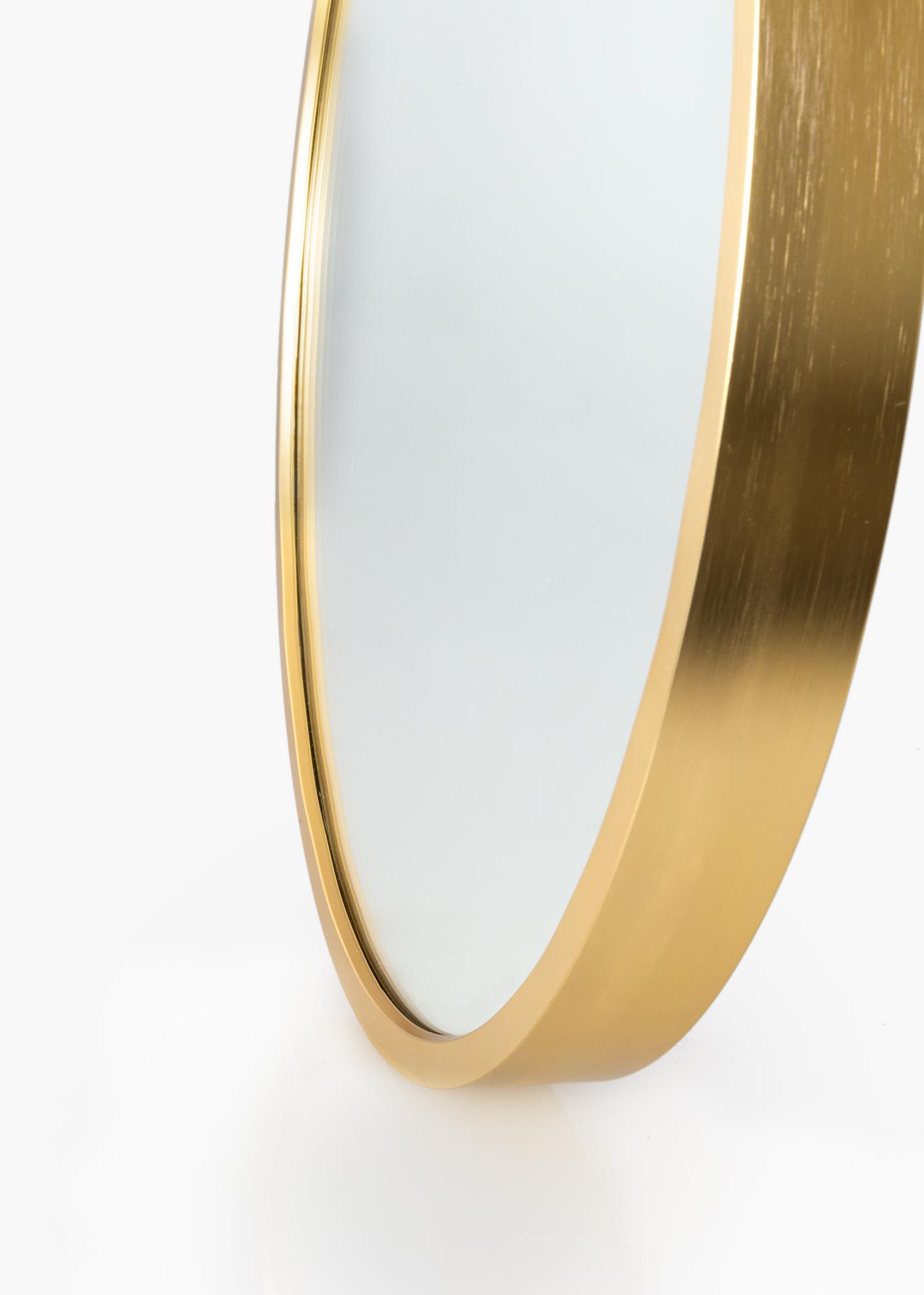 Un espejo redondo de diseño elegante sueco con un marco de metal en un hermoso acabado dorado. El marco tiene una superficie cepillada, lo que le da al hermoso color dorado un aspecto un poco más mate. El marco también es fino y a la moda, pero al mismo tiempo, dependiendo del tamaño, tiene una profundidad de entre 30-40 mm, lo que hace que sobresalga un poco de la pared y crea un efecto 3D fascinante. La profundidad del marco también hace que el espejo se sienta sólido y resistente, sin quitarle la sensación minimalista.
