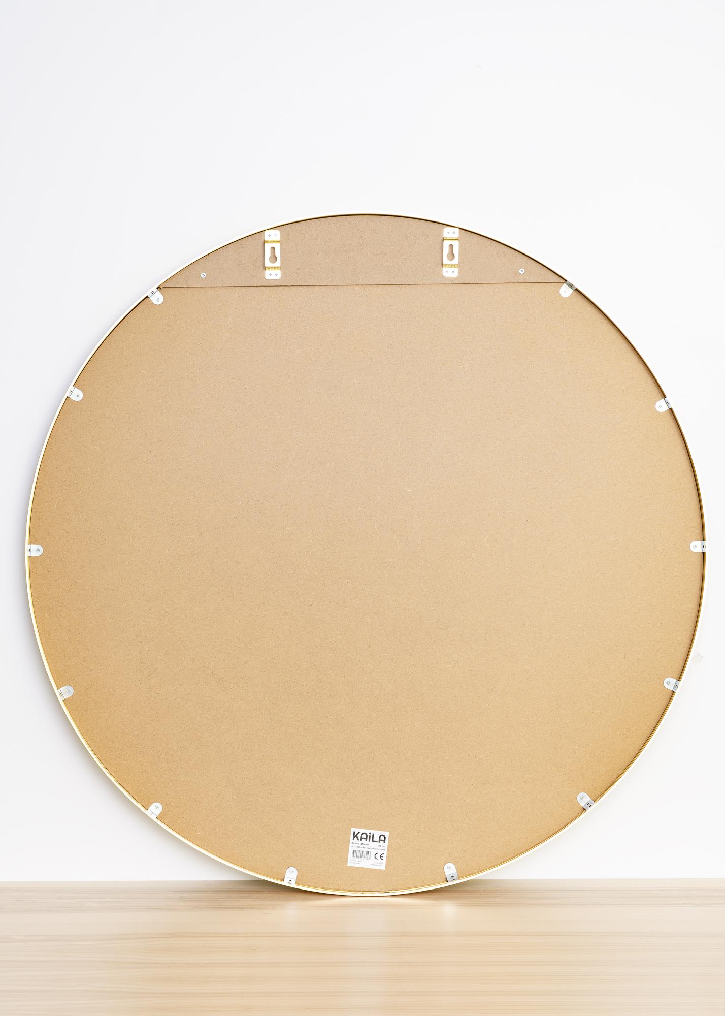 El espejo redondo KAILA Edge Dorado está disponible en varios tamaños, y este espejo tiene un diámetro de 110 cm. El reverso del espejo está equipado con dos soportes de pared para una fácil y estable colocación en la pared, y se incluyen tornillos y tacos adecuados.