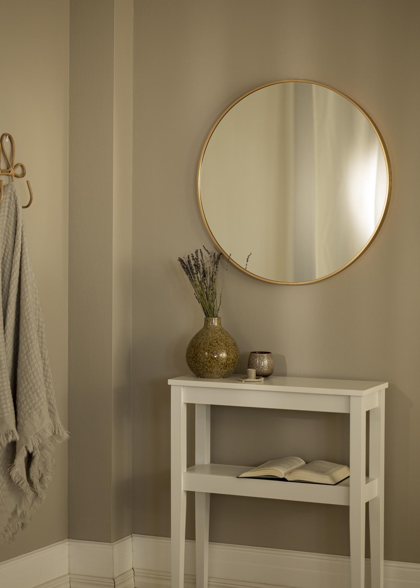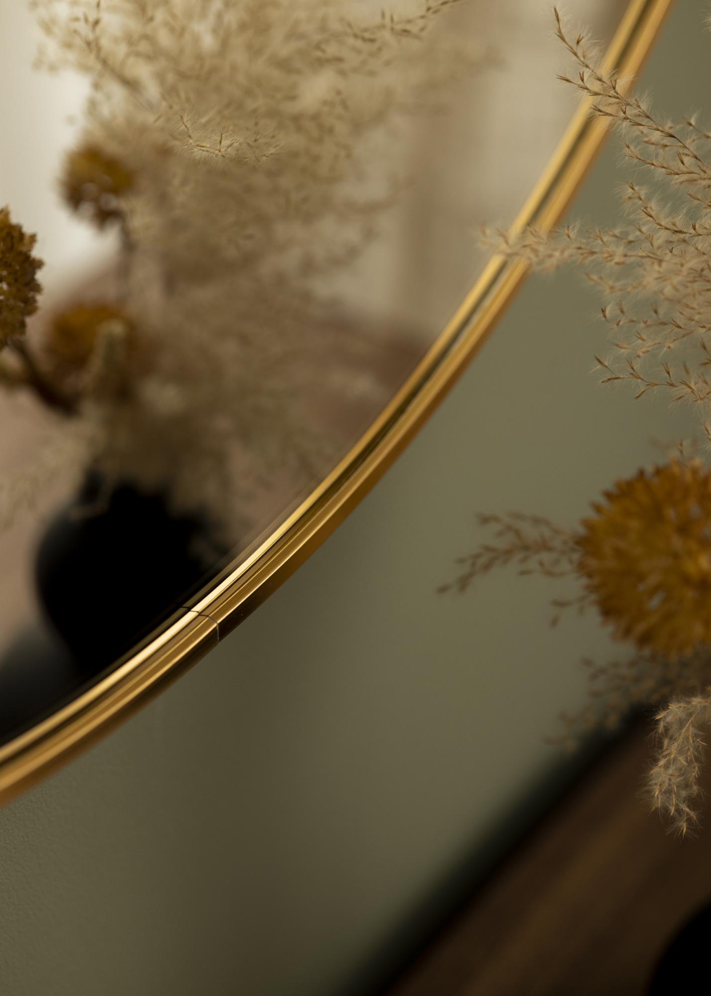 Un espejo redondo de diseño elegante sueco con un marco de metal en un hermoso acabado dorado. El marco tiene una superficie cepillada, lo que le da al hermoso color dorado un aspecto un poco más mate. El marco también es fino y a la moda, pero al mismo tiempo, dependiendo del tamaño, tiene una profundidad de entre 30-40 mm, lo que hace que sobresalga un poco de la pared y crea un efecto 3D fascinante. La profundidad del marco también hace que el espejo se sienta sólido y resistente, sin quitarle la sensación minimalista.