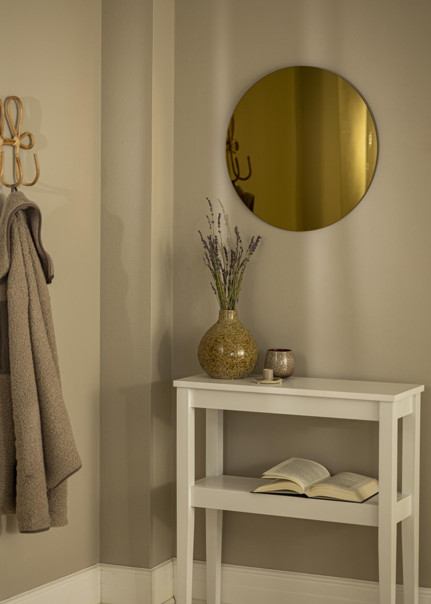 KAILA Espejo Redondo Dorado es un ejemplo perfecto de cómo la forma elegante se encuentra con detalles llamativos. Este espejo redondo es fino y no tiene marco, lo que le da un aspecto moderno y minimalista. Esto se combina con un hermoso vidrio de espejo tono dorado que realza el conjunto y hace que el espejo sea llamativo y con buen gusto.