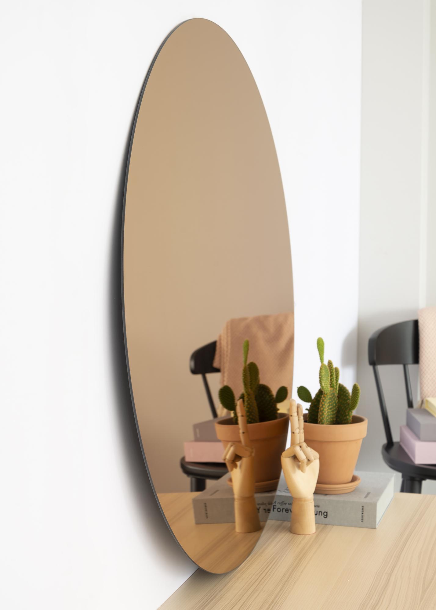Cuando la forma elegante se encuentra con detalles llamativos, el resultado puede ser mágico, como en el caso de este espejo redondo. El espejo es fino y no tiene marco, lo que le da una apariencia minimalista, al mismo tiempo que el vidrio del espejo en tono dorado rosa lo hace muy llamativo. ¡Es un diseño clásico con un toque moderno!