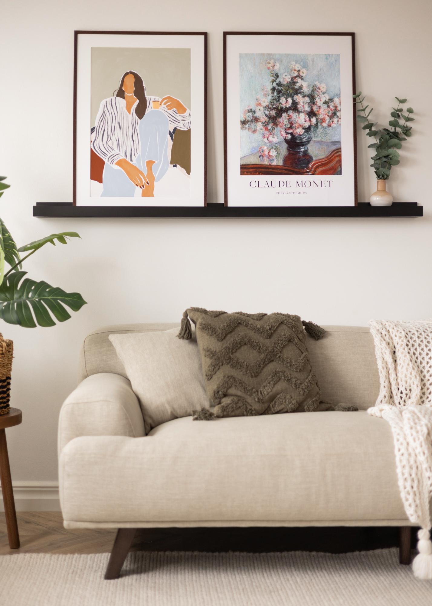 ¡Muestra y varía tu arte de pared de manera sencilla y elegante con un estante para cuadros elegante! Este estante para cuadros está hecho de MDF y está pintado de negro de moda con un acabado fino y semibrillante. La repisa para cuadros tiene un diseño elegante con líneas rectas y simples y una sensación minimalista. La repisa tiene una ranura fresada en el medio que sirve de soporte para tus cuadros y les da un ángulo elegante donde se apoyan contra la pared.