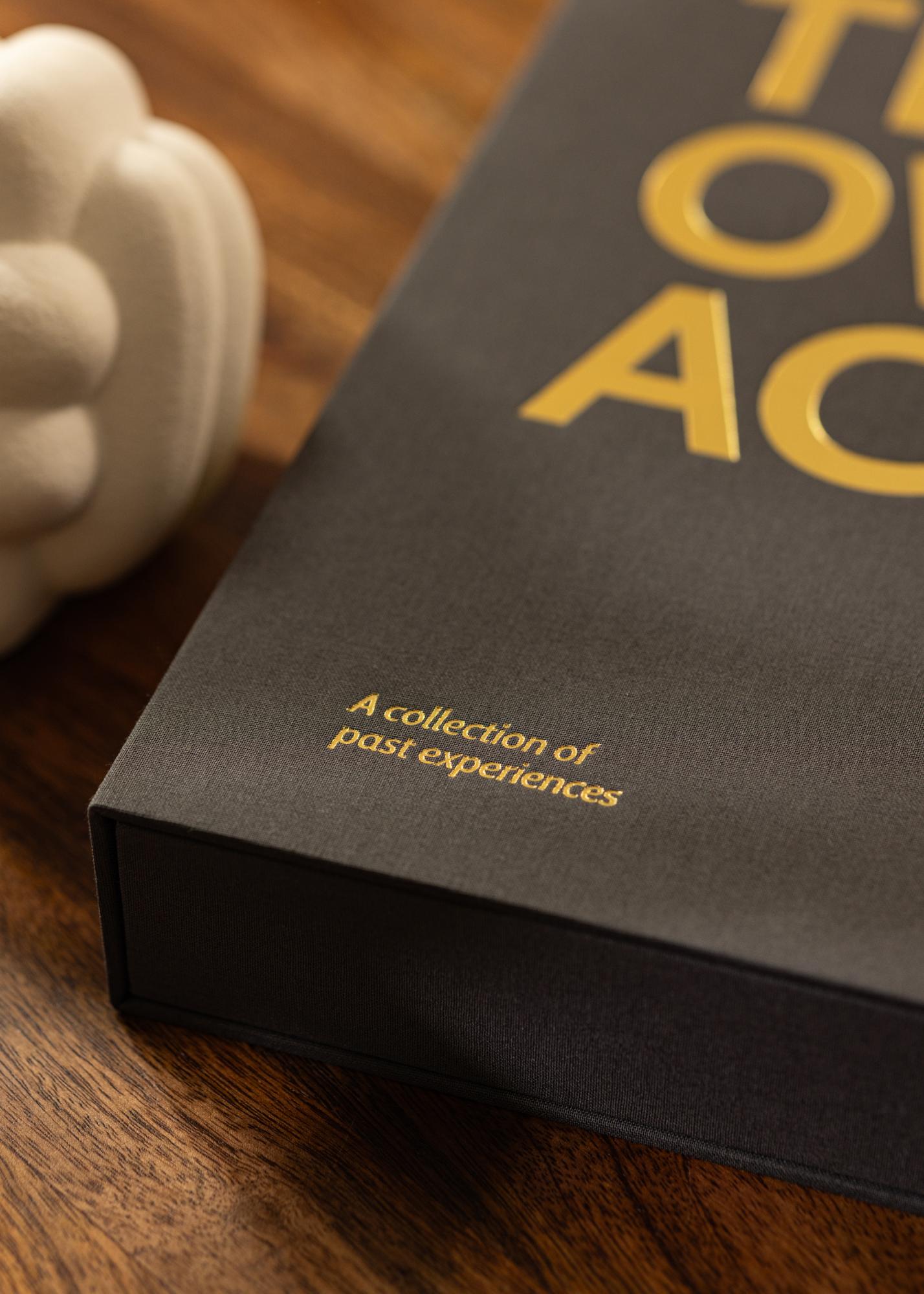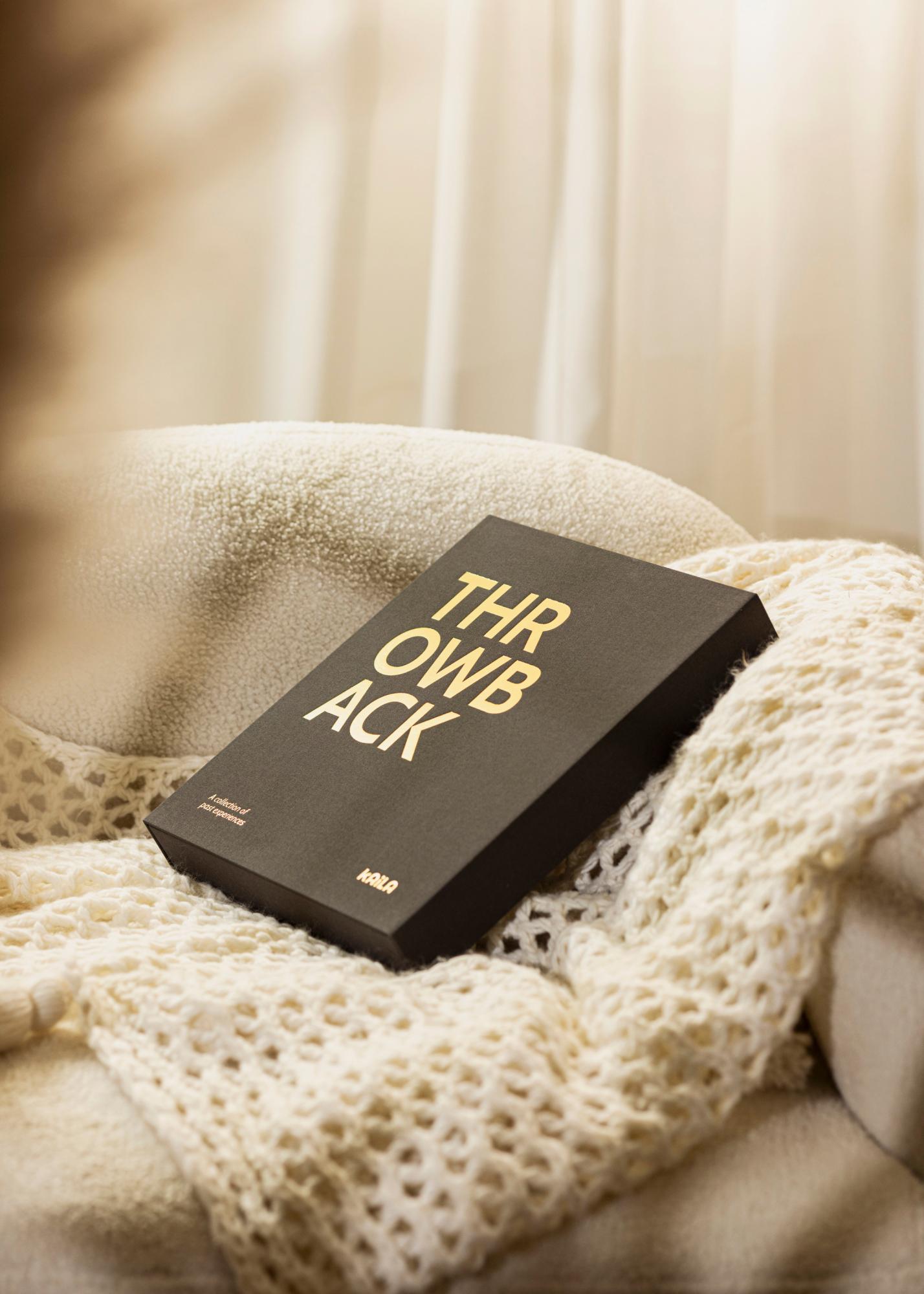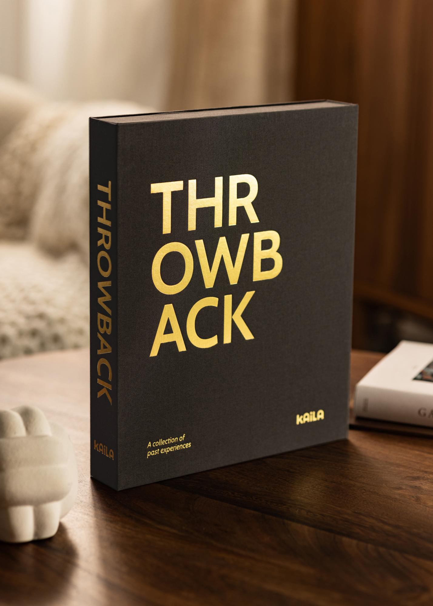 Este es un álbum de fotos en tendencia que está lujosamente empaquetado como un elegante libro Coffee Table, también conocido como Álbum de Fotos Coffee Table. El álbum de fotos está diseñado como una exclusiva caja que se abre para acceder al contenido. La cubierta está elegantemente vestida con tela negra y una impresión dorada con el texto "THROWBACK" adorna tanto la portada como el dorso del álbum. Este concepto familiar de retrospectiva le da al álbum de fotos una sensación moderna y un poco atrevida, ya que realmente se diferencia de los estilos clásicos de álbumes. El álbum también tiene un subtítulo que dice "Una colección de experiencias pasadas" impreso en la esquina inferior izquierda.
