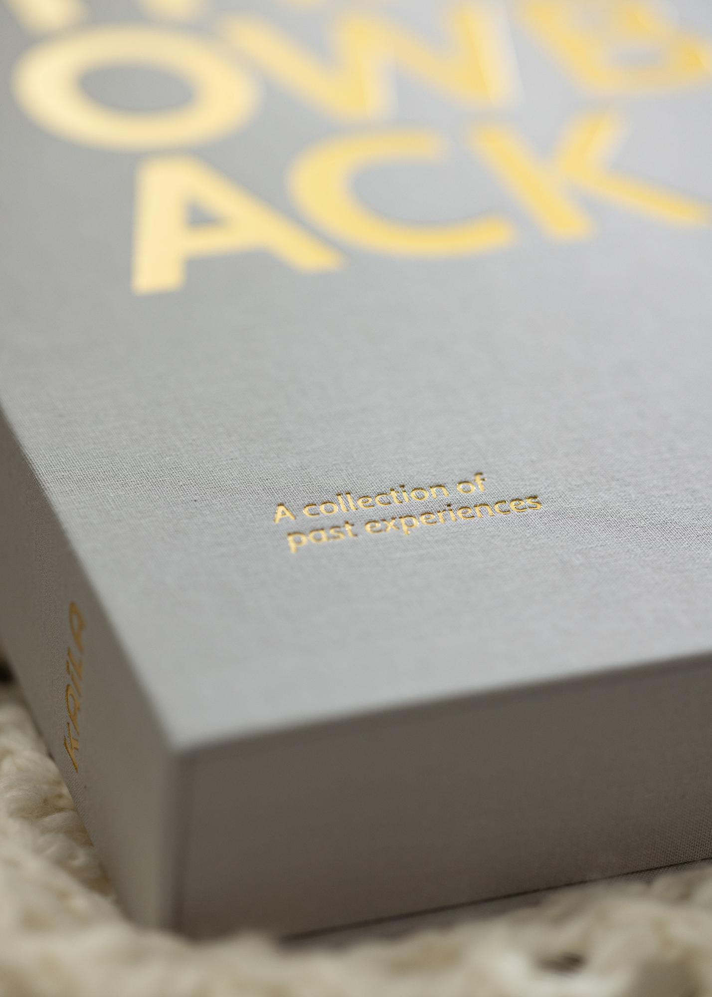 El álbum está elegantemente vestido con tela gris y en su portada y dorso hay una impresión dorada con el texto "THROWBACK". El título del álbum también se complementa con el subtítulo "Una colección de experiencias pasadas" impreso en la esquina inferior izquierda.